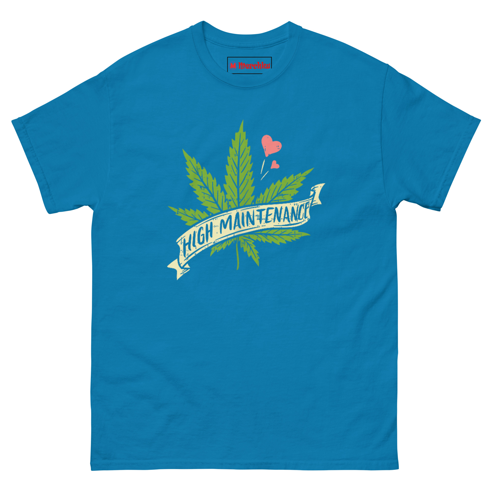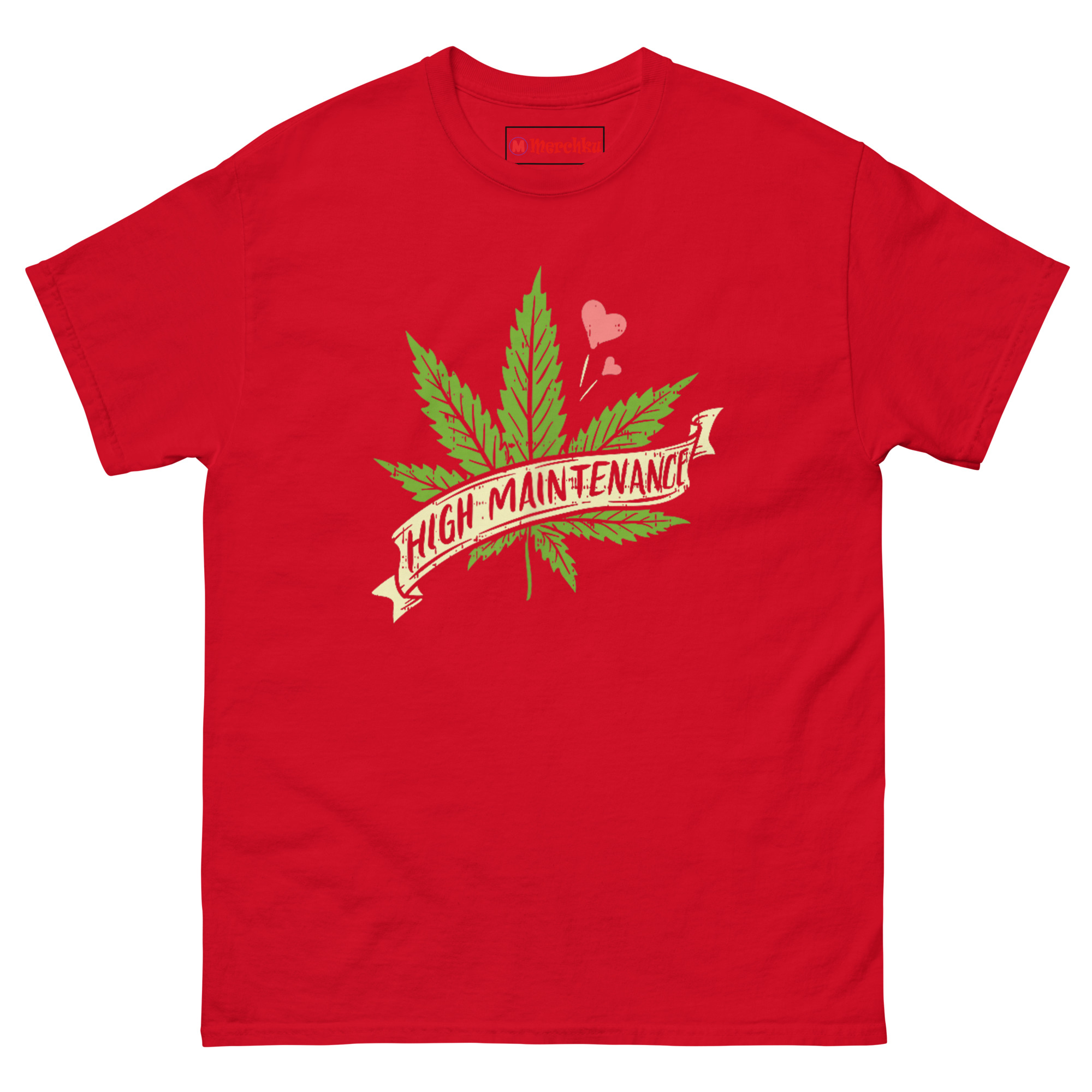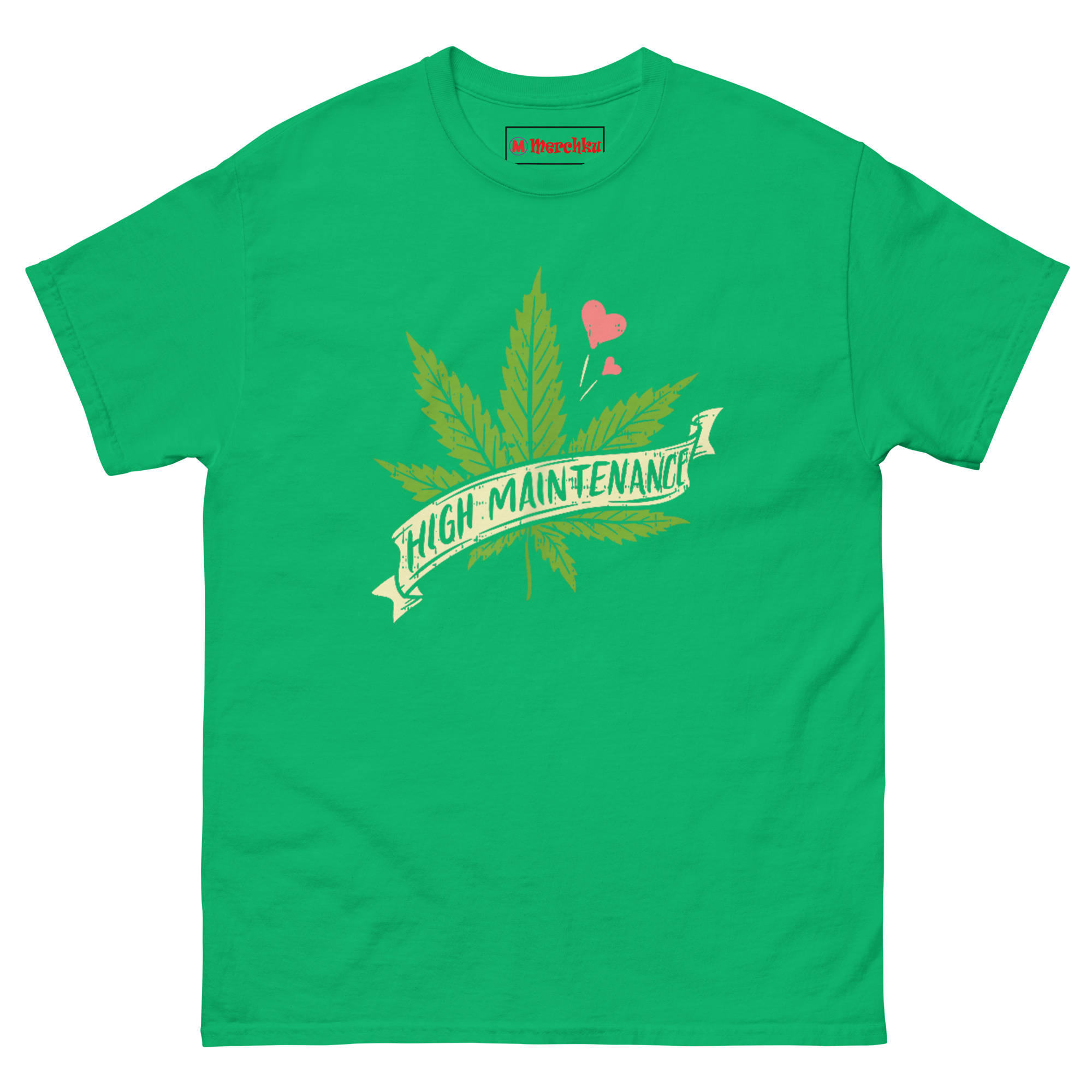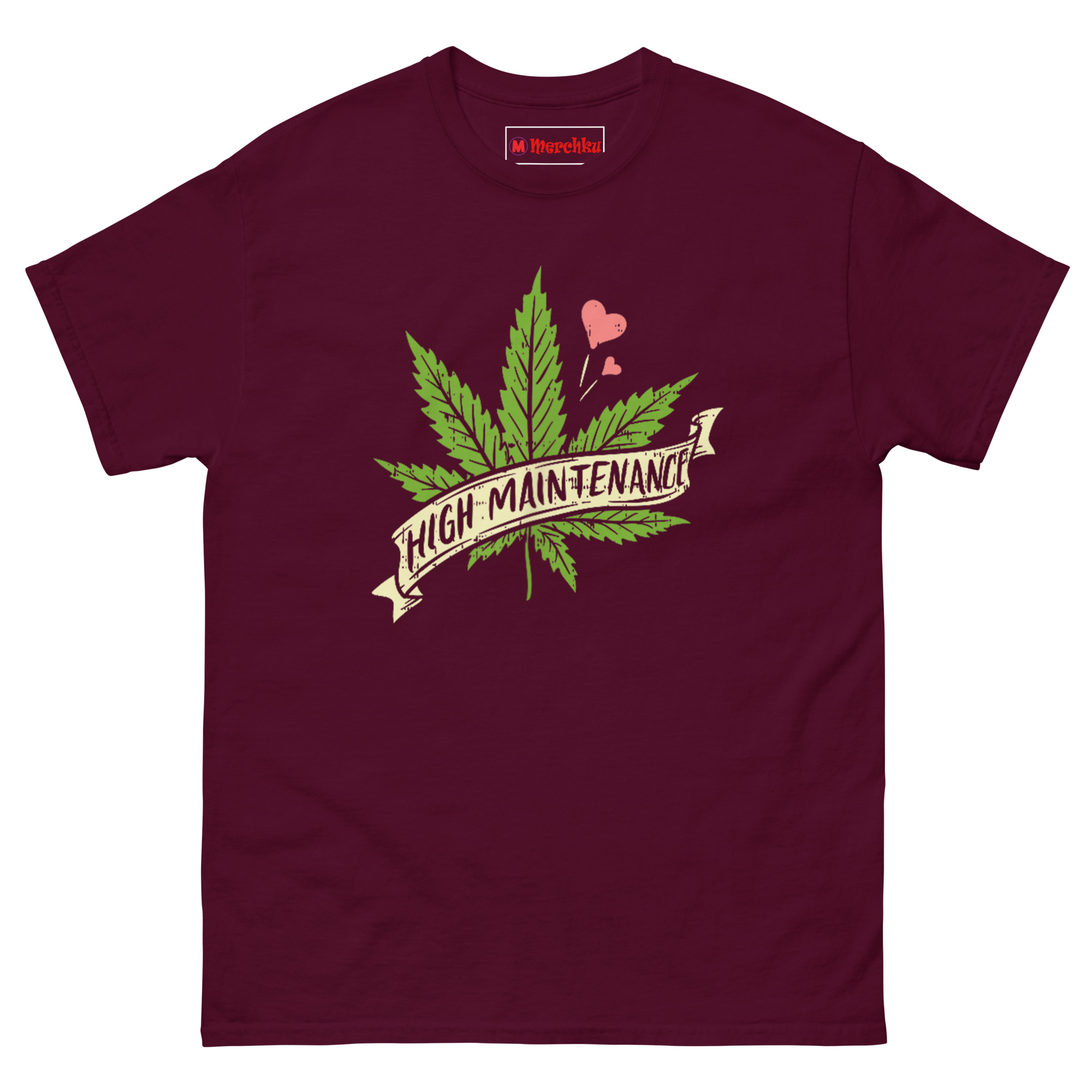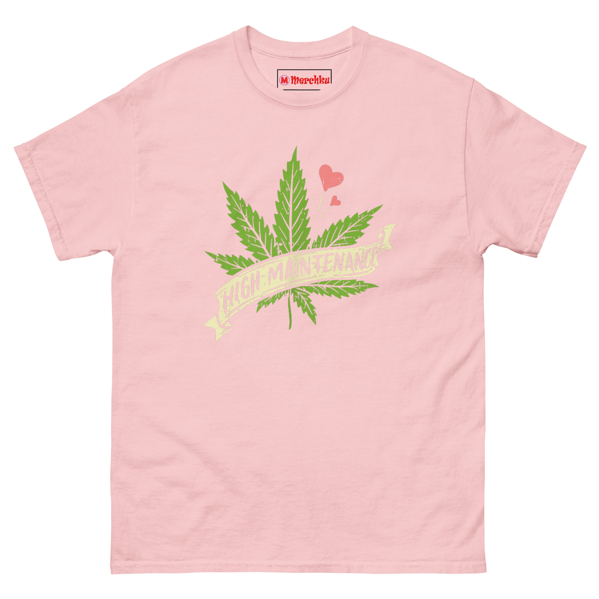 The High Maintenance Weed T Shirt pairs a hand-drawn cannabis leaf with a vintage banner ribbon and three tiny pink hearts floating nearby. It’s designed for women who embrace the 420 lifestyle unapologetically, appreciate botanical art, and know that self-care sometimes means setting high standards for everything, including their wardrobe.