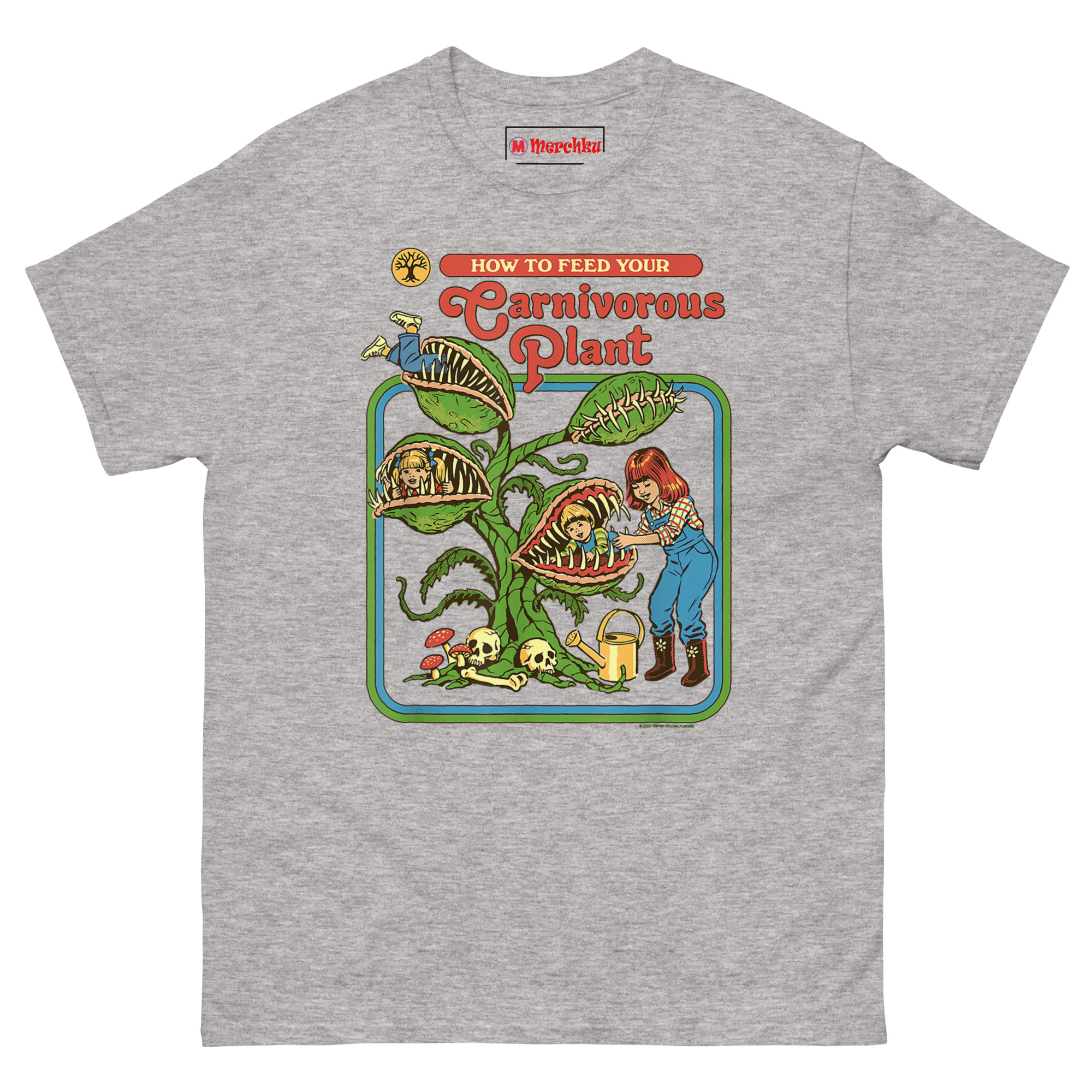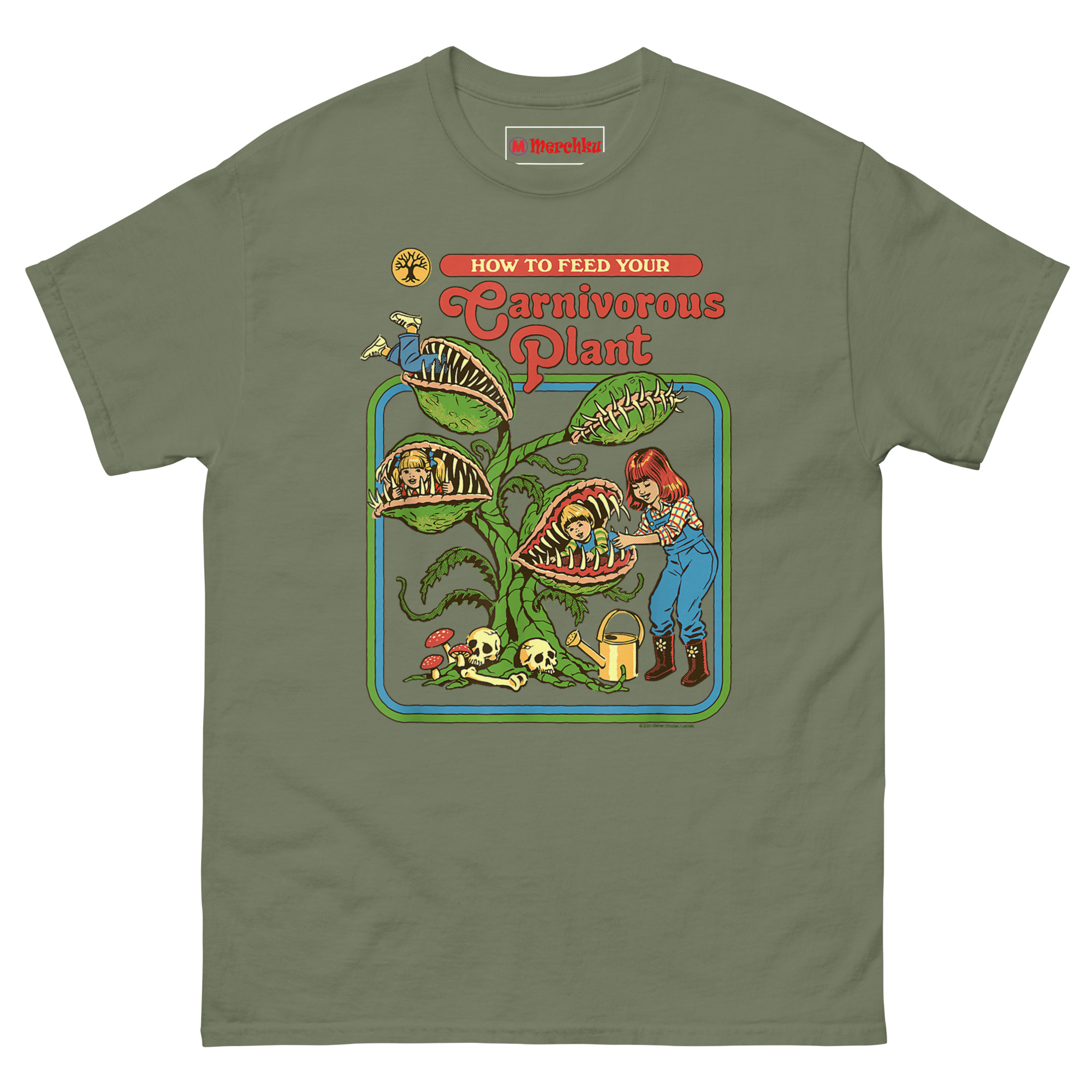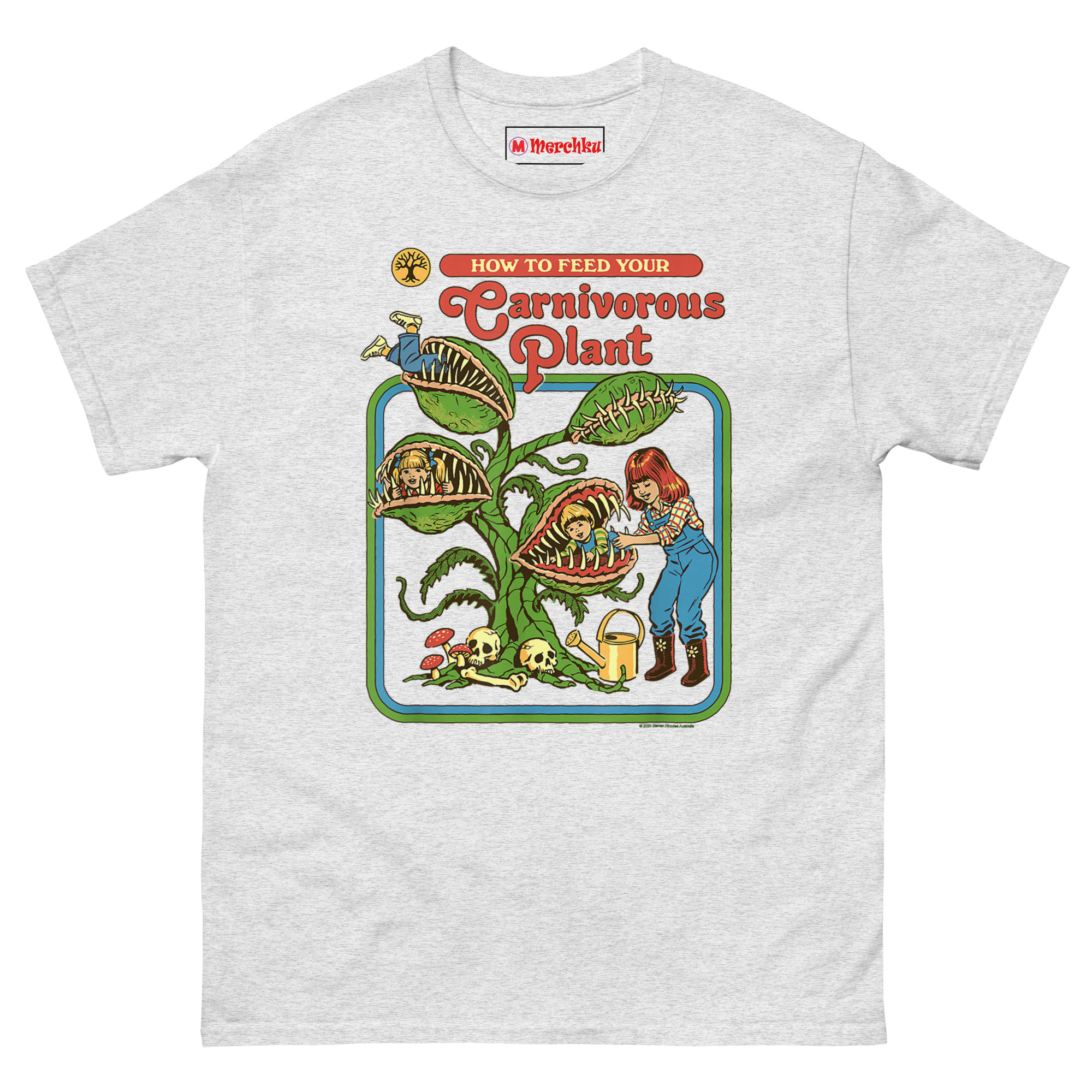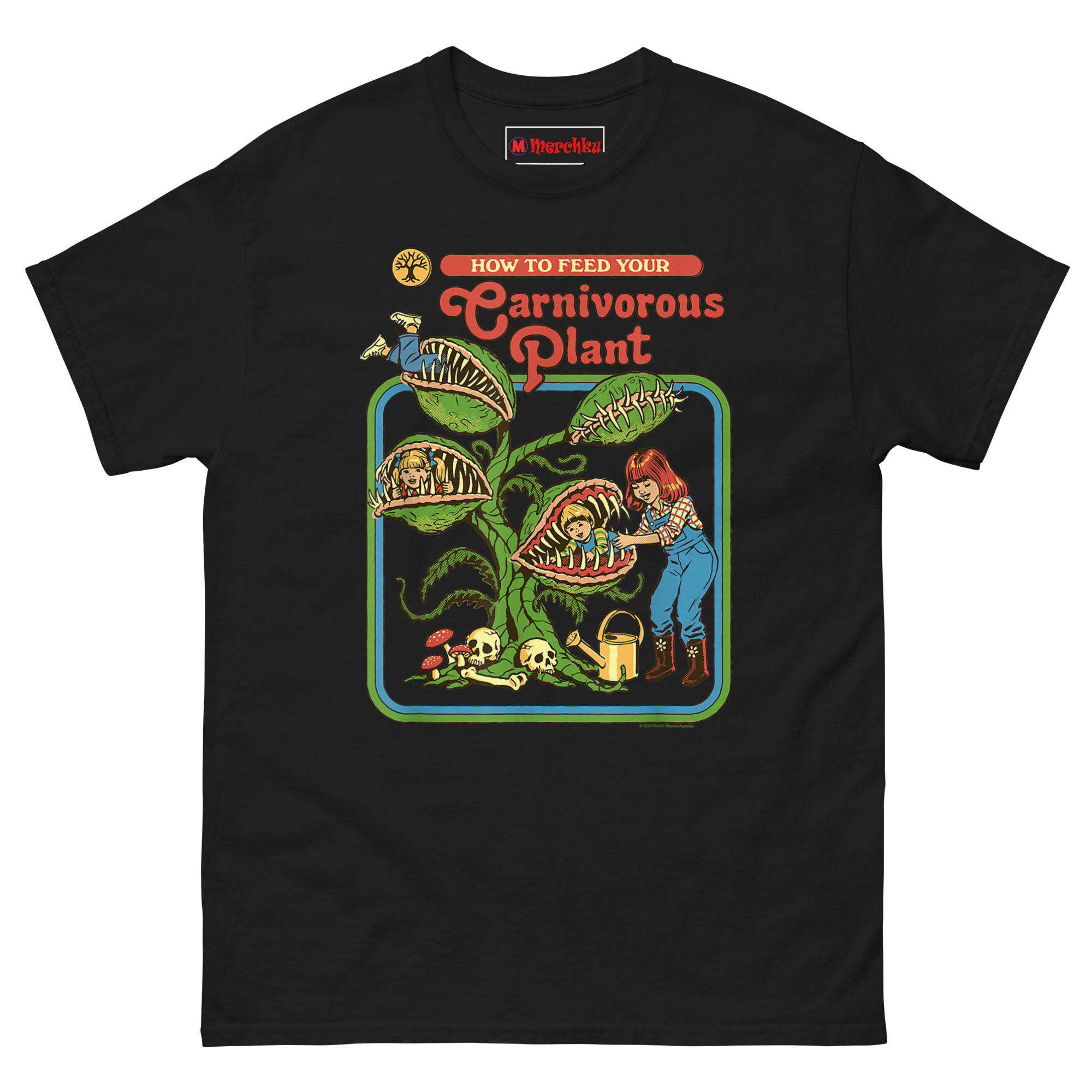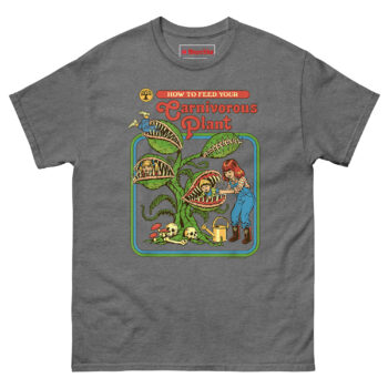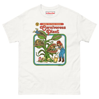 How to Feed Your Carnivorous Plant T Shirt idea came from a conversation about how we teach children about the natural world. Vintage activity books and educational materials from the 1970s had a very distinct look bright colors, smiling characters, and a wholesome, instructional tone. Someone joked, “Imagine if they had been honest about carnivorous plants.” Another person laughed and said, “Step one: acquire snacks. Step two: introduce snacks to plant.”