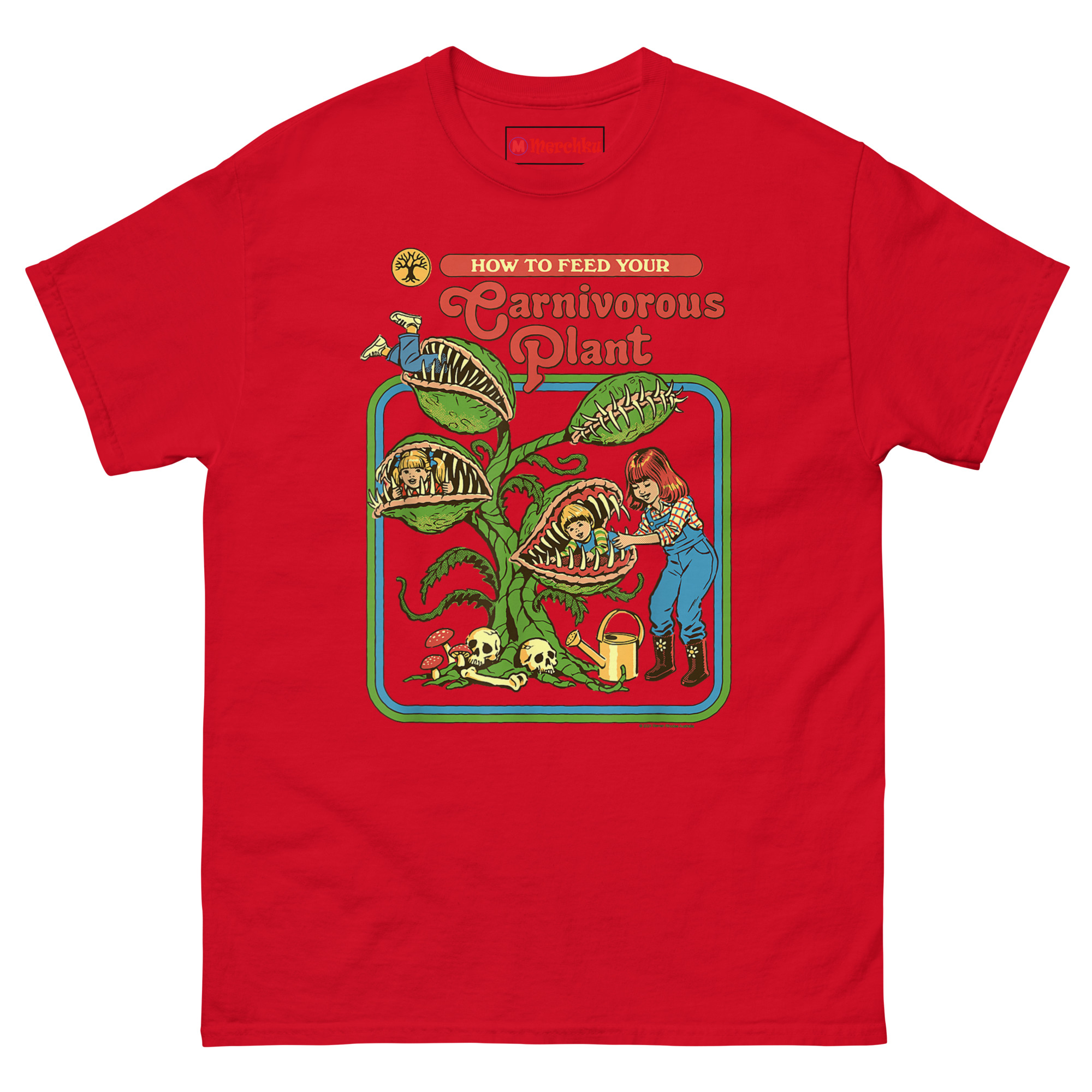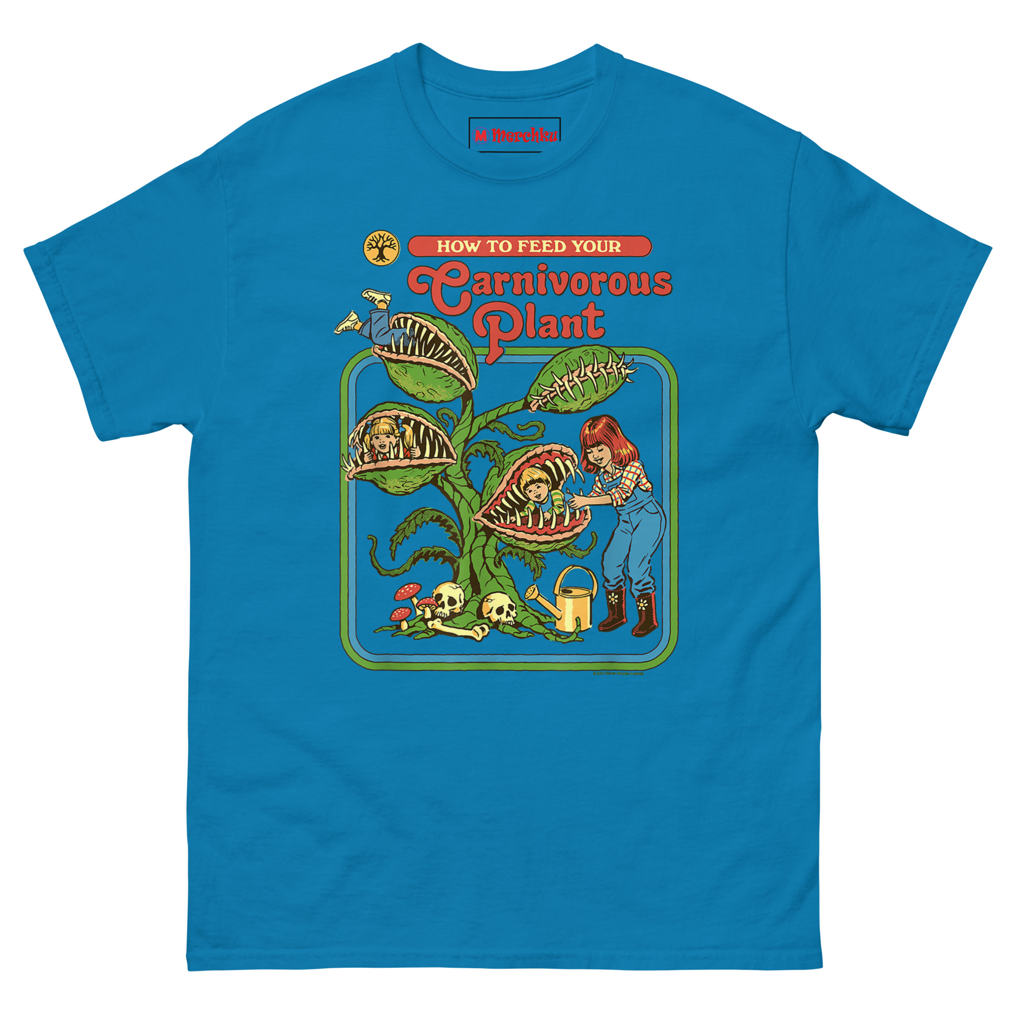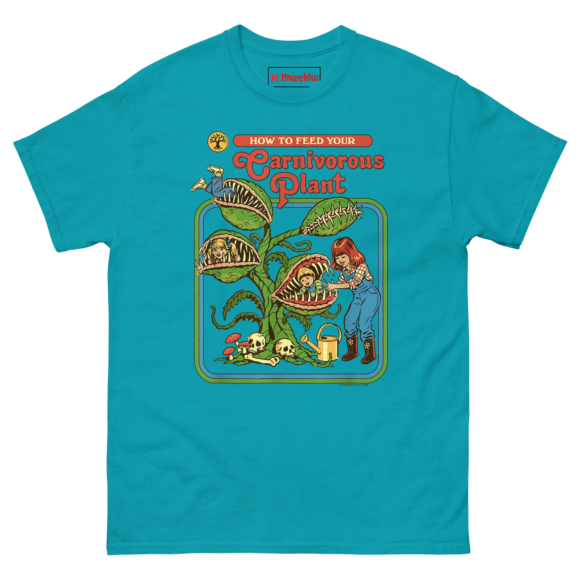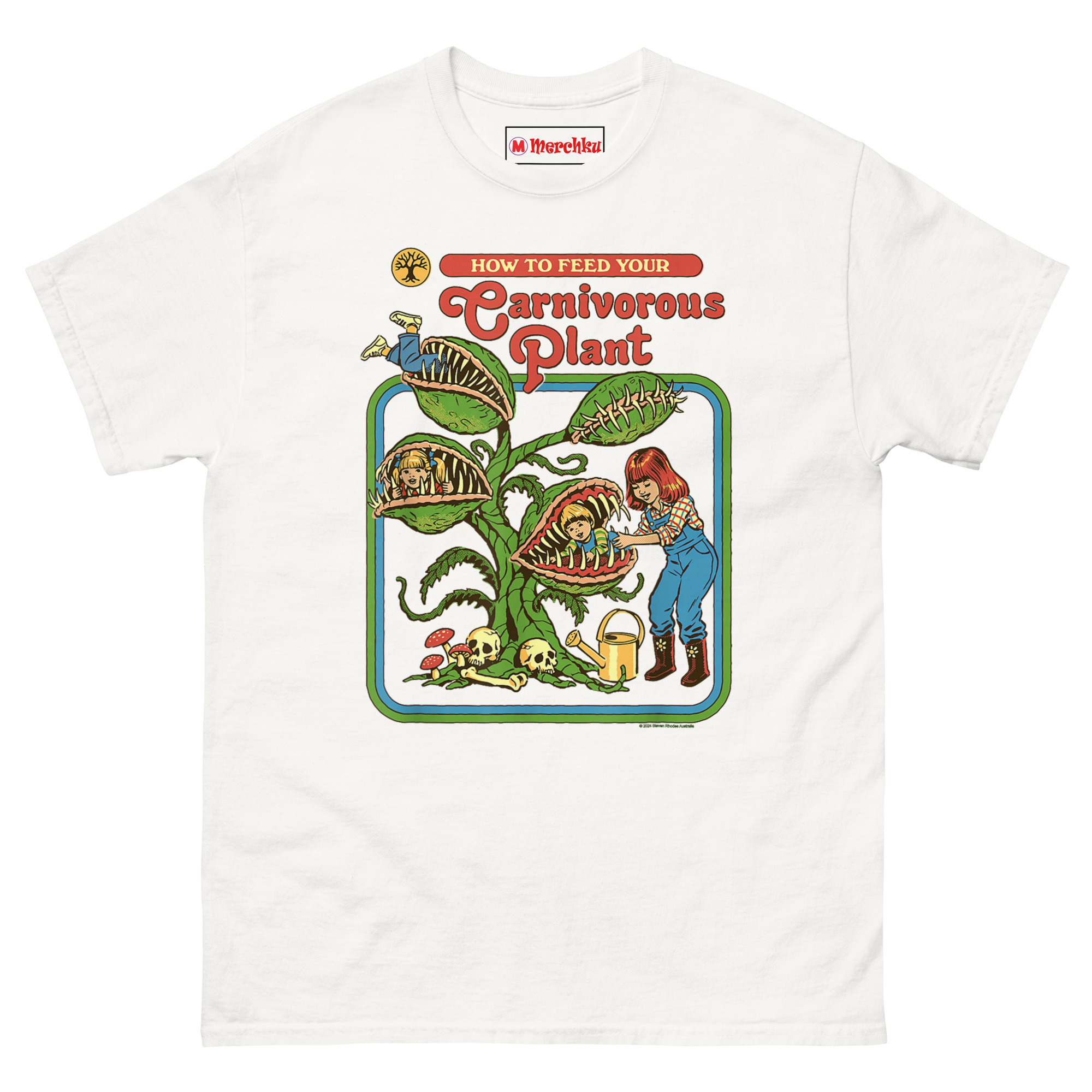 How to Feed Your Carnivorous Plant T Shirt idea came from a conversation about how we teach children about the natural world. Vintage activity books and educational materials from the 1970s had a very distinct look bright colors, smiling characters, and a wholesome, instructional tone. Someone joked, “Imagine if they had been honest about carnivorous plants.” Another person laughed and said, “Step one: acquire snacks. Step two: introduce snacks to plant.”