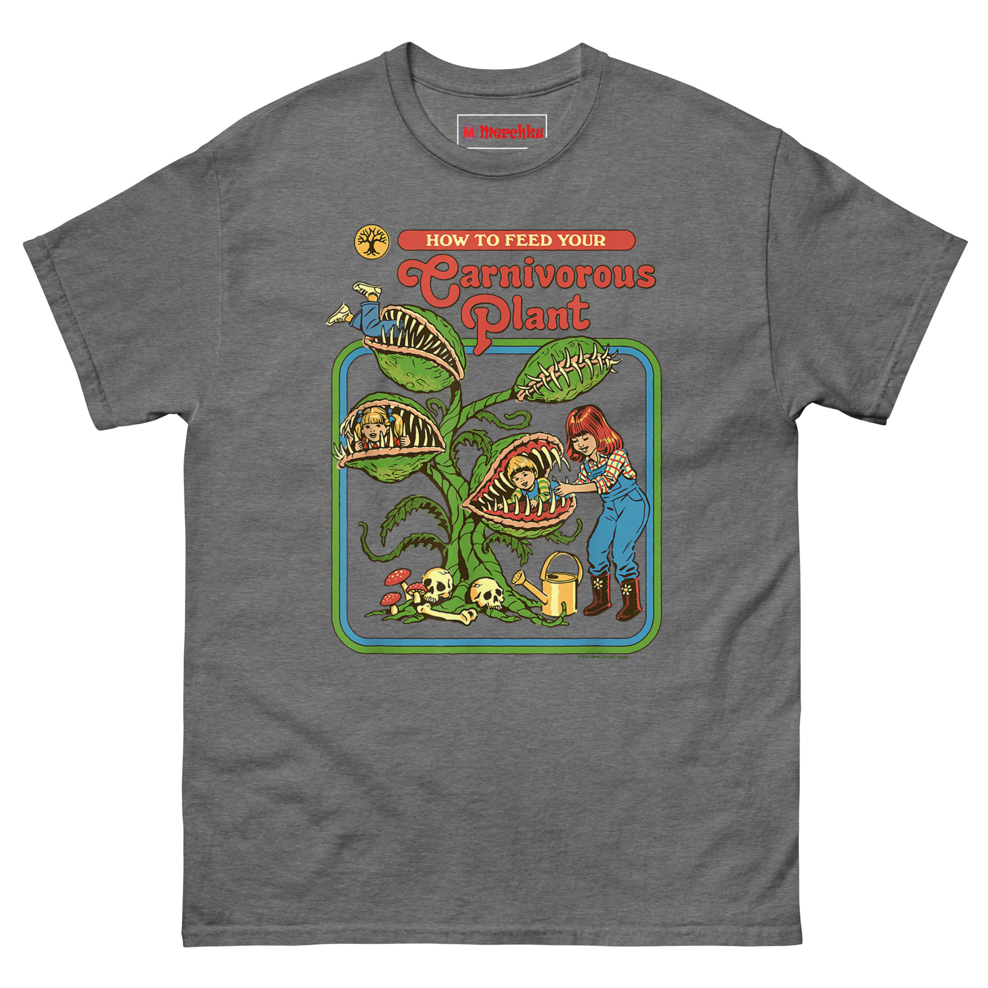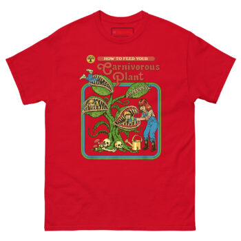 - Brilliant Dark Humor: This How to Feed Your Carnivorous Plant T Shirt design thrives on the juxtaposition of innocent 70s nostalgia and deeply morbid subject matter. It’s a hilarious, shocking conversation starter that plant lovers with a twisted sense of humor will adore.