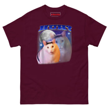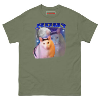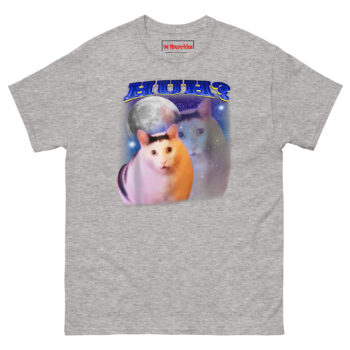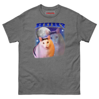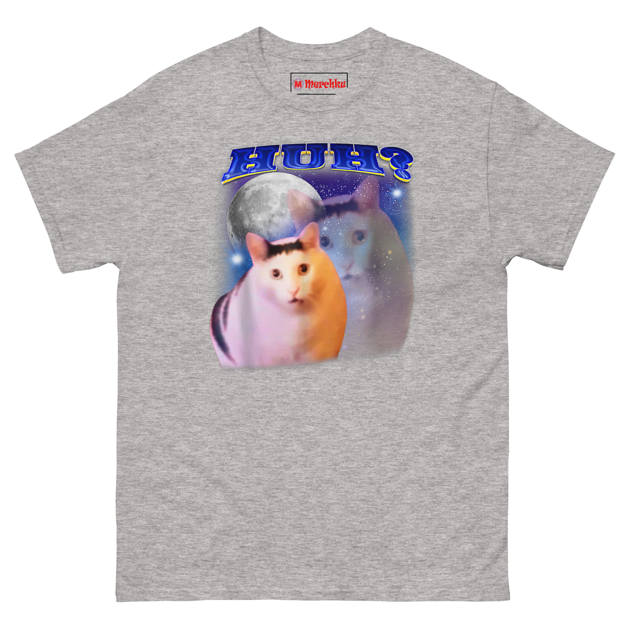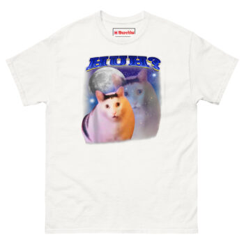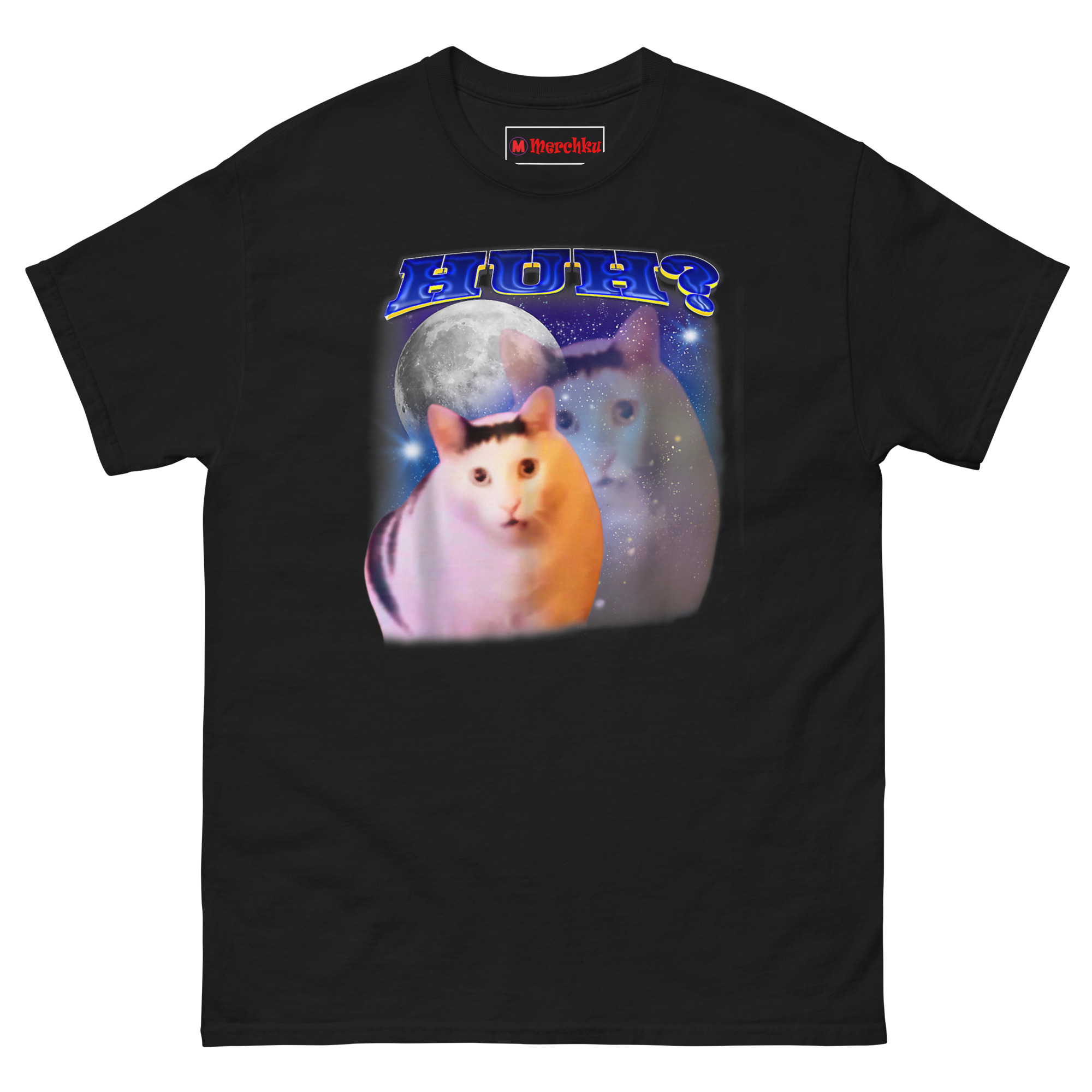 The inspiration for this Huh Cat T Shirt came from scrolling through TikTok at 2 AM. You know the feeling. You have watched so many videos that your brain stops processing language normally. Everything becomes a blur of sounds and images. And somewhere in that haze, you see that cat. The white cat with the black spot on its forehead, looking completely bewildered. People use it as a reaction image for moments of pure confusion. It is the visual equivalent of the dial-up sound. We wanted to take that energy and put it in a cosmic context. Because on the internet, a confused cat is not just a cat. It becomes a universal symbol. The 3D chrome lettering and the deep-space nebula background borrow heavily from 90s rap merch. That era was all about larger-than-life imagery and bold graphics. By blending that style with a modern meme, we created something that feels both nostalgic and fresh. This shirt is for the chronically online, the meme archivists, and anyone who has ever responded to a text with just a picture of this cat.