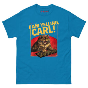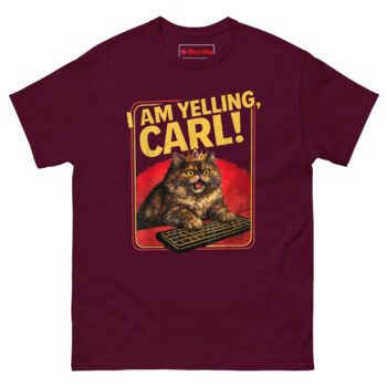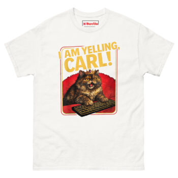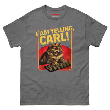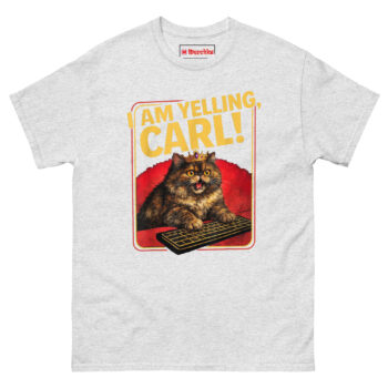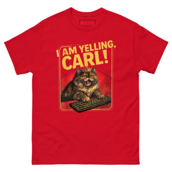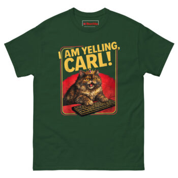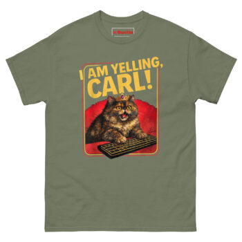 The I Am Yelling Carl T Shirt perfectly captures that moment when your patience runs out and a furious feline says what everyone’s thinking. It features a crowned cat screaming at a keyboard, framed in a vintage poster style with bold yellow text. Designed for office workers, tech support heroes, and anyone who’s ever dealt with a frustrating coworker named Carl, this shirt turns workplace rage into wearable comedy.