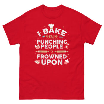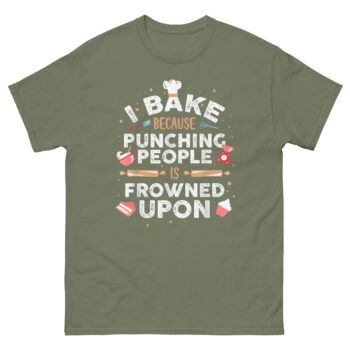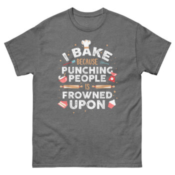 We designed I Bake Because Punching People Is Frowned Upon T Shirt for the person who’s learned that a good loaf of bread is more satisfying than a confrontation. You understand the feeling. Someone irritates you, so you go home and aggressively knead some dough. By the time it rises, you’ve risen above whatever was bothering you. And now there’s cake.