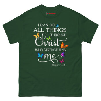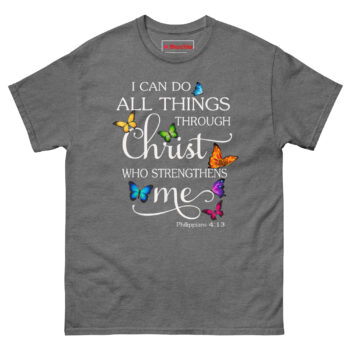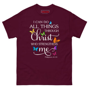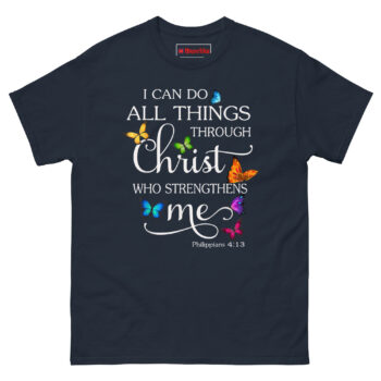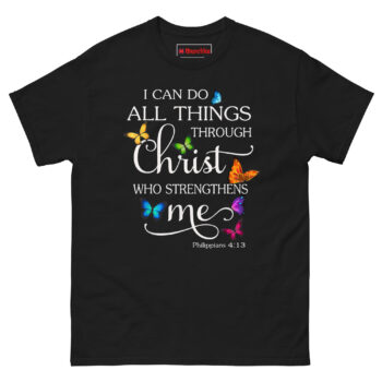 The I Can Do Anything Through Christ Shirt turns one of the most powerful Bible verses into a beautiful, wearable piece of art. Made from 100% cotton, this tee features the full Philippians 4:13 scripture with elegant typography and seven photorealistic butterflies in vibrant colors that appear to rest right on the fabric. It’s a Philippians 4:13 Butterfly Christian Graphic Tee and a Religious Faith Gift for Mom Daughter Sister who draws strength from her beliefs. Wear I Can Do Anything Through Christ Shirt to church, small group, or anywhere you need a reminder of His power.