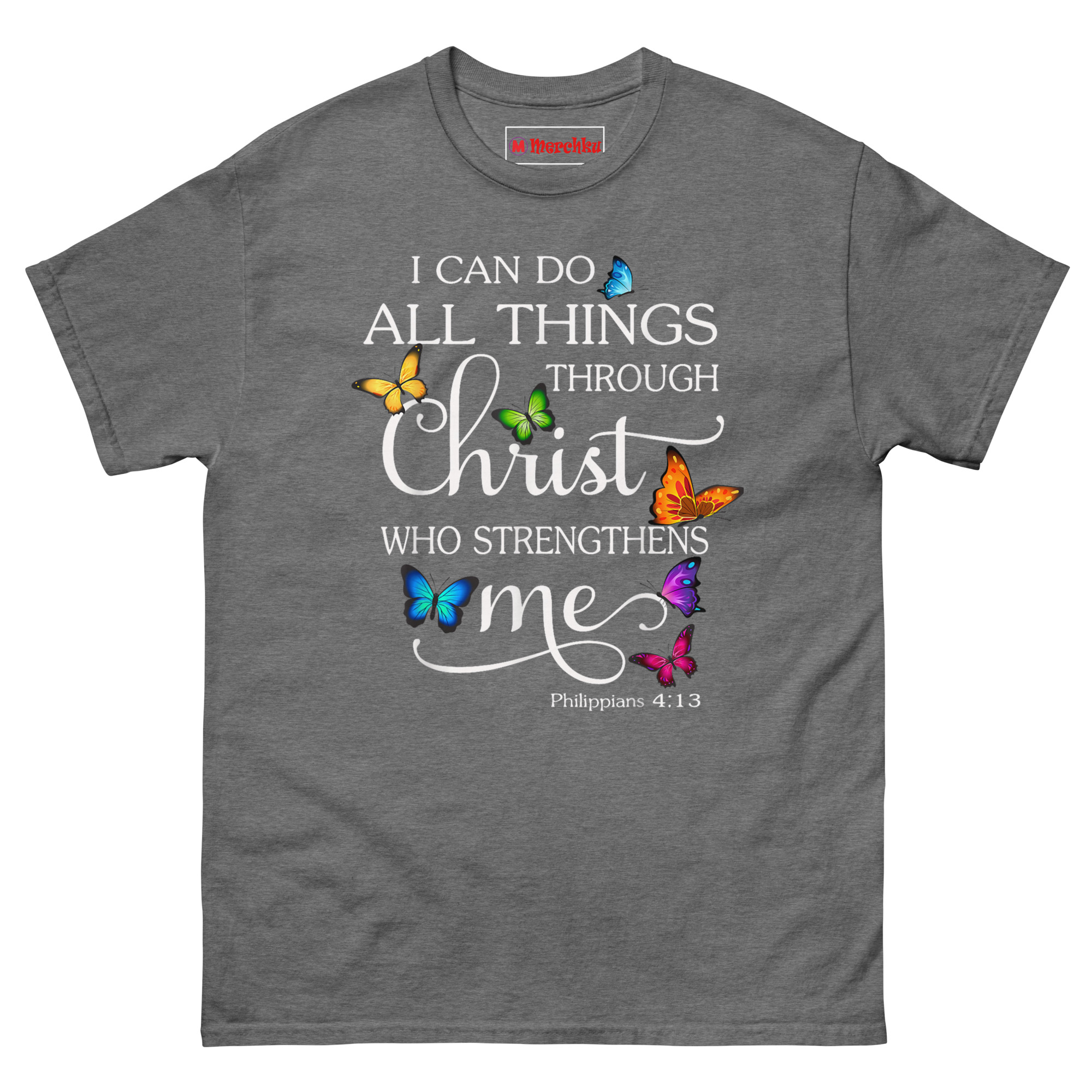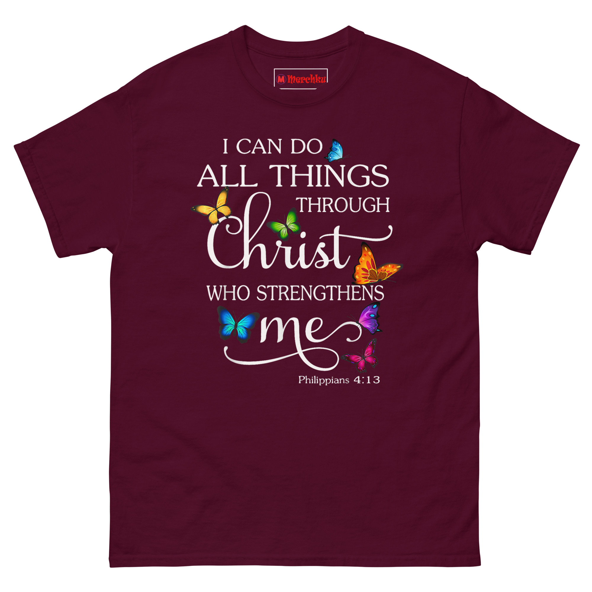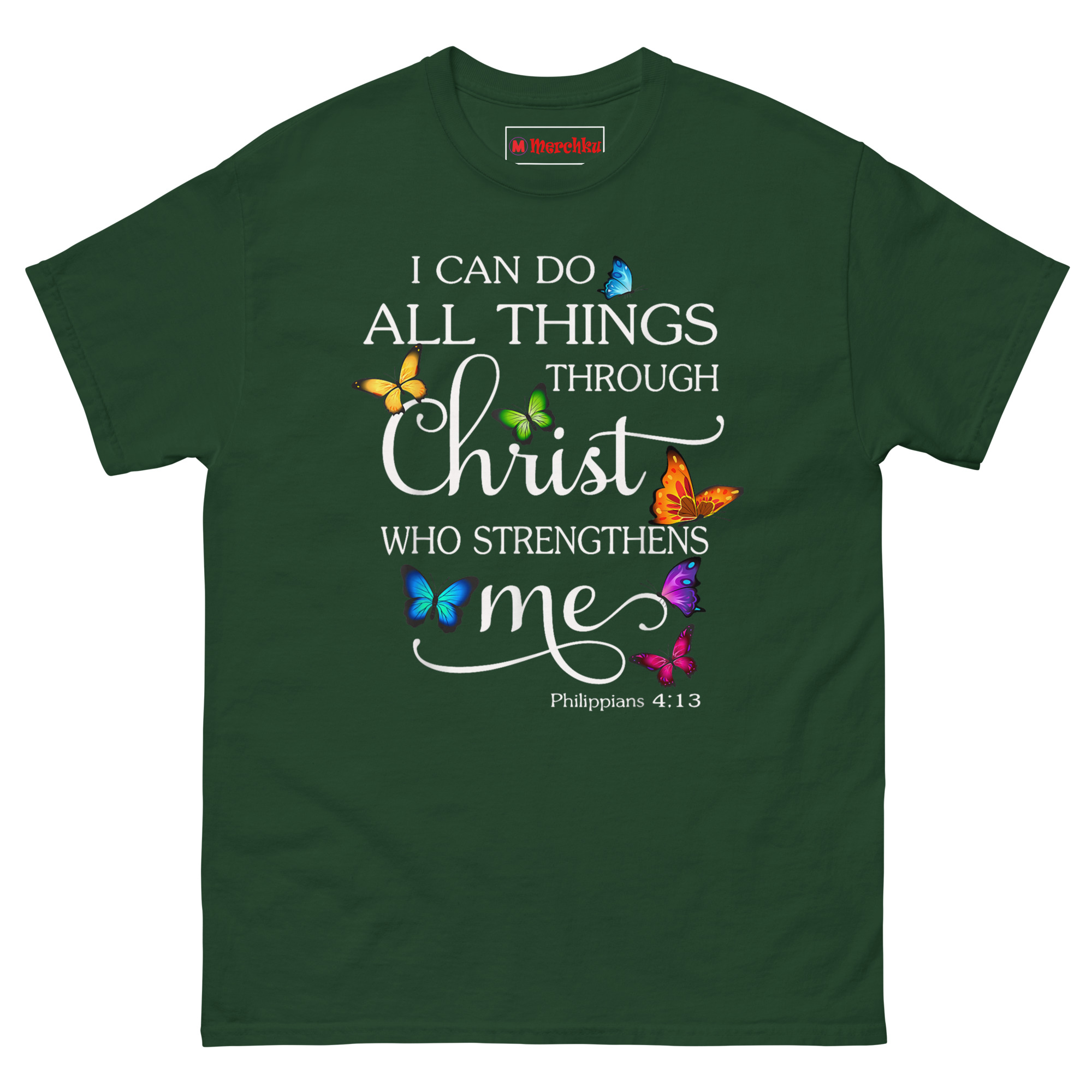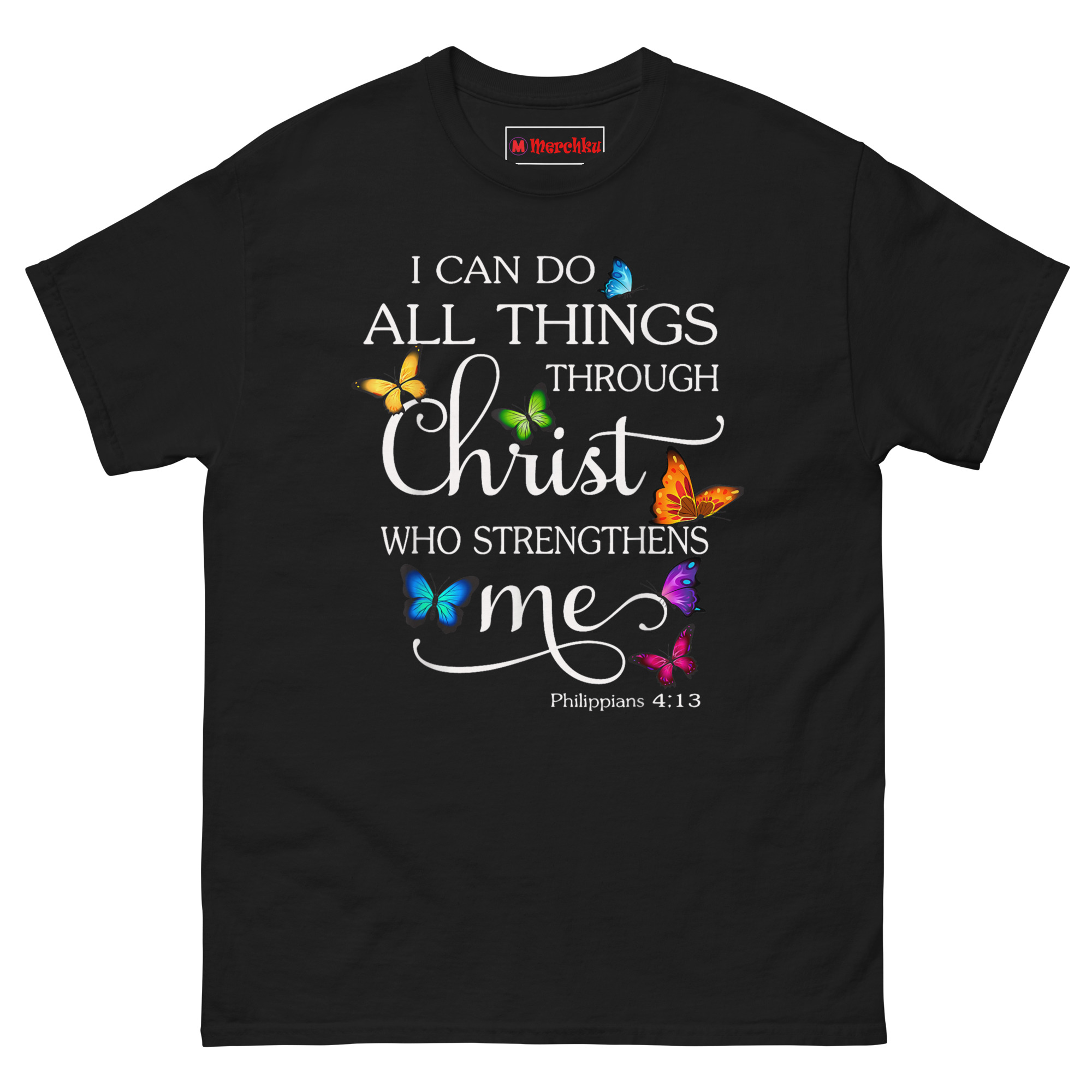 That image, transformation through faith, became the foundation of this design. The scripture reads clearly: “I CAN DO” and “THROUGH” in clean white Serif font. The word “Christ” stands out in large elegant script with flowing flourishes. “WHO STRENGTHENS” sits in bold sans-serif, while “me” appears in graceful lowercase cursive with an extended decorative underline. The verse citation “Philippians 4:13” rests subtly at the bottom. Seven vibrant photorealistic butterflies in blue, yellow, green, orange, purple, pink, and teal surround the text. Each one has a subtle shadow effect, creating a 3D “resting on the fabric” appearance. This is Inspirational Christian apparel for women who want their faith on display with beauty and dignity.