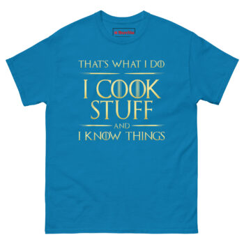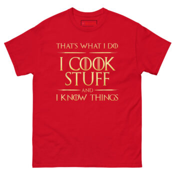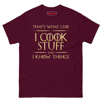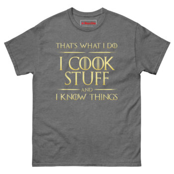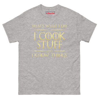 Click Add To Cart to buy your I Cook Stuff And I Know Things T Shirt and let everyone know that in your kitchen, winter is always coming, and it will be perfectly seared!