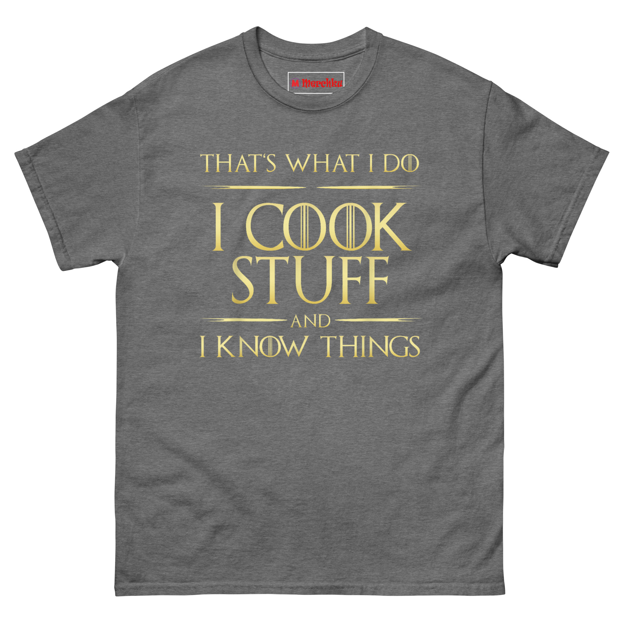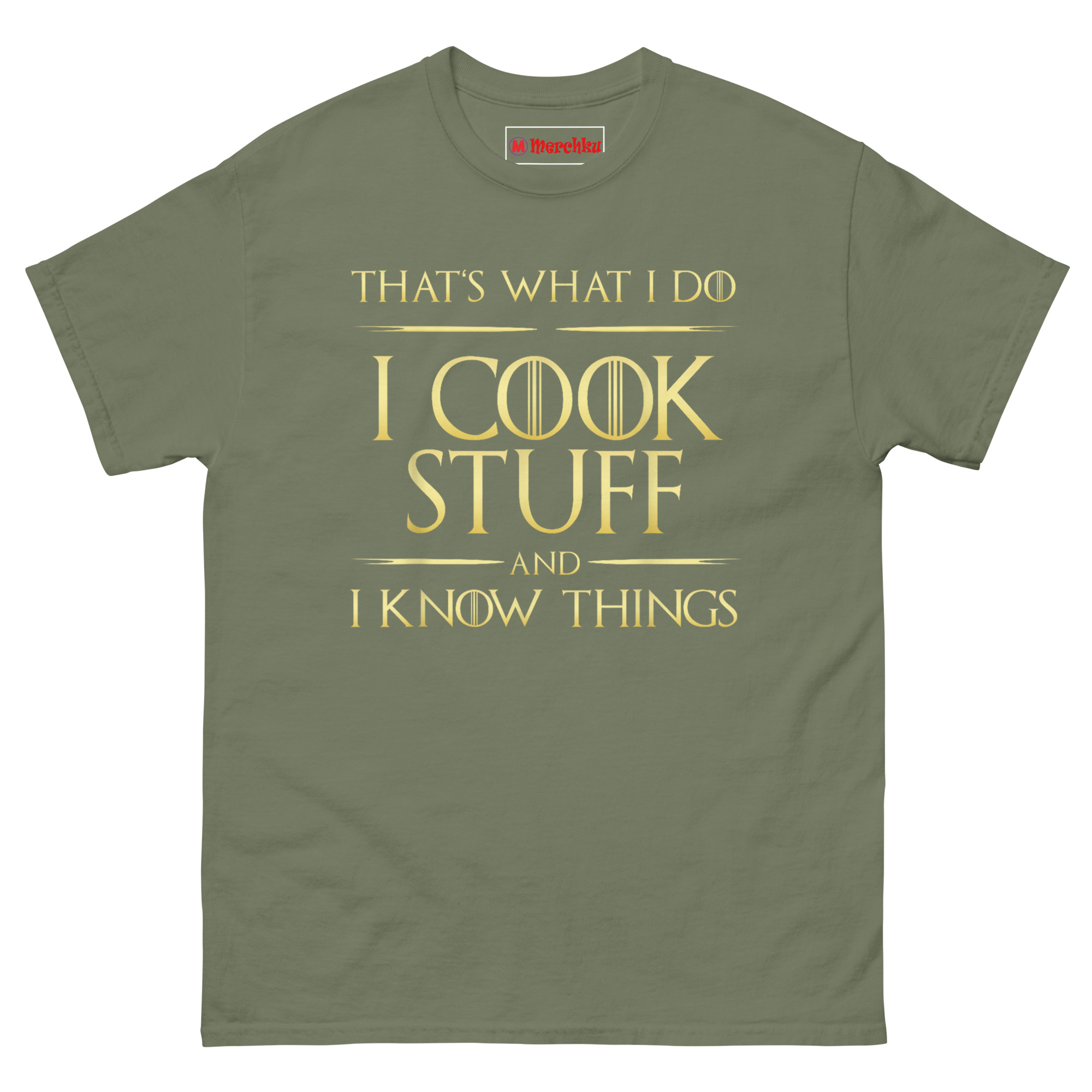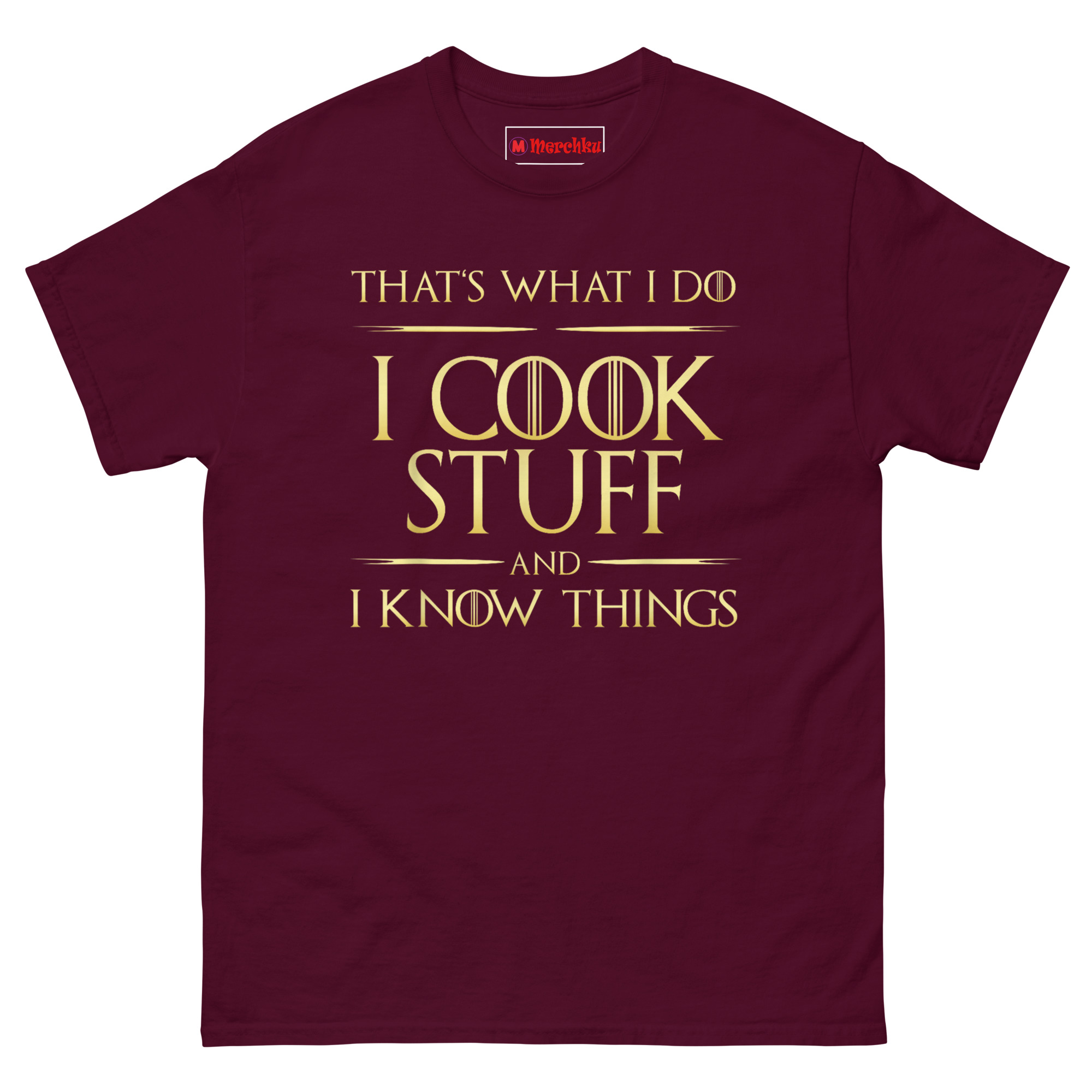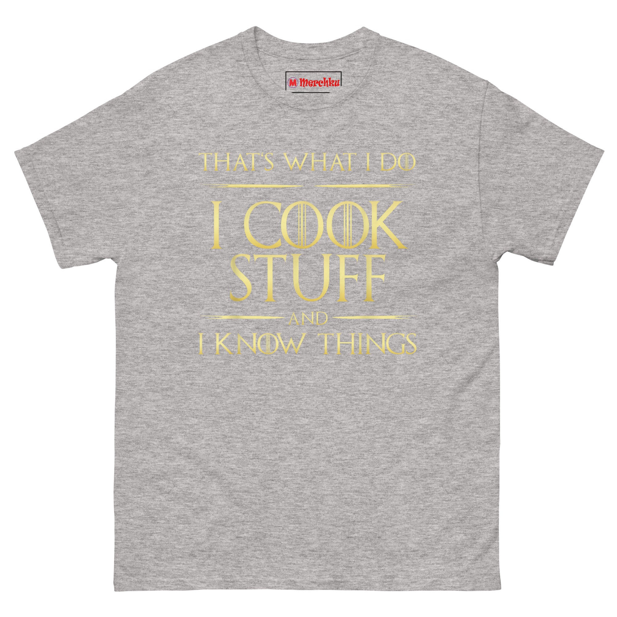 Here is a shirt for the cook who brings both heat and wisdom to the kitchen. The I Cook Stuff And I Know Things T Shirt pairs a beloved pop culture reference with a regal metallic-gold aesthetic that commands attention. It is designed for grill kings, professional sous chefs, and anyone who rules their culinary domain with skill and sarcasm.