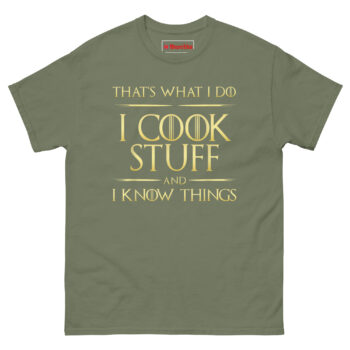 - Two Truths in One Shirt: I Cook Stuff And I Know Things T Shirt design captures the essence of every cook who has earned their stripes. It acknowledges technical skill while celebrating the wisdom that comes from years of experience. It is sarcastic cook clothing with genuine depth.