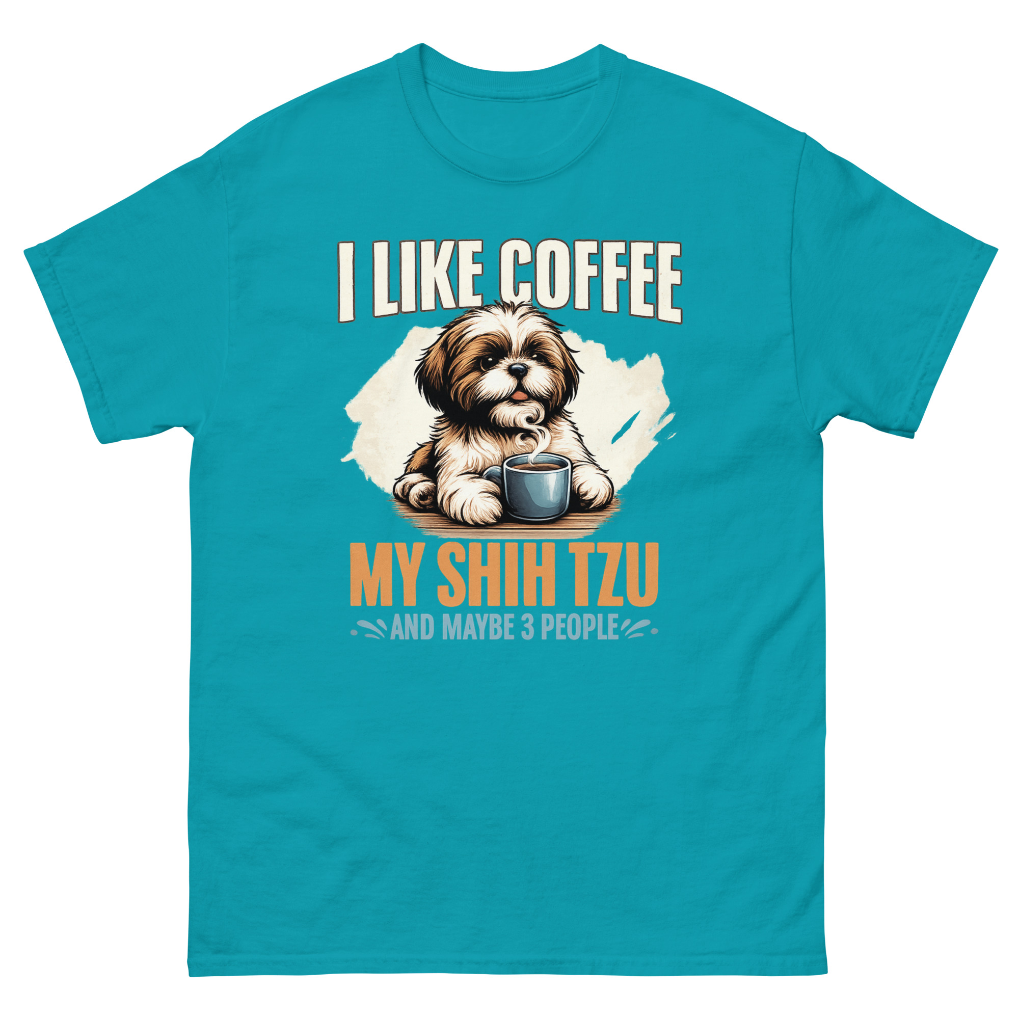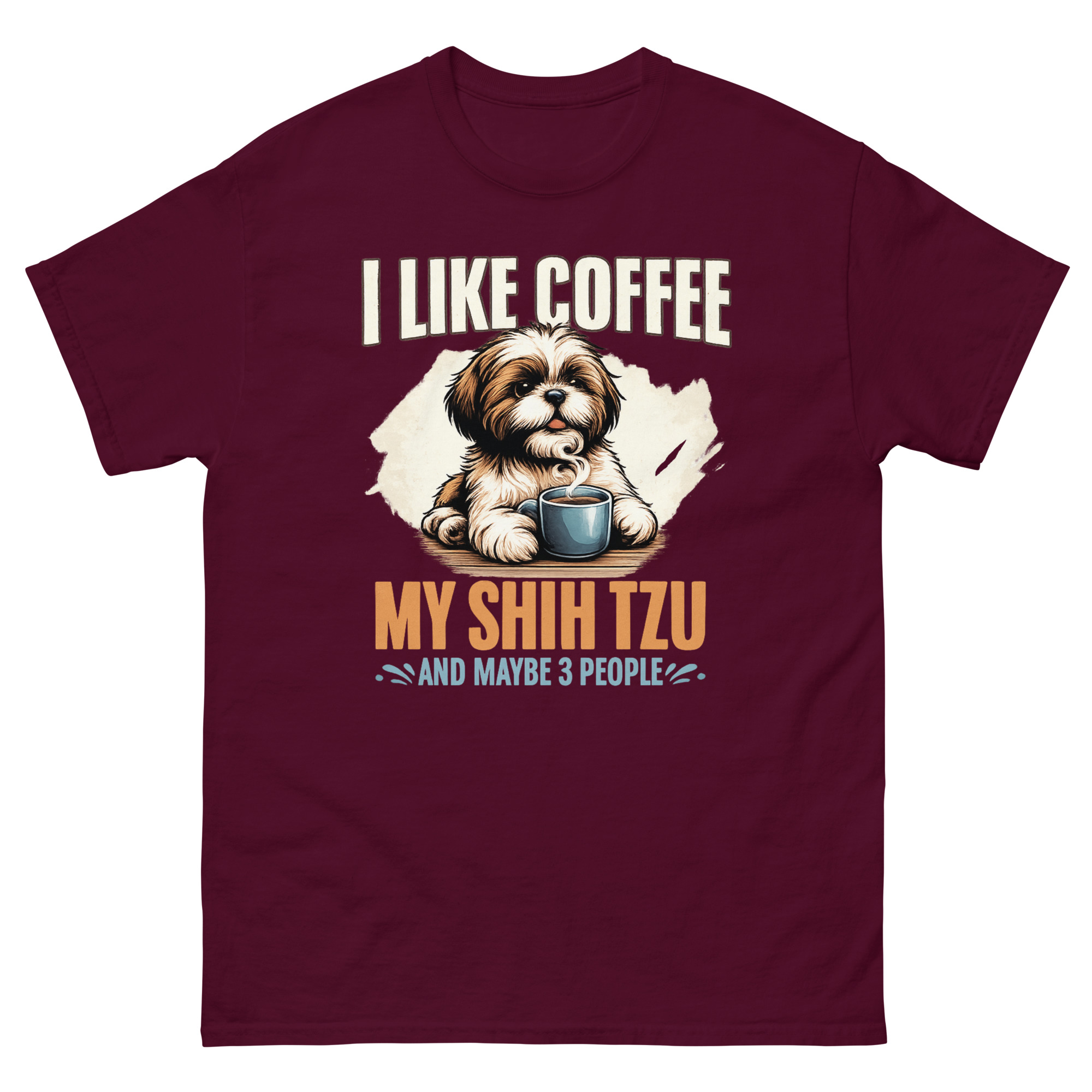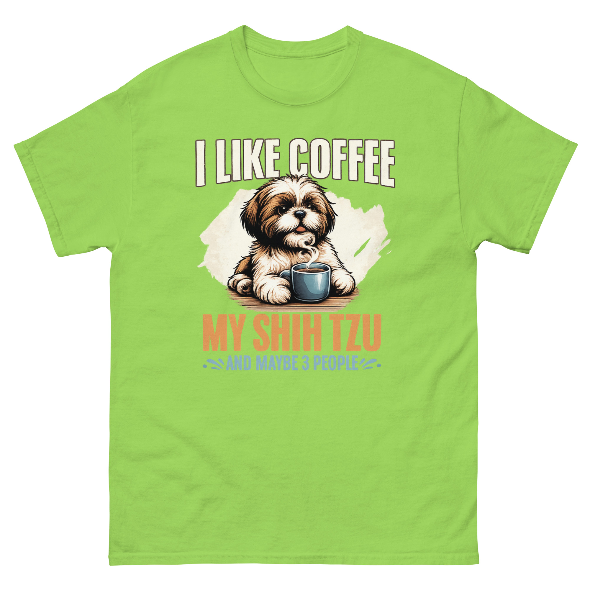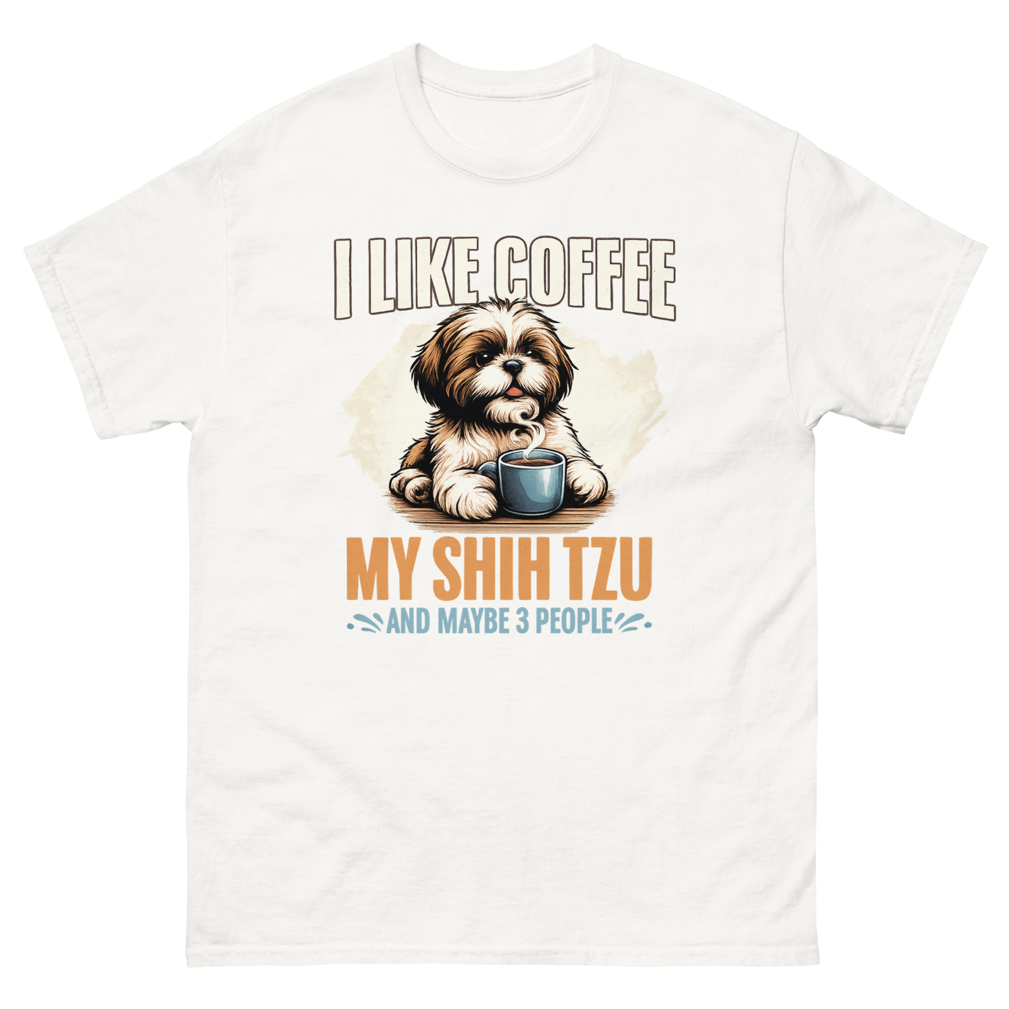 This is a beautifully illustrated graphic tee that combines three essential ingredients for a peaceful life. The I Like Coffee My Shih Tzu Maybe 3 People T Shirt features a painterly Shih Tzu peeking over a steaming coffee mug. It’s the perfect dog lover morning routine apparel for introverts who value caffeine, canine companionship, and a very short guest list.