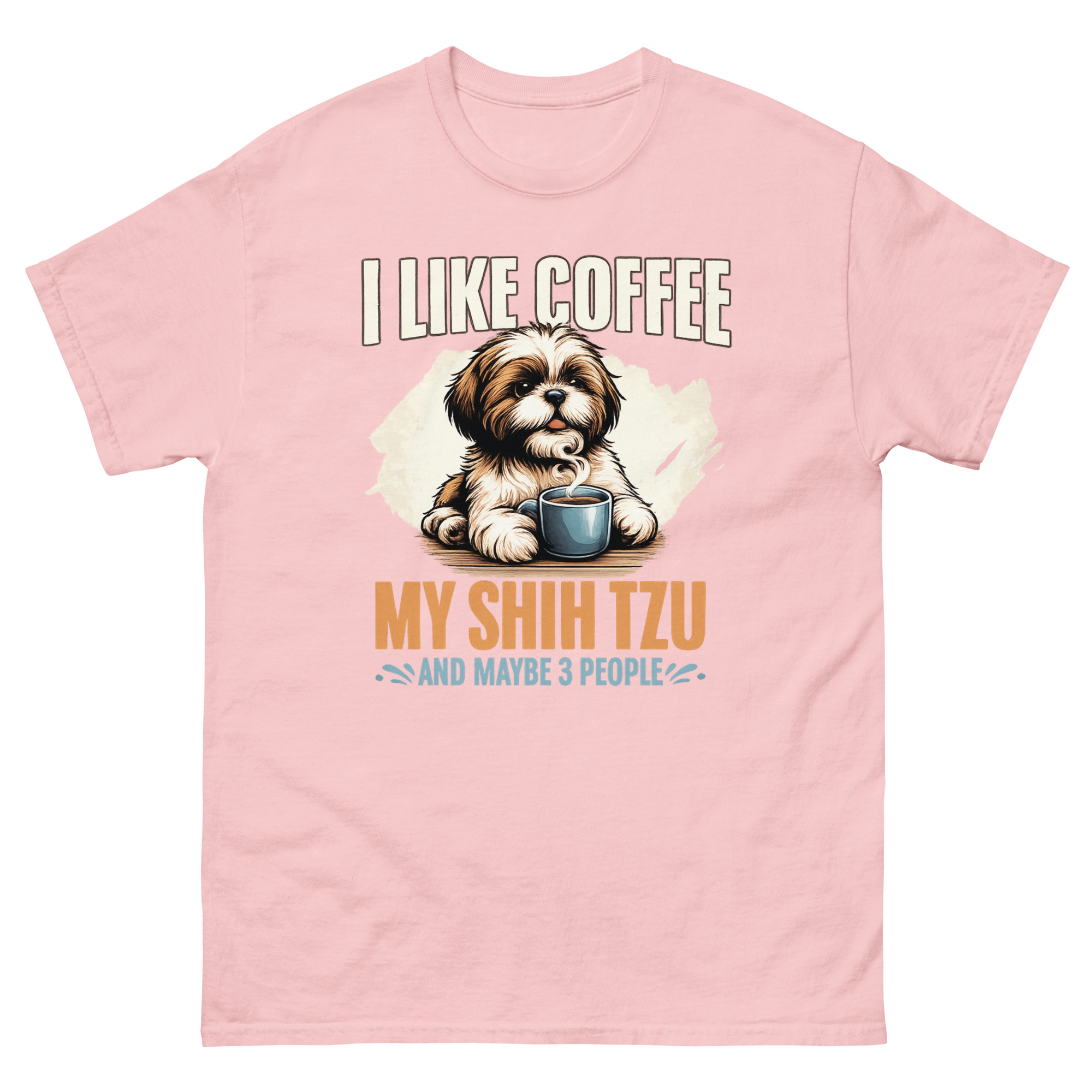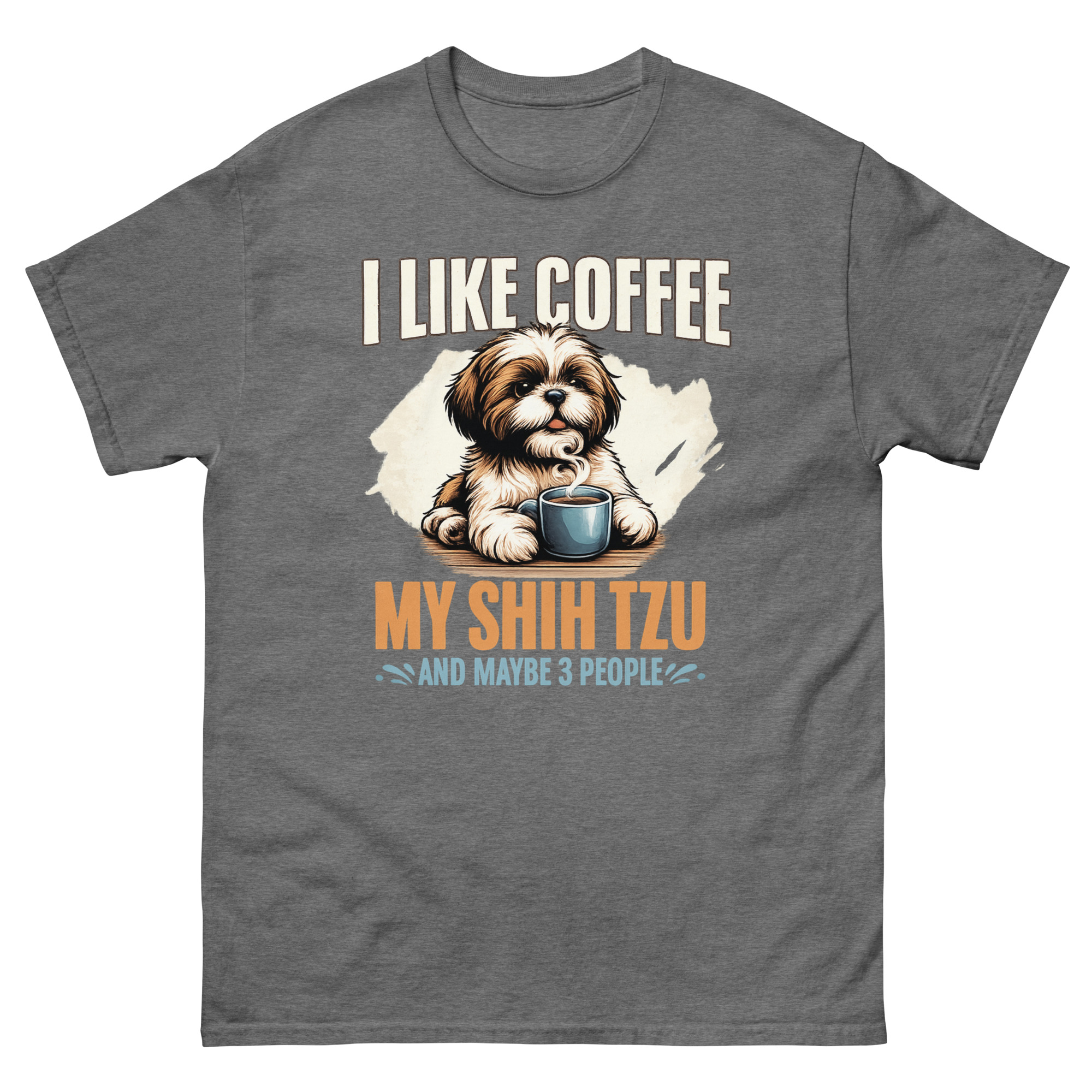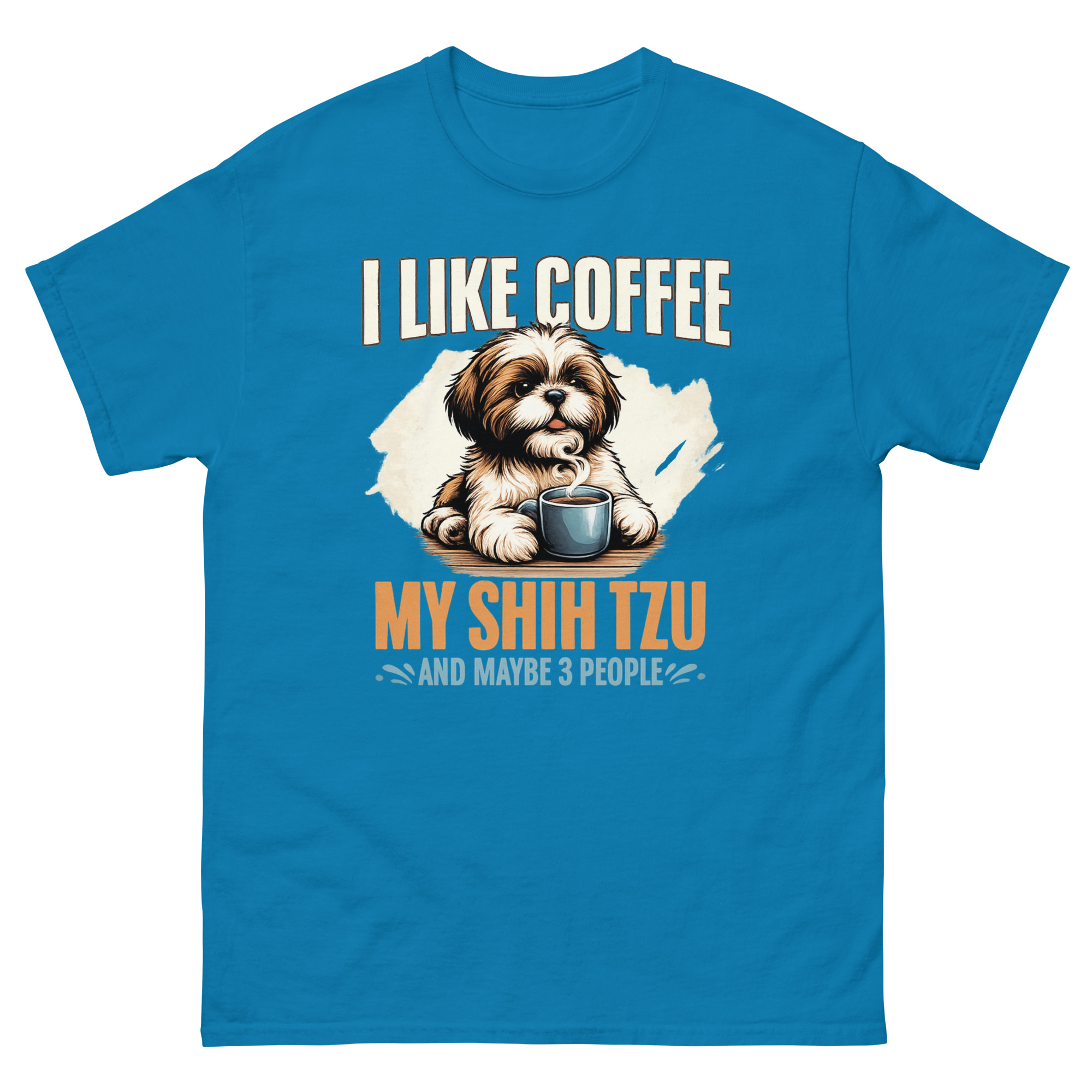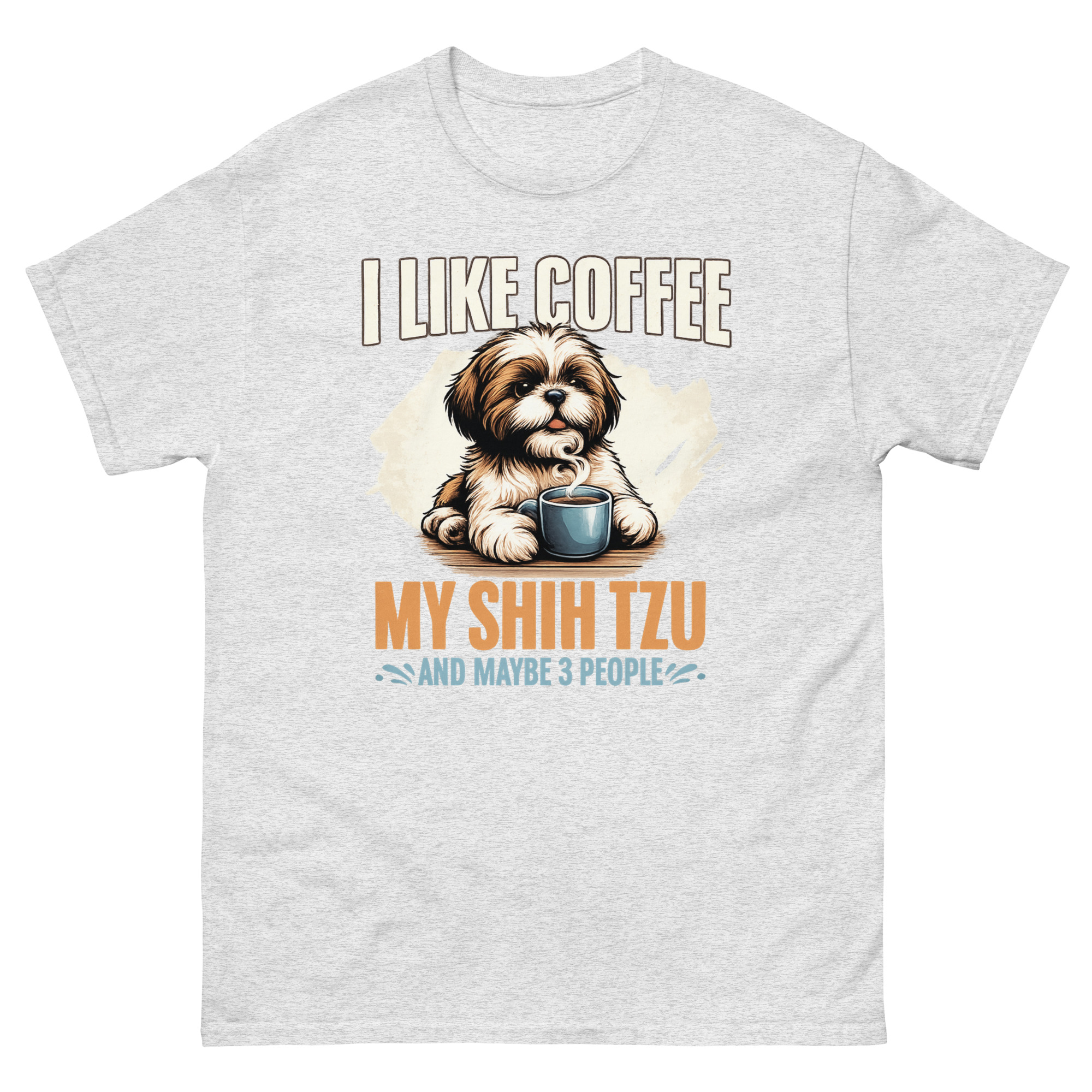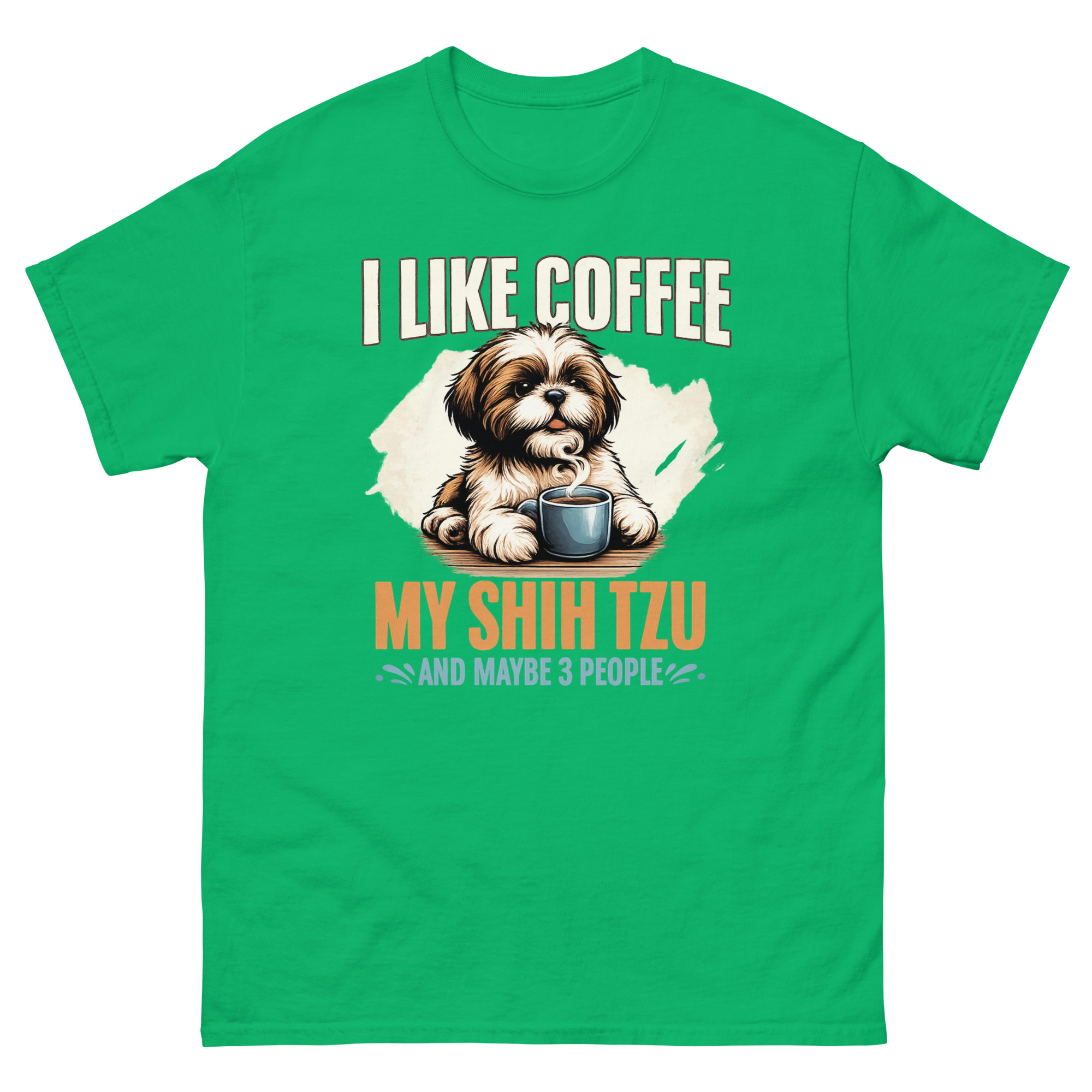 This is a beautifully illustrated graphic tee that combines three essential ingredients for a peaceful life. The I Like Coffee My Shih Tzu Maybe 3 People T Shirt features a painterly Shih Tzu peeking over a steaming coffee mug. It’s the perfect dog lover morning routine apparel for introverts who value caffeine, canine companionship, and a very short guest list.