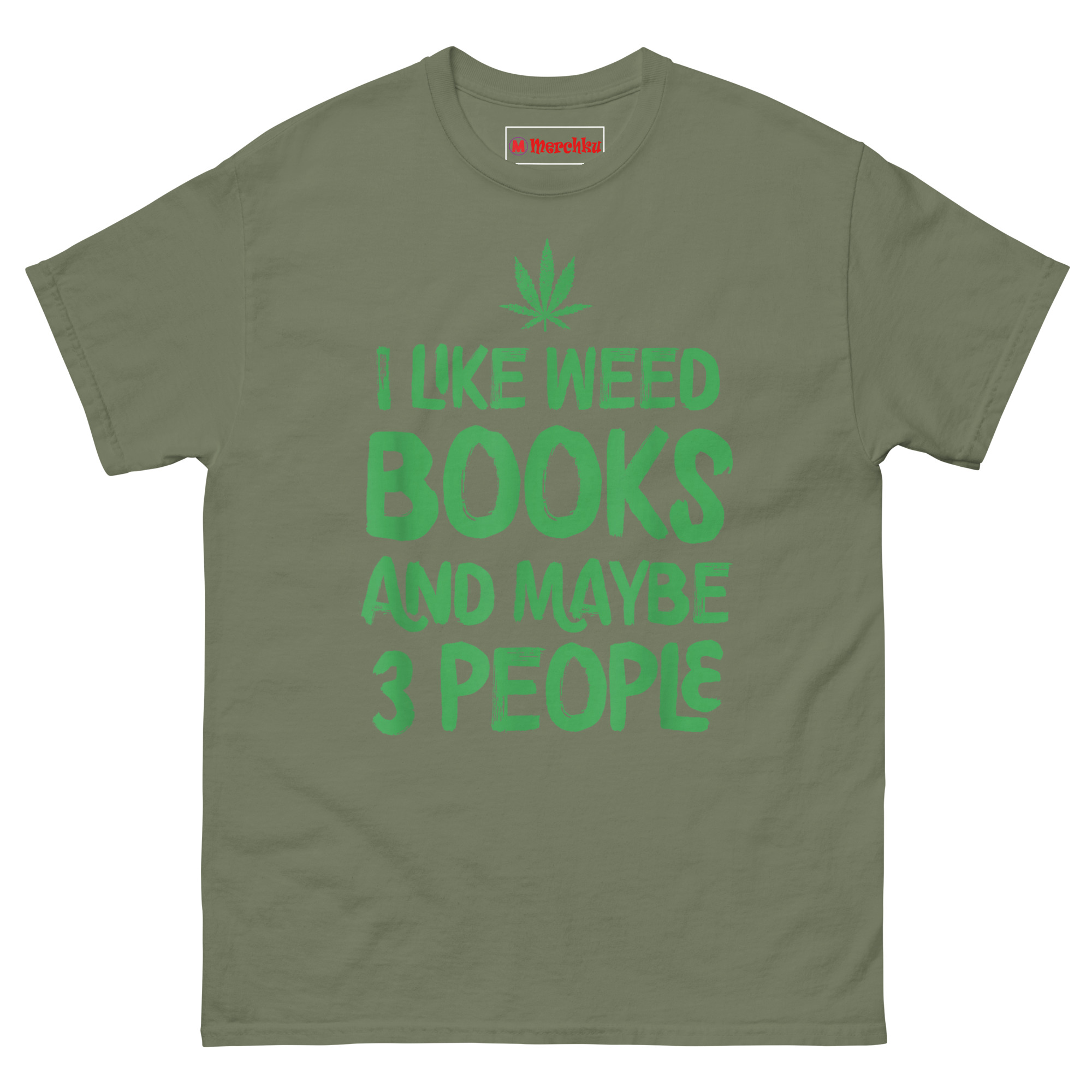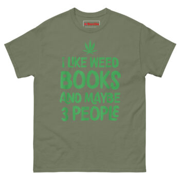 The seven-point leaf sits at the top like a crown, celebrating cannabis culture without apology. Below it, the words “BOOKS” and “3 PEOPLE” pop out in larger type because those are the priorities worth emphasizing. The distressed texture across the green graphic gives it a worn-in feel, like your favorite paperback after multiple reads. Every element points back to the same idea, being honest about who you are and what you actually enjoy. It’s not trying to be edgy for attention. It’s simply stating facts for anyone paying attention.