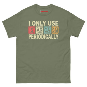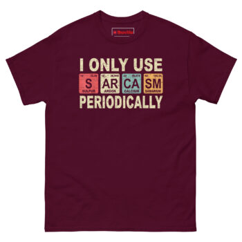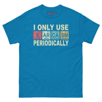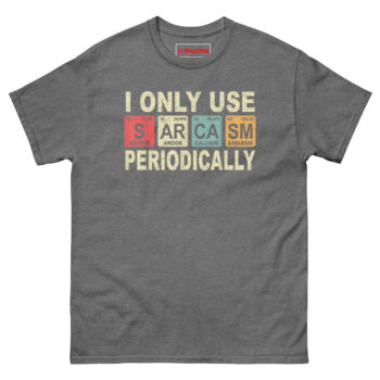 I Only Use Sarcasm Periodically T Shirt idea came from watching a high school chemistry teacher handle a ridiculous question with a perfectly dry response. Instead of a standard quote, we asked: What if sarcasm was a chemical compound? That question led to the “Atomic Snark” philosophy.