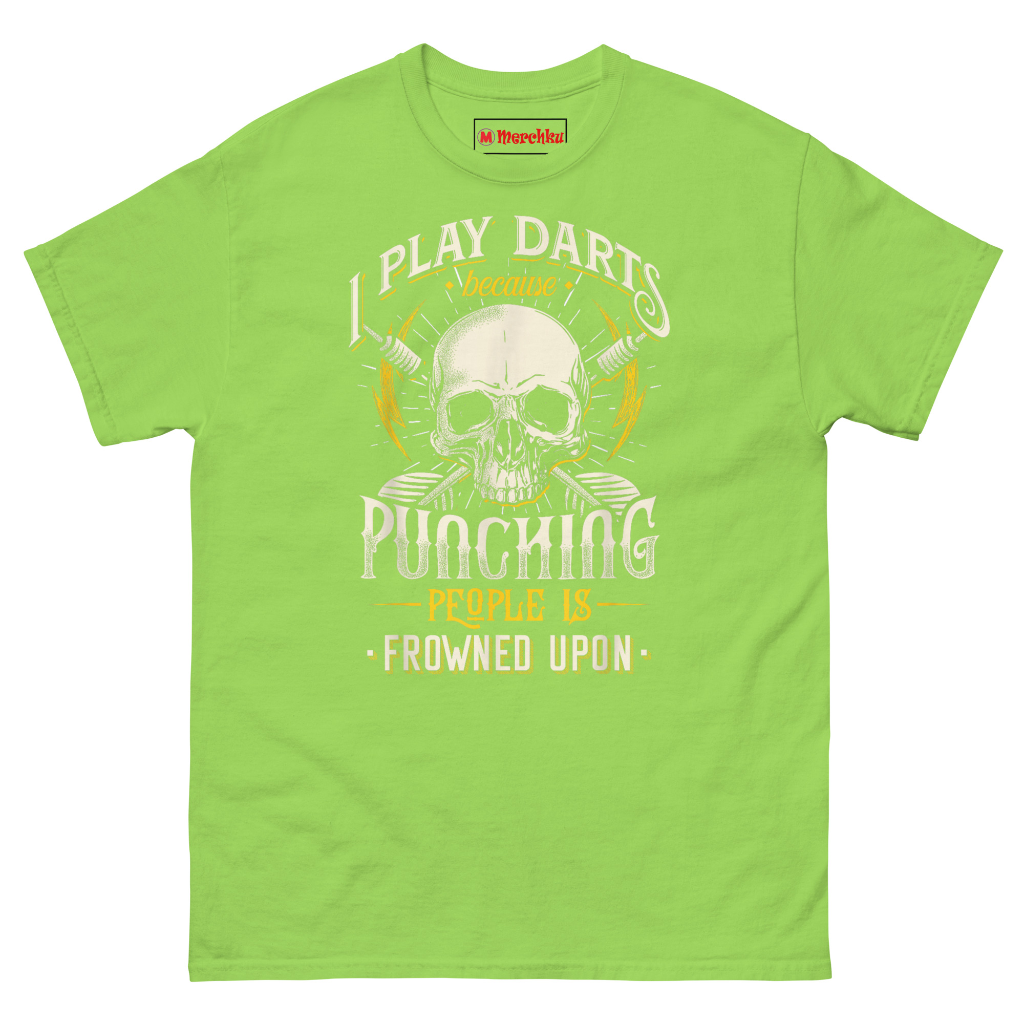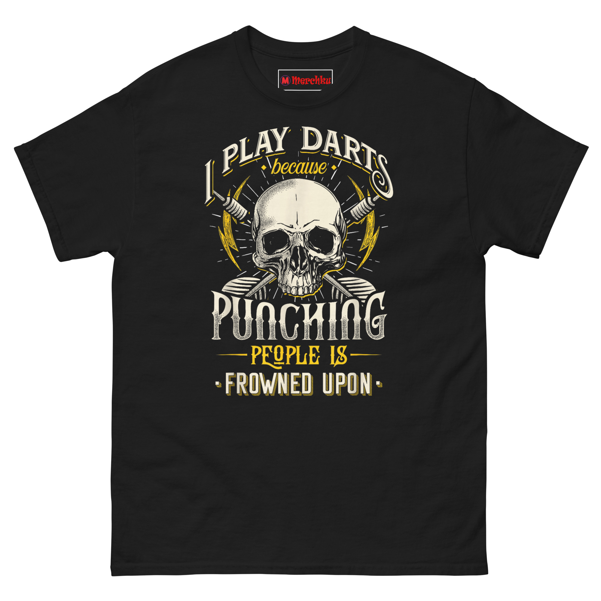 The I Play Darts Because Punching People is Frowned Upon T Shirt delivers aggressive humor without the actual aggression. This graphic tee combines a bold skull, crossed darts, and lightning bolts with a sarcastic confession about anger management. Designed for competitive pub players, tavern league regulars, and anyone who channels their frustration through sharp objects thrown at walls.