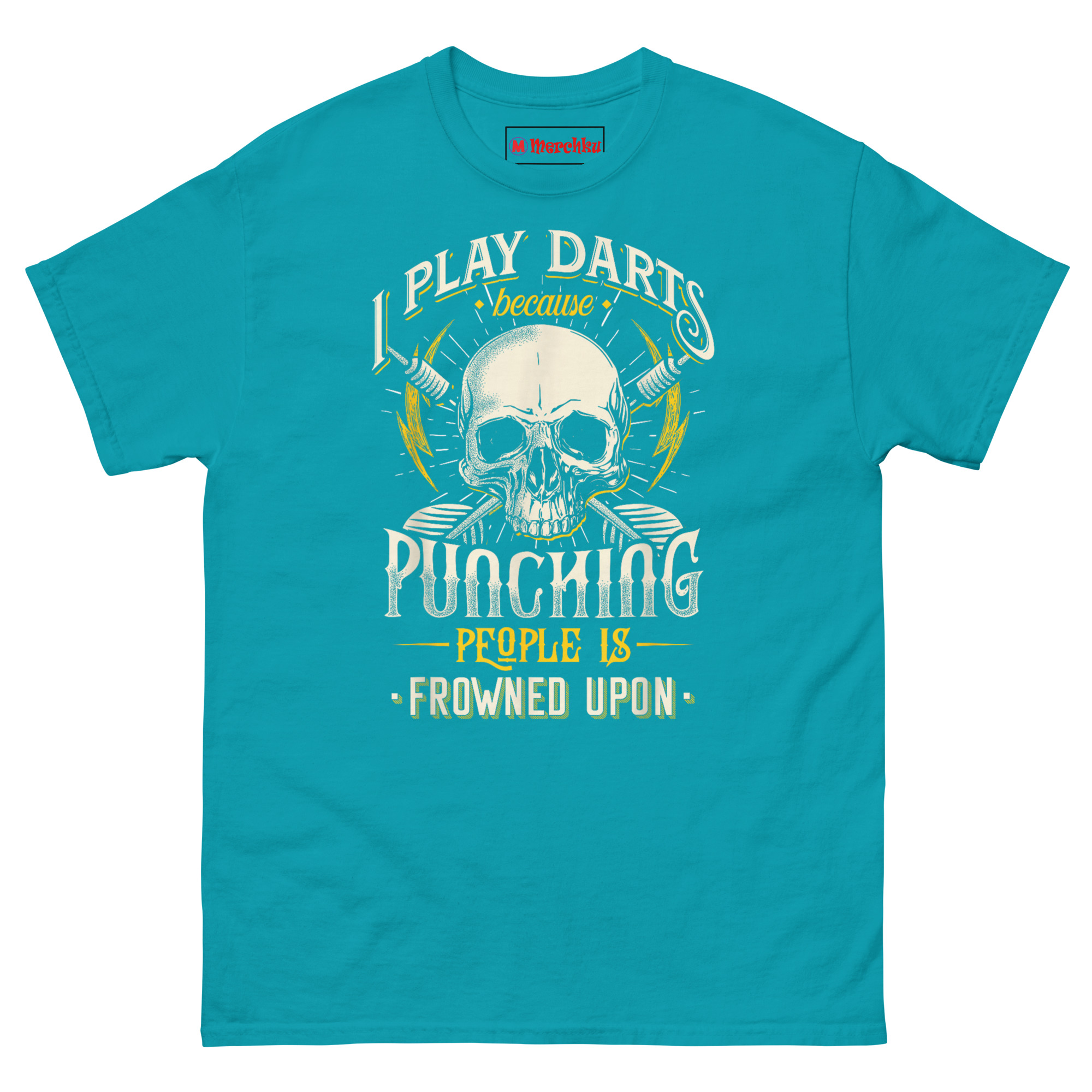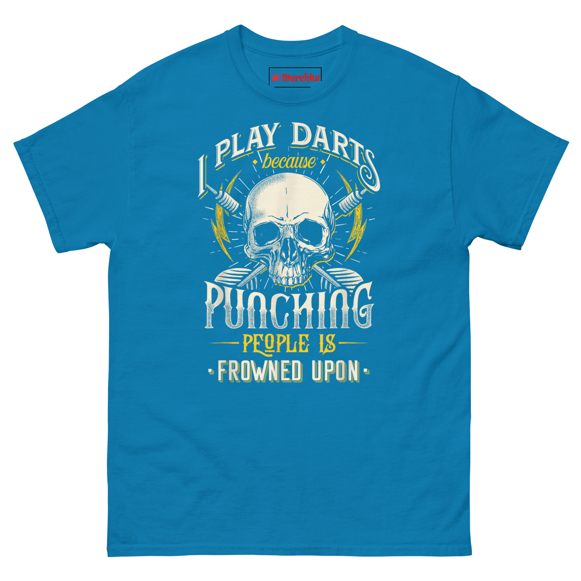 This concept from a particularly intense pub match. One player kept missing their marks, getting visibly frustrated, and muttering under their breath. After a rough loss, they joked, “Good thing I play darts instead of boxing.” That comment stuck with us. There is something universally relatable about choosing a controlled outlet for competitive energy. We wanted a design that looked tough enough to match the sentiment but humorous enough to keep things light. The skull represents the intensity of competition. Crossed darks honor the tool of the trade. Lightning bolts add visual energy and edge. Mixing western-style block fonts with cursive and distressed yellow typography creates depth and movement. It is pub game apparel that warns opponents you mean business while admitting the whole thing is slightly ridiculous.