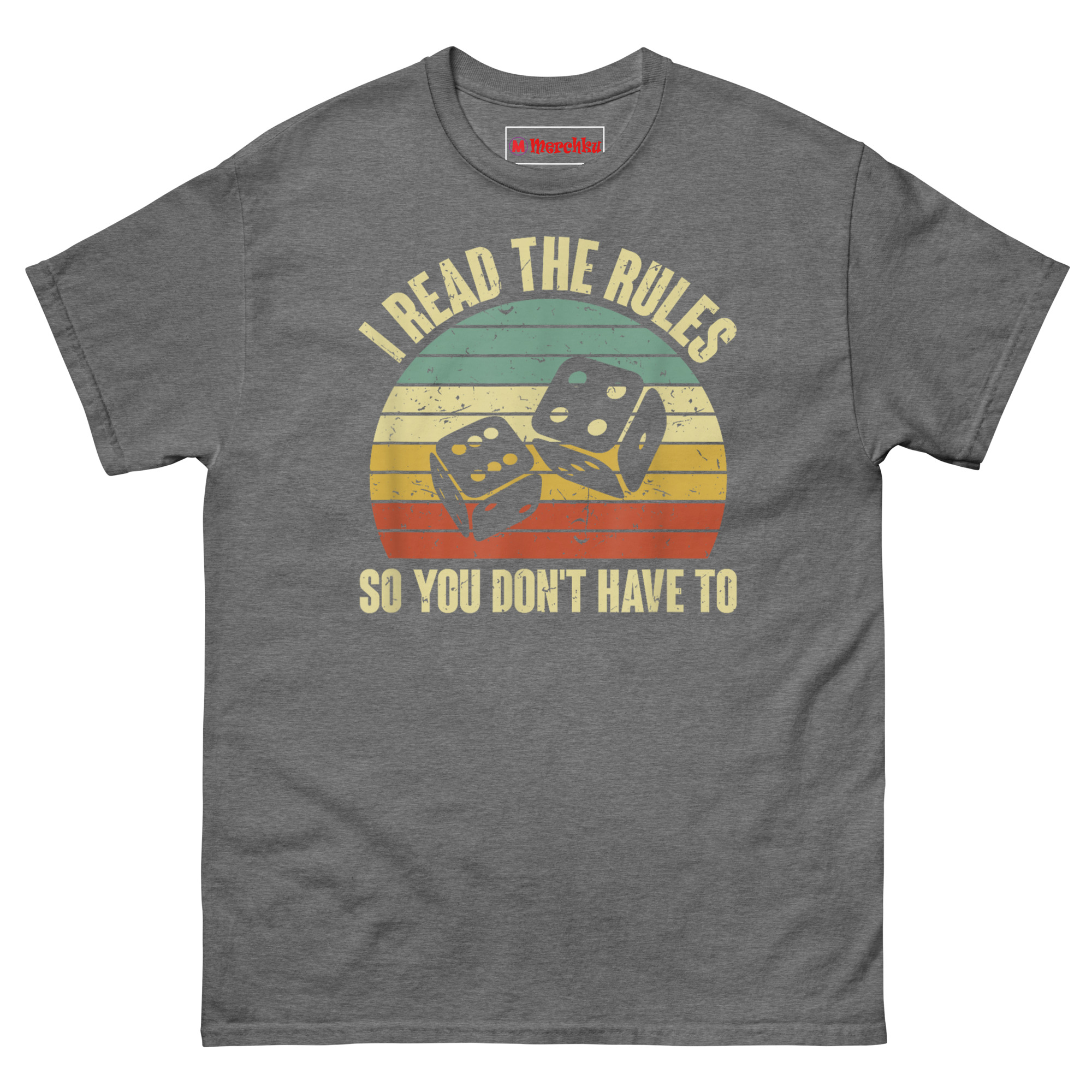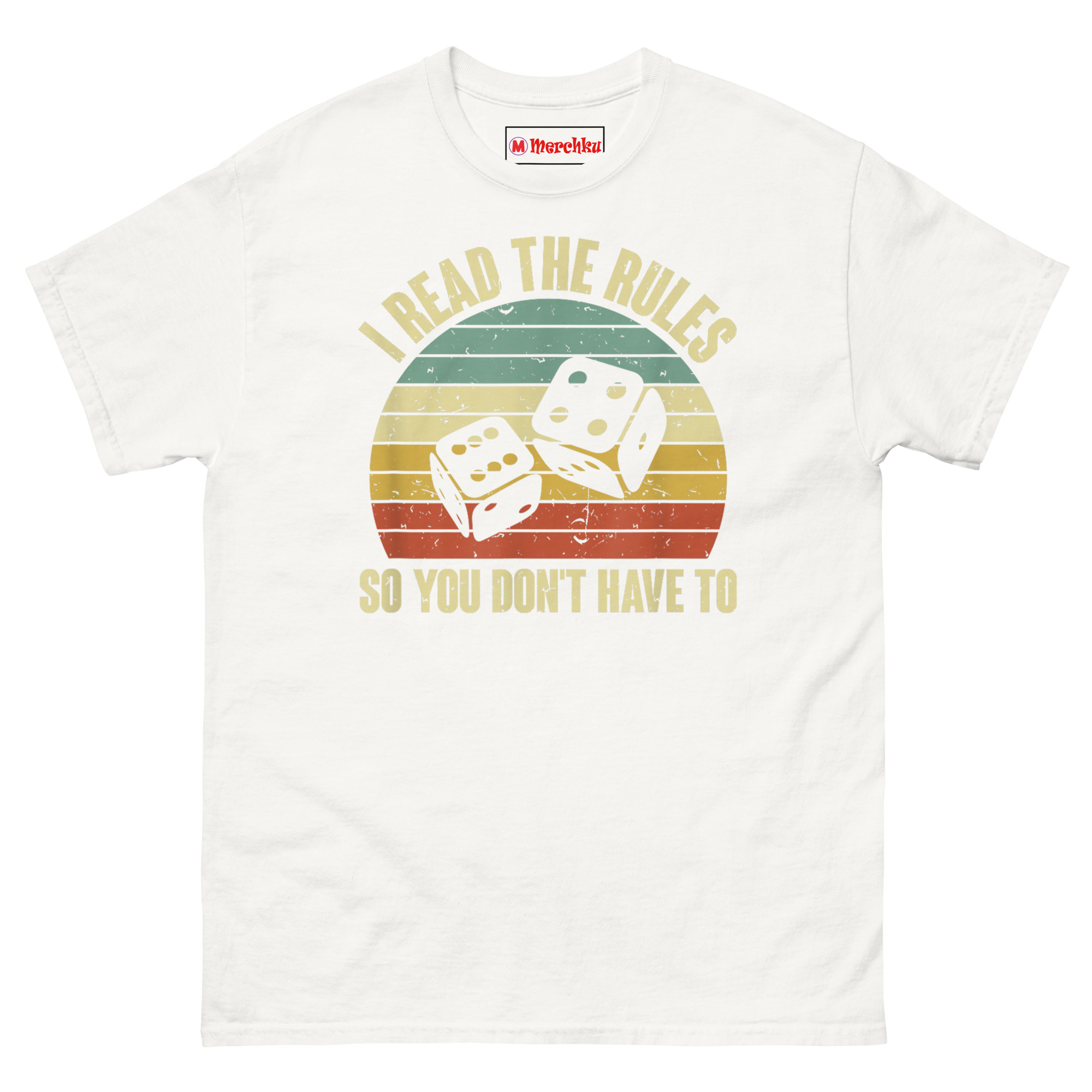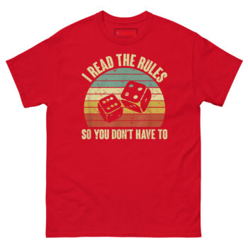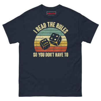 The I Read The Rules So You Don’t Have To T Shirt is a vintage-style graphic tee created specifically for the unsung heroes of game night. It combines a classic 1970s sunset design with tumbling dice and a bold, relatable message. Built for the rulebook reader in every gaming group, this shirt turns your thankless preparation into wearable recognition.