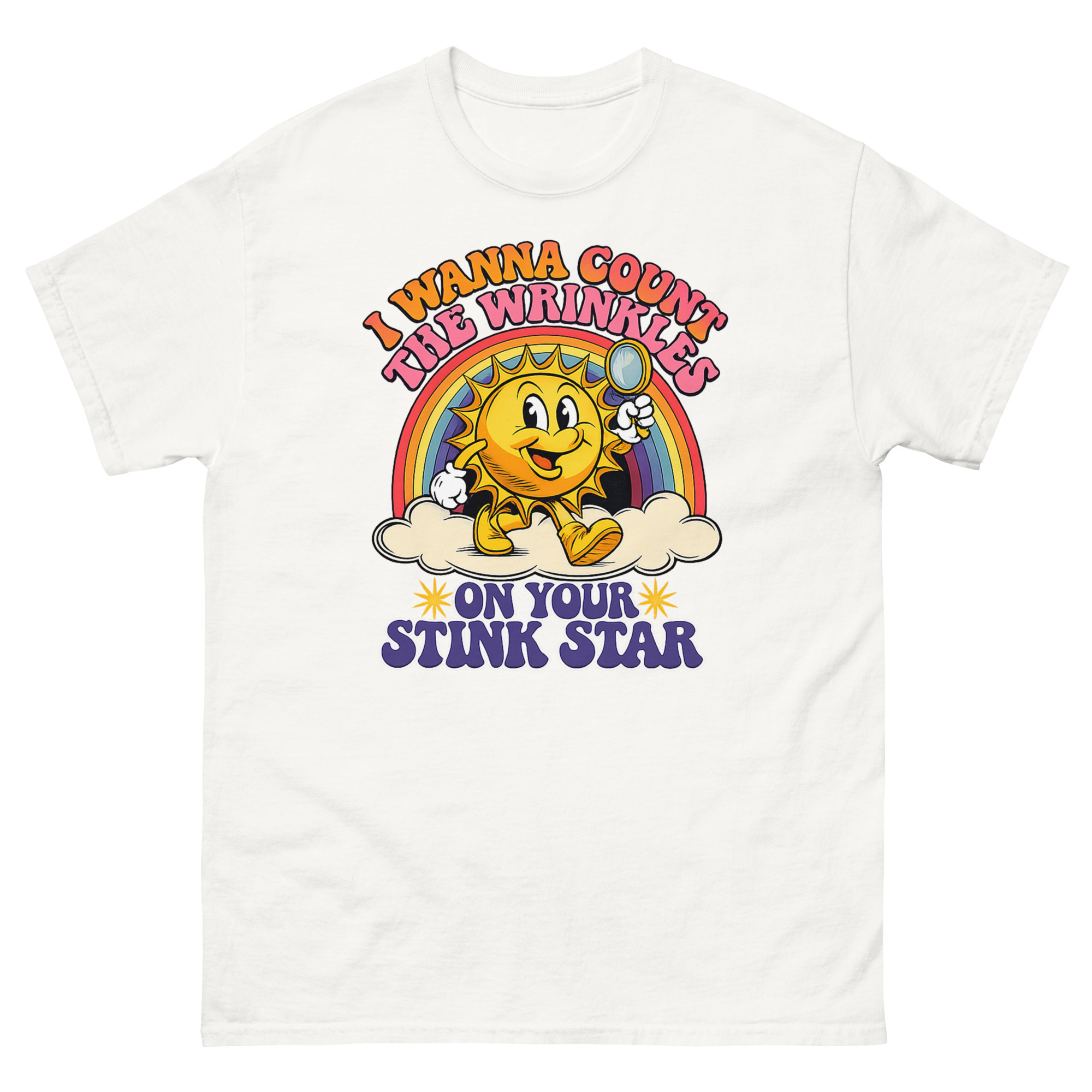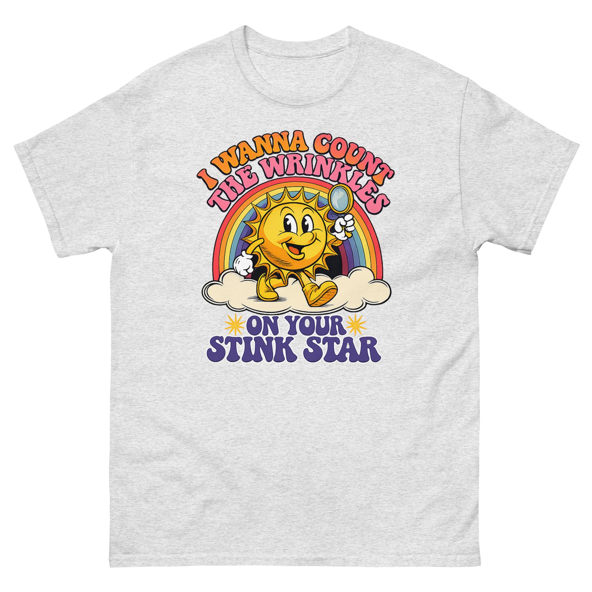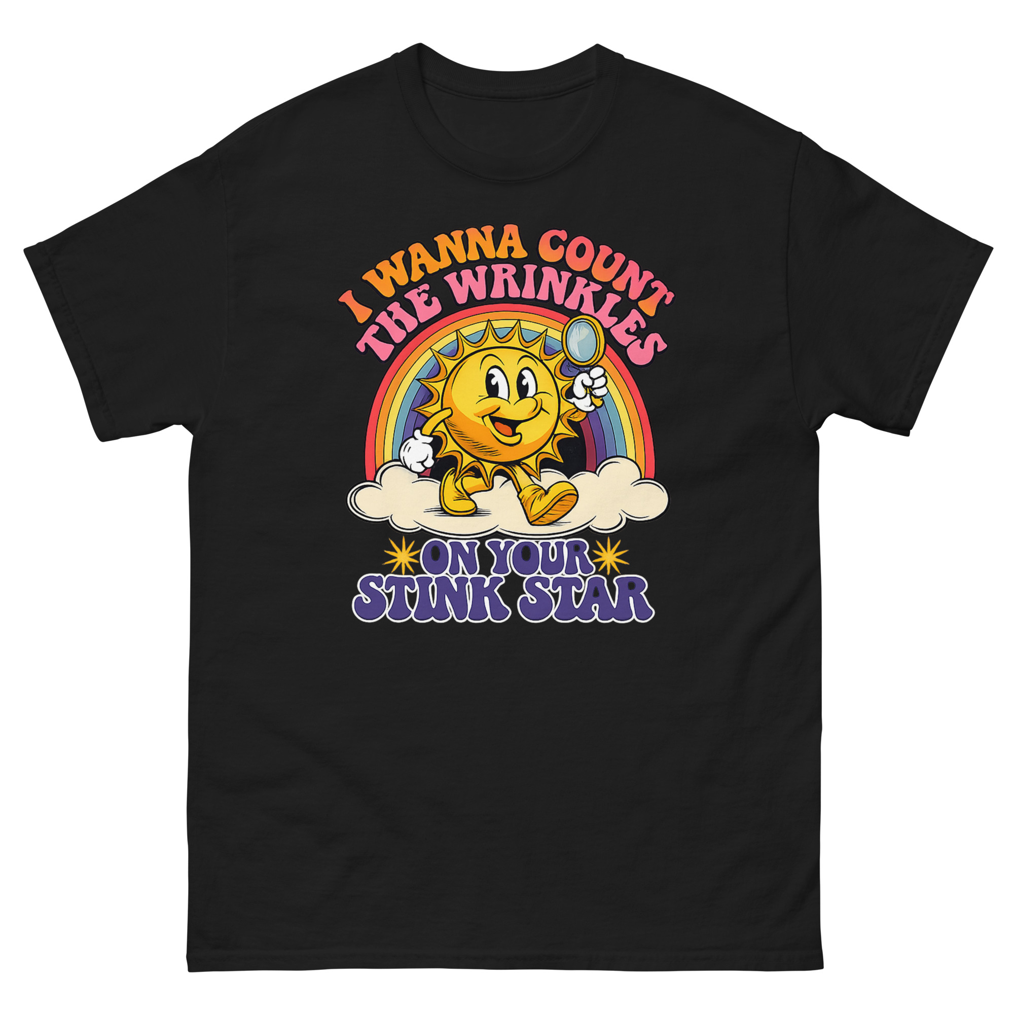 Retro 1930s rubber-hose sun mascot with magnifying glass and rainbow on I Wanna Count The Wrinkles On Your Stink Star T Shirt.
