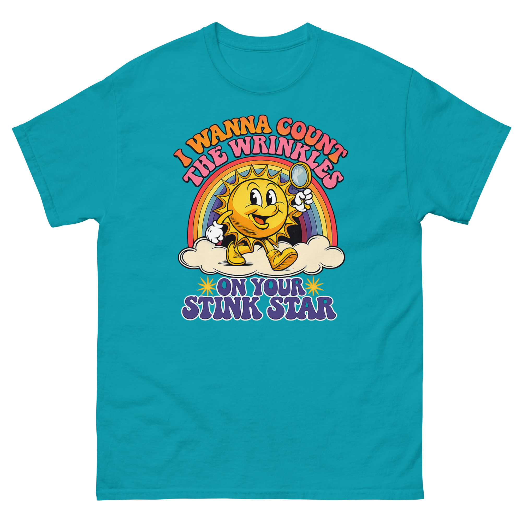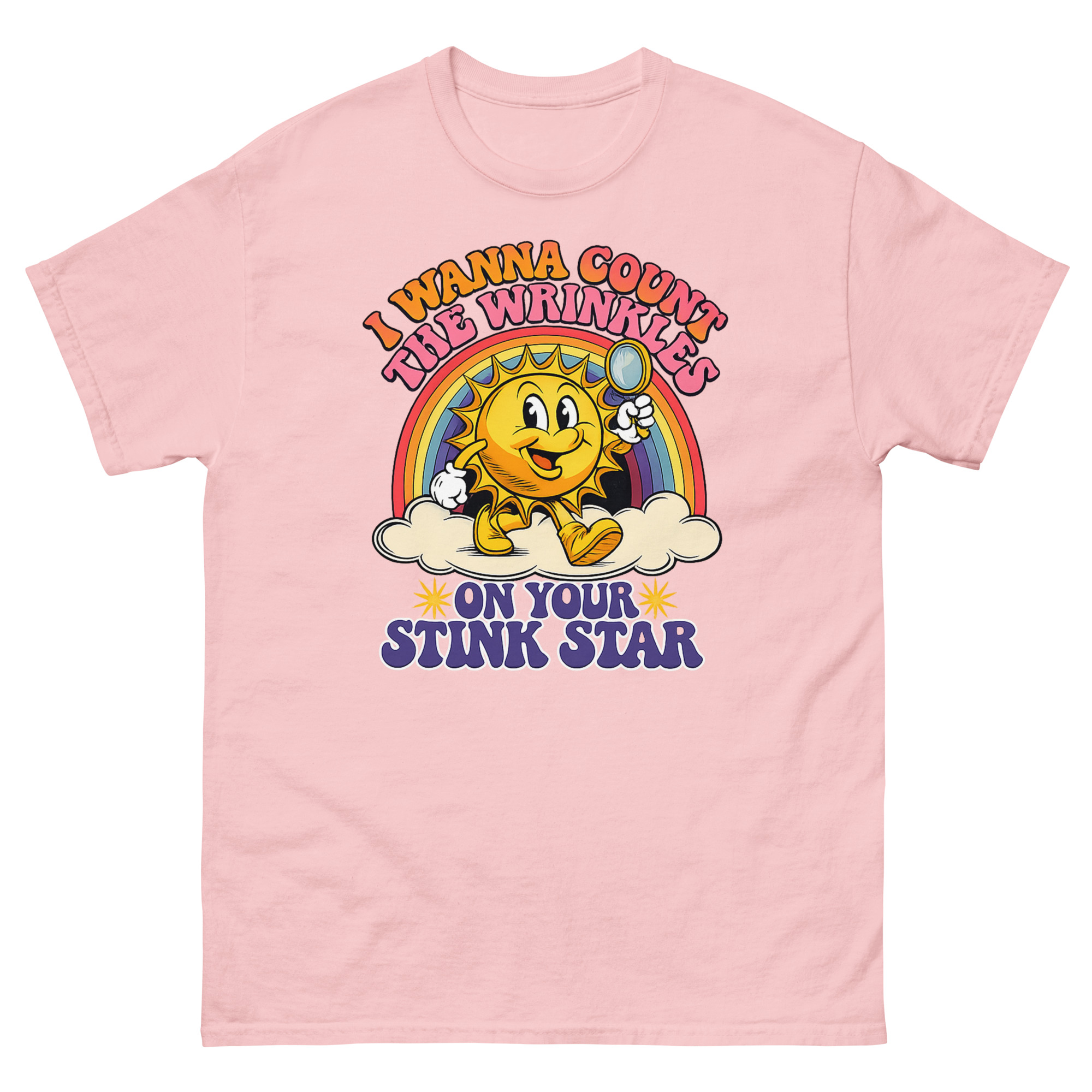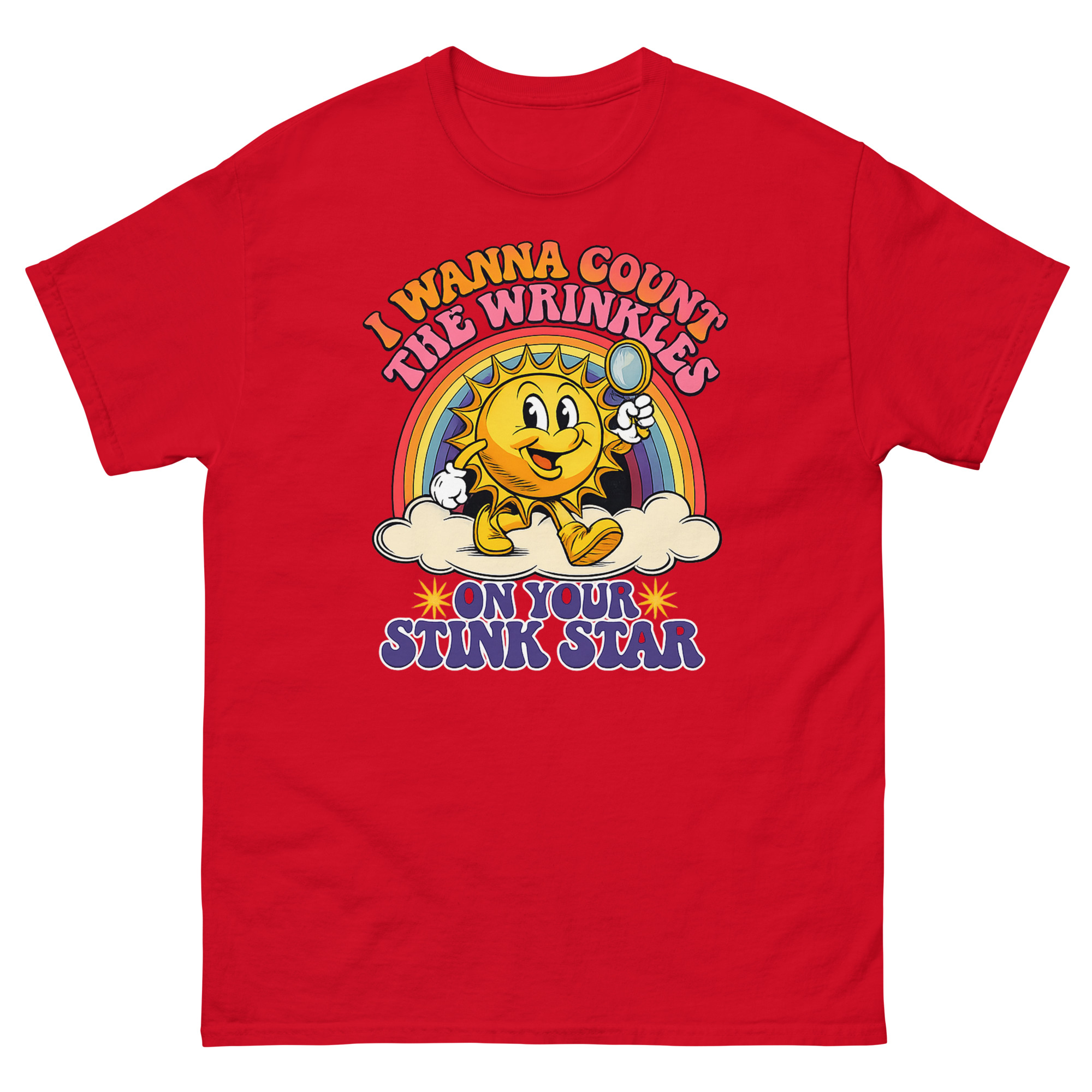 Retro 1930s rubber-hose sun mascot with magnifying glass and rainbow on I Wanna Count The Wrinkles On Your Stink Star T Shirt.