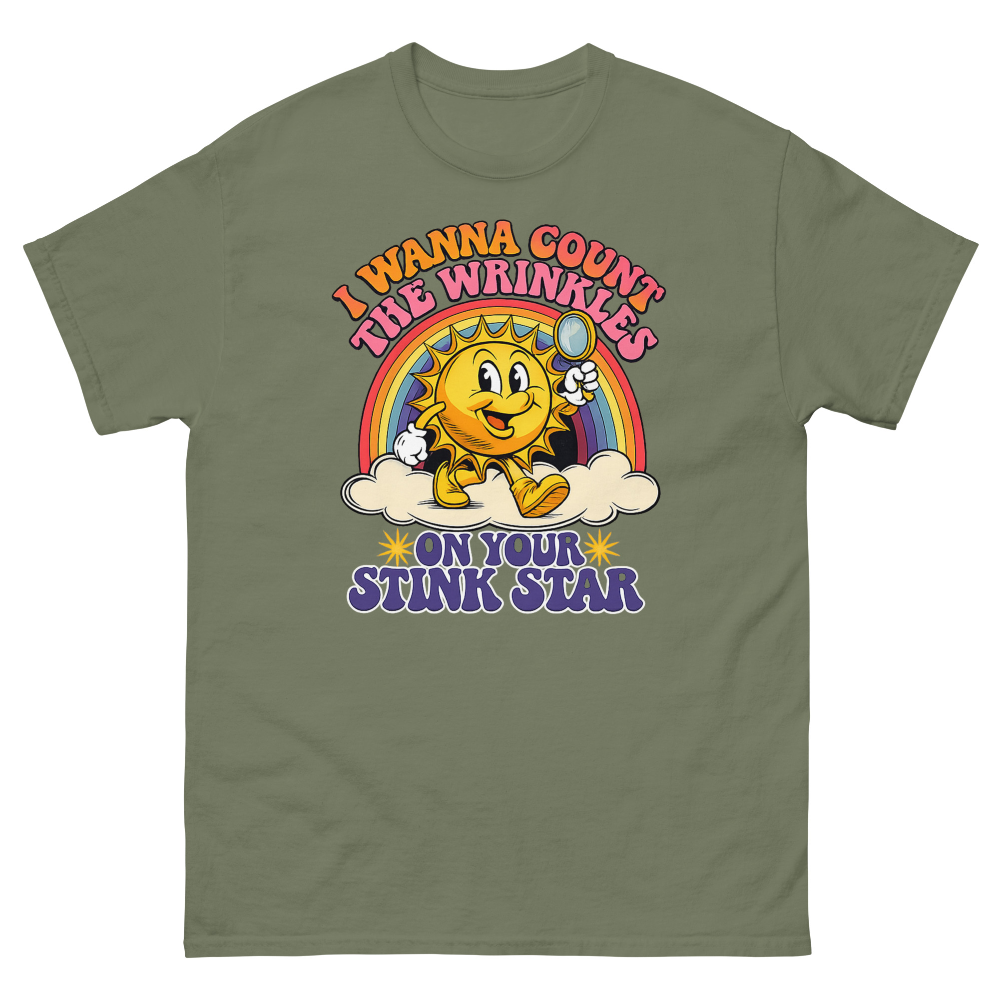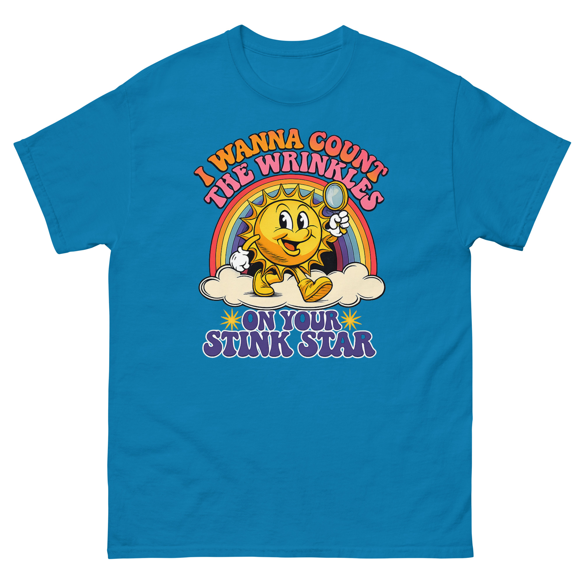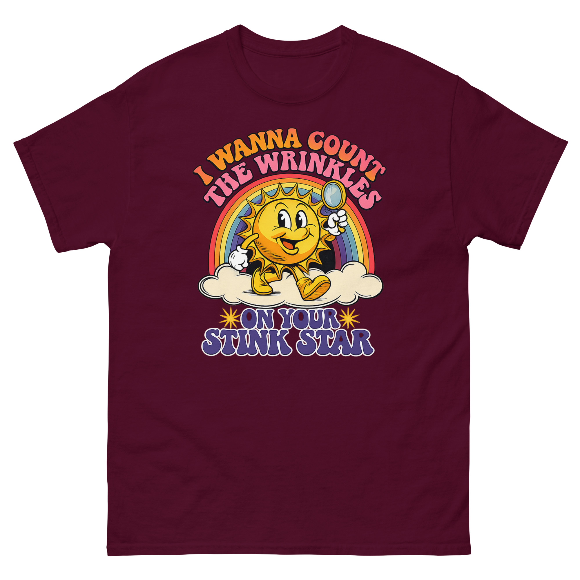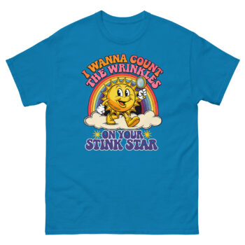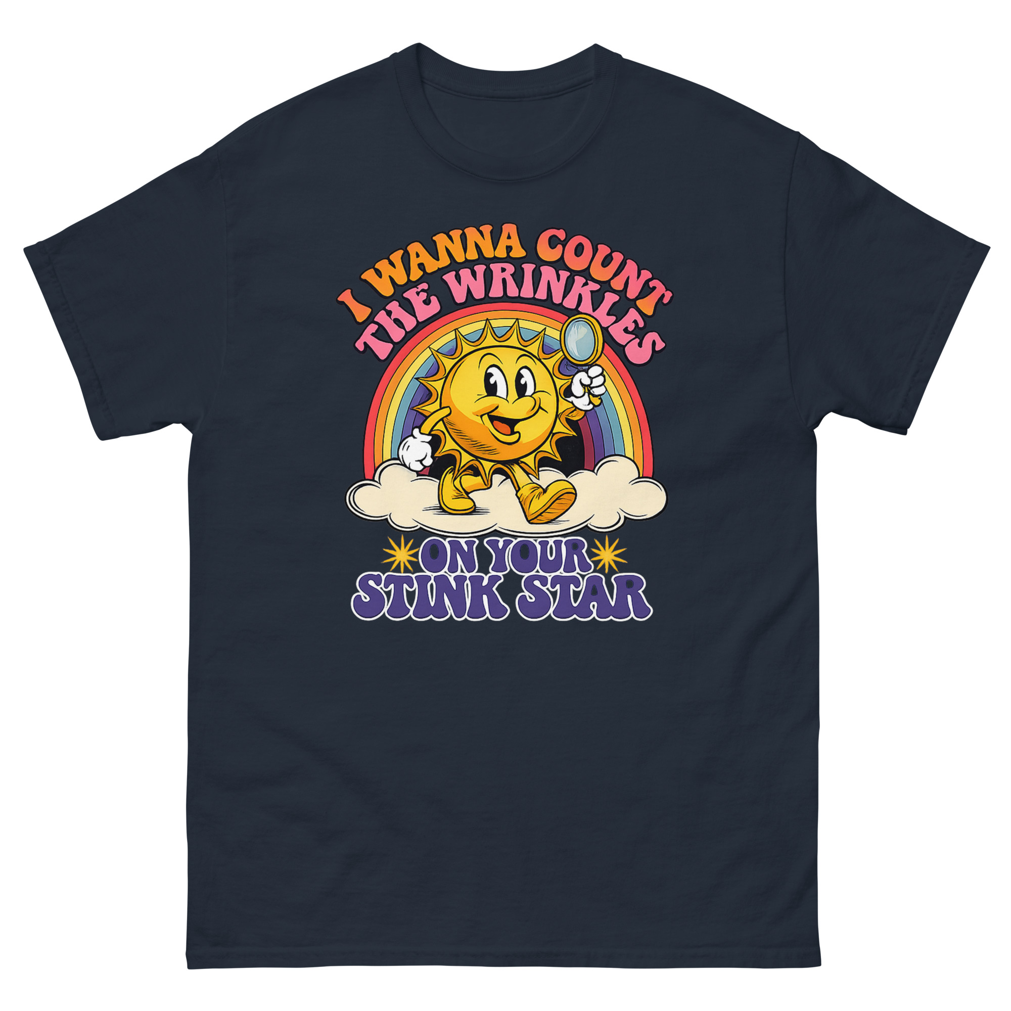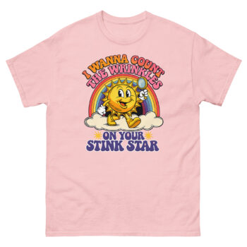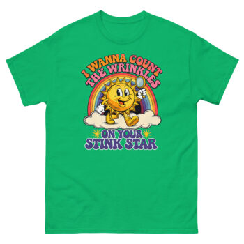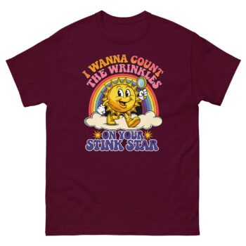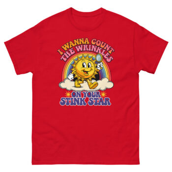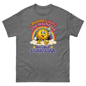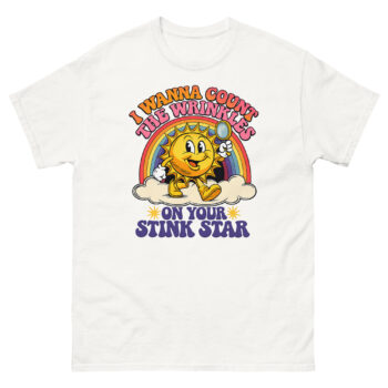 This is a deceptively cheerful graphic tee that pairs vintage cartoon charm with a very adult punchline. The I Wanna Count The Wrinkles On Your Stink Star T Shirt features a 1930s rubber-hose style sun mascot holding a magnifying glass. It’s the ultimate offensive adult humor apparel for anyone who appreciates a well-executed double-take.