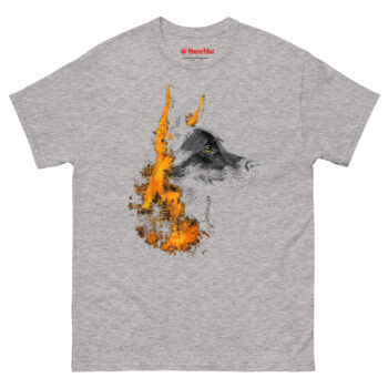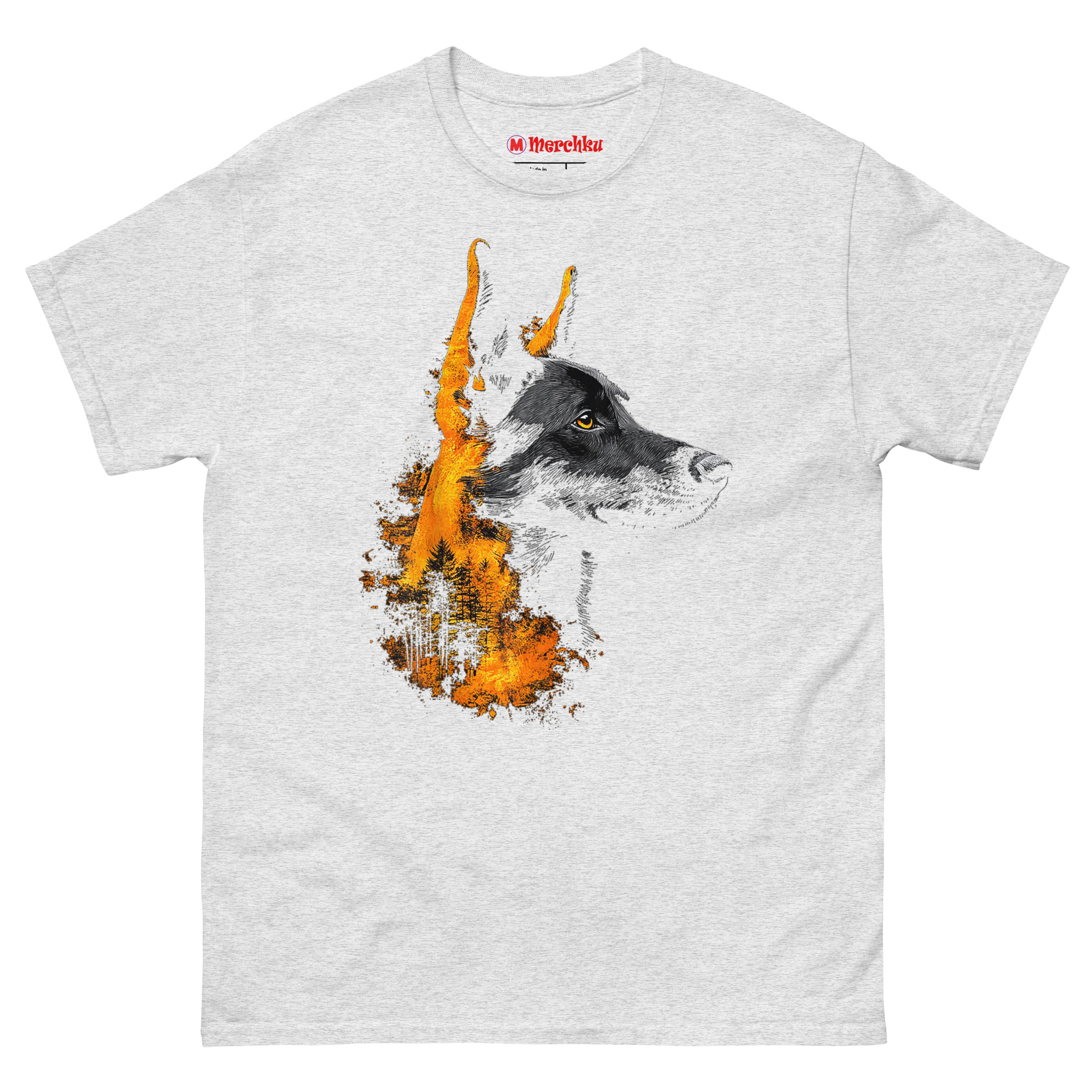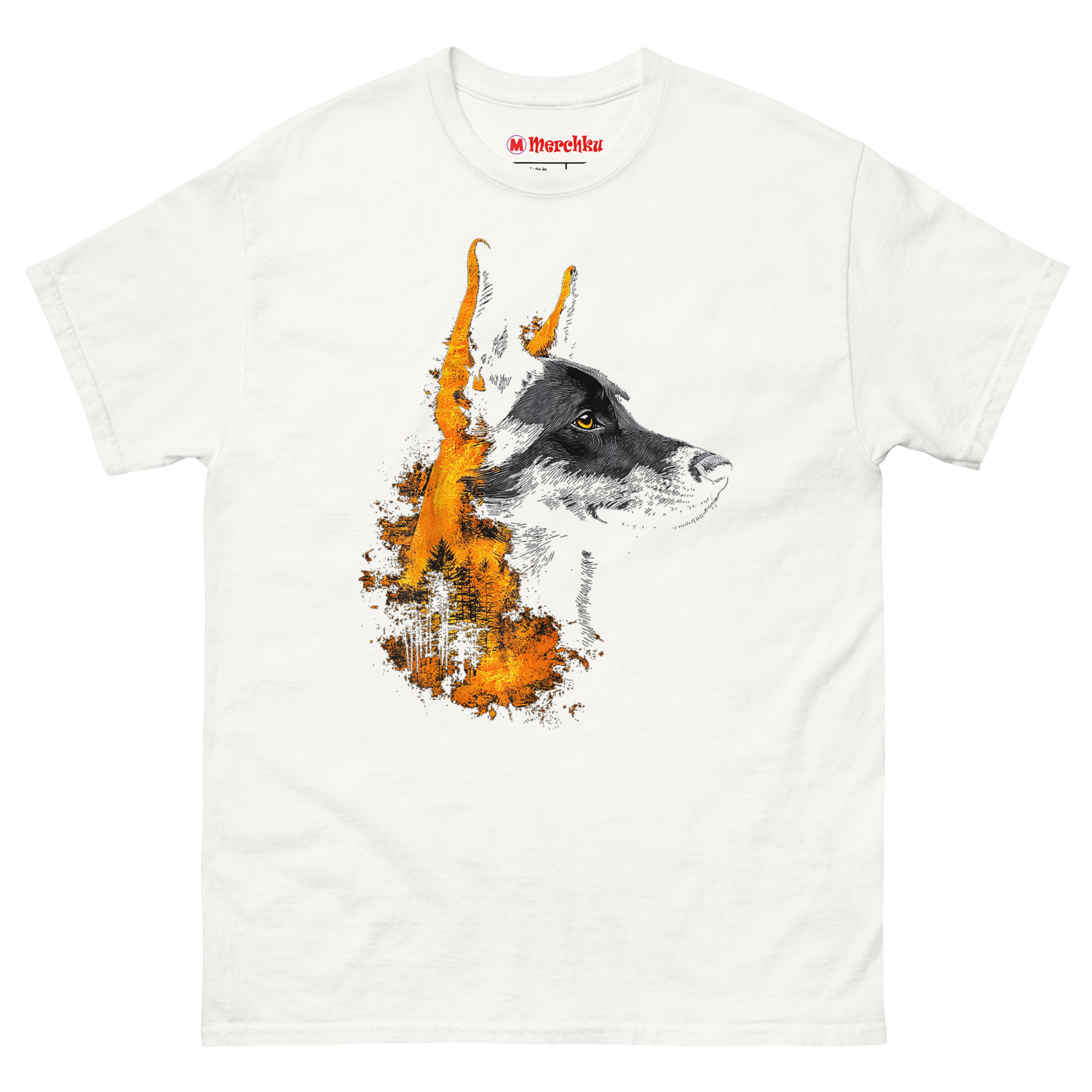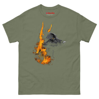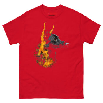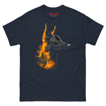 That image stuck with me. Belgian Malinois are known for their tireless work ethic and protective instincts. But underneath that discipline is a primal, ancient drive. This design, called “The Guardian’s Soul,” aims to visualize that spirit. The profile of the Malinois is rendered in sharp, realistic detail, deep black fur, alert posture, and an amber eye that catches the light. But the back of the head and neck dissolve into a dense coniferous forest. The trees are painted in burnt orange and golden yellow, like a sunset filtering through the pines. It suggests that the dog’s power and focus run as deep as the wilderness itself. The high-contrast orange-on-black palette represents the fire and intensity handlers love about the breed. It’s a perfect artistic dog breed shirt for Malinois moms and dads.