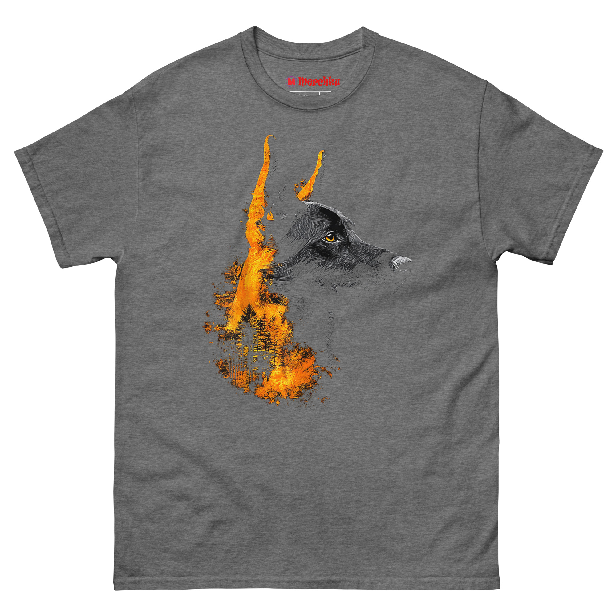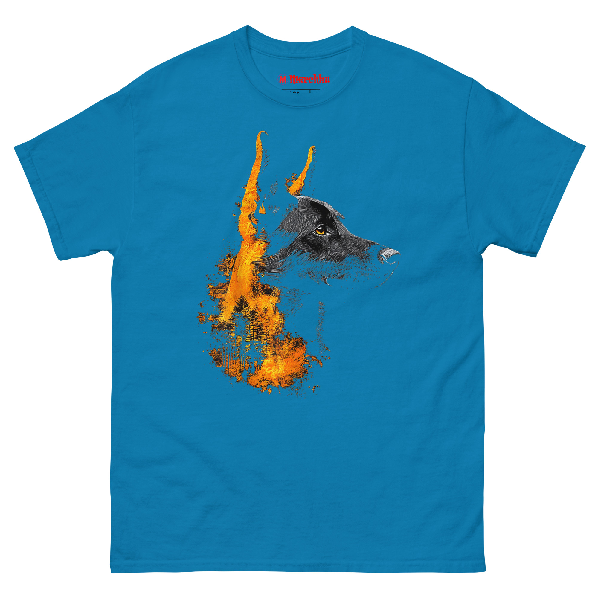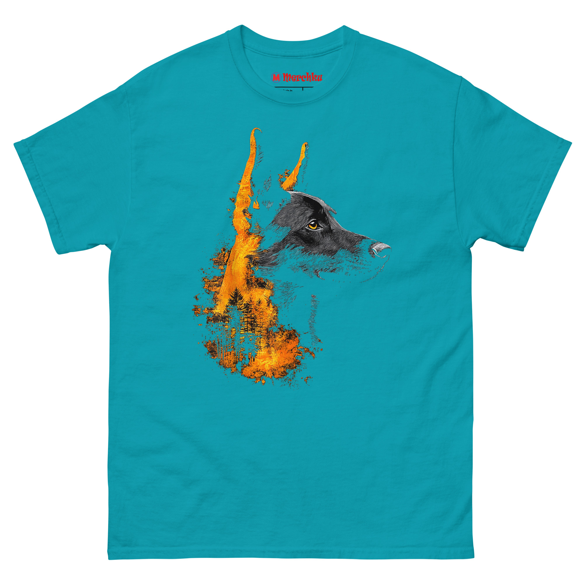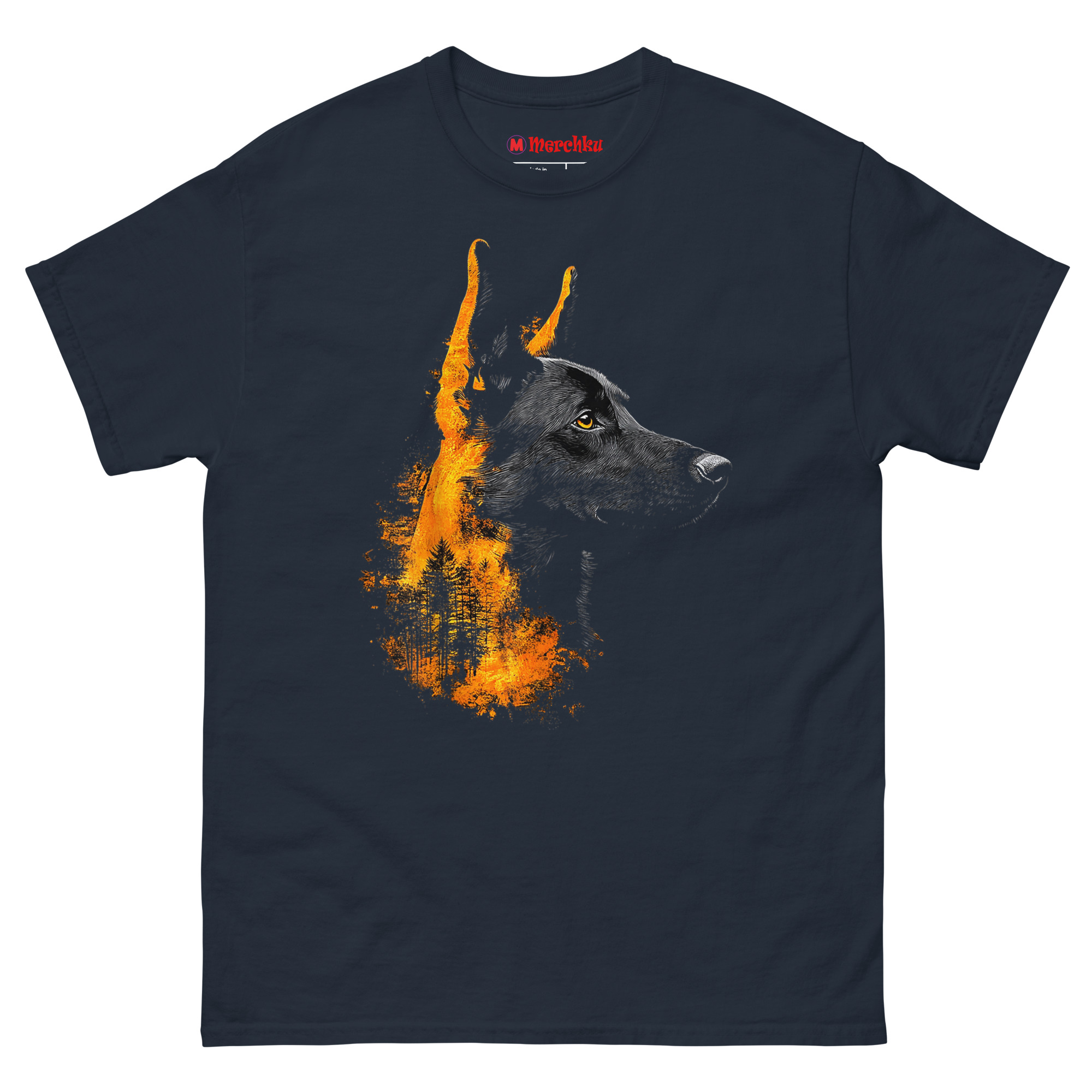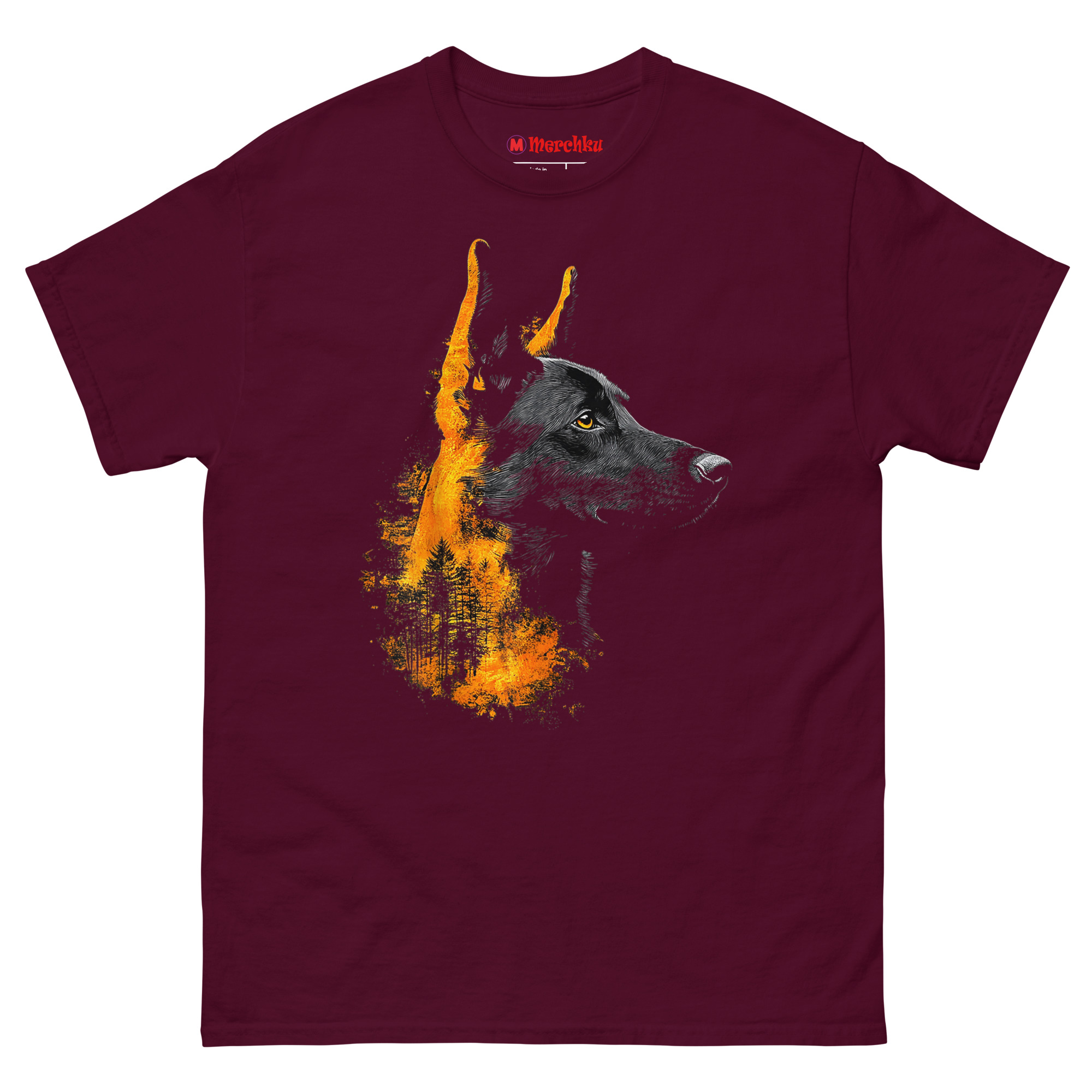 - Design: Double-exposure illustration blending a Malinois profile with a fiery autumn forest, featuring sharp fur textures and an amber eye highlight.