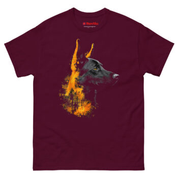 The Illustrations of Belgian Malinois Dogs T Shirt captures the wild soul of this powerful working breed. A detailed profile illustration uses a double-exposure technique to blend the dog’s silhouette with a fiery autumn forest. It’s a unique Belgian Malinois gifts for K9 handlers who appreciate the deep connection between their guardian dog and the untamed wilderness within.