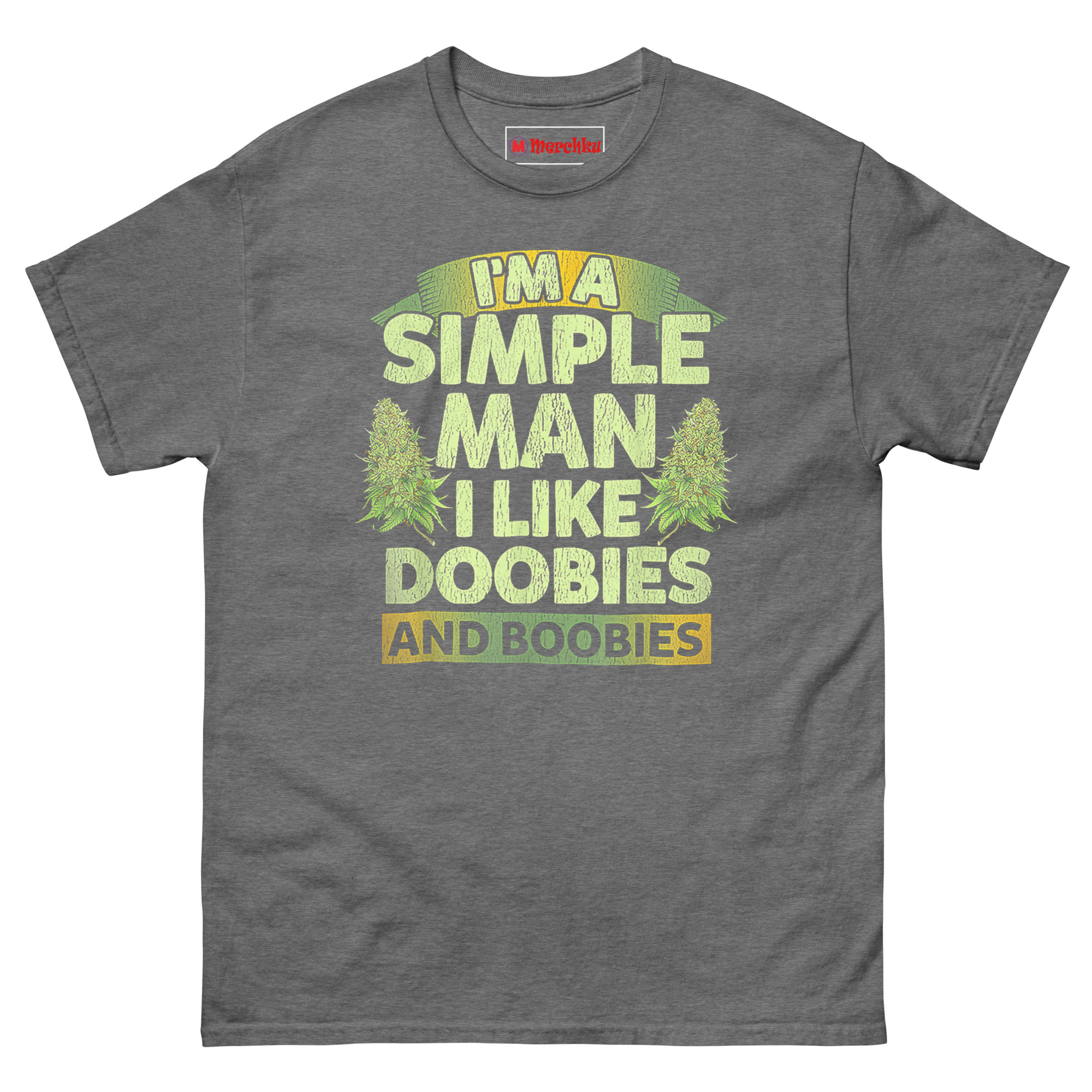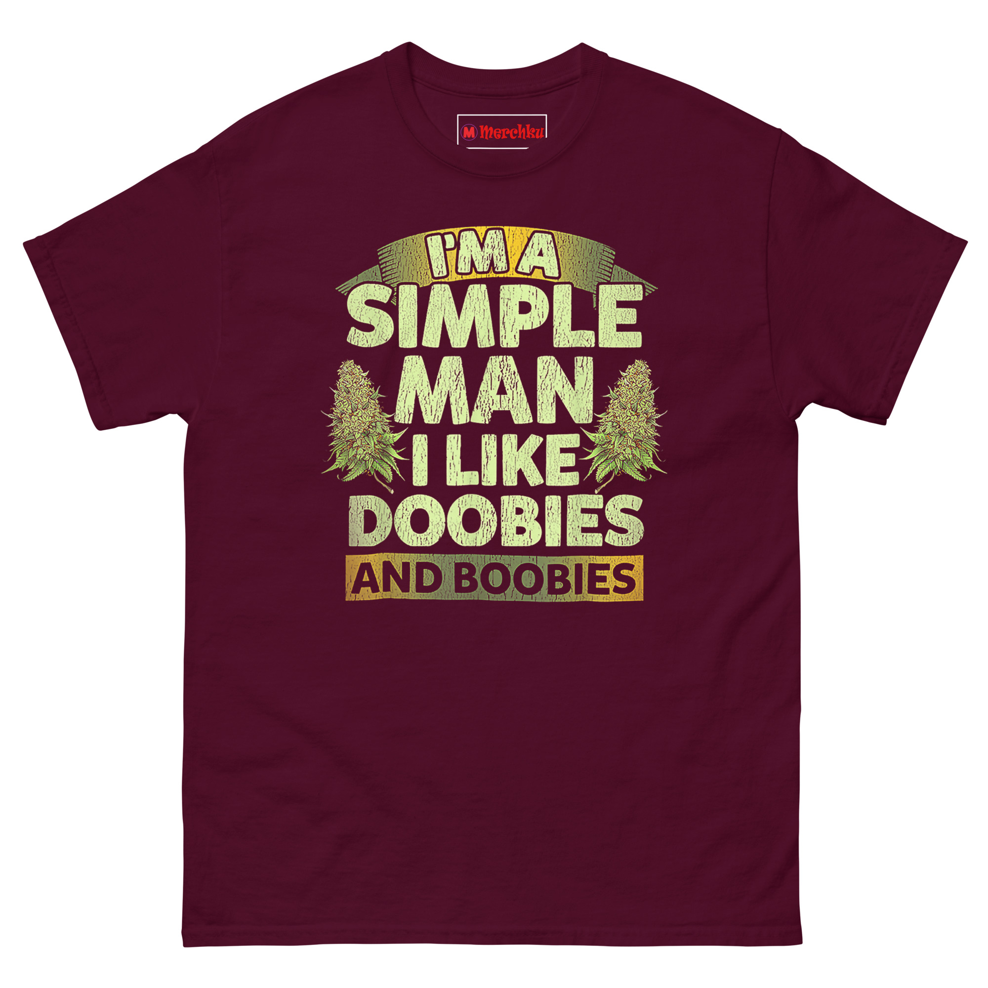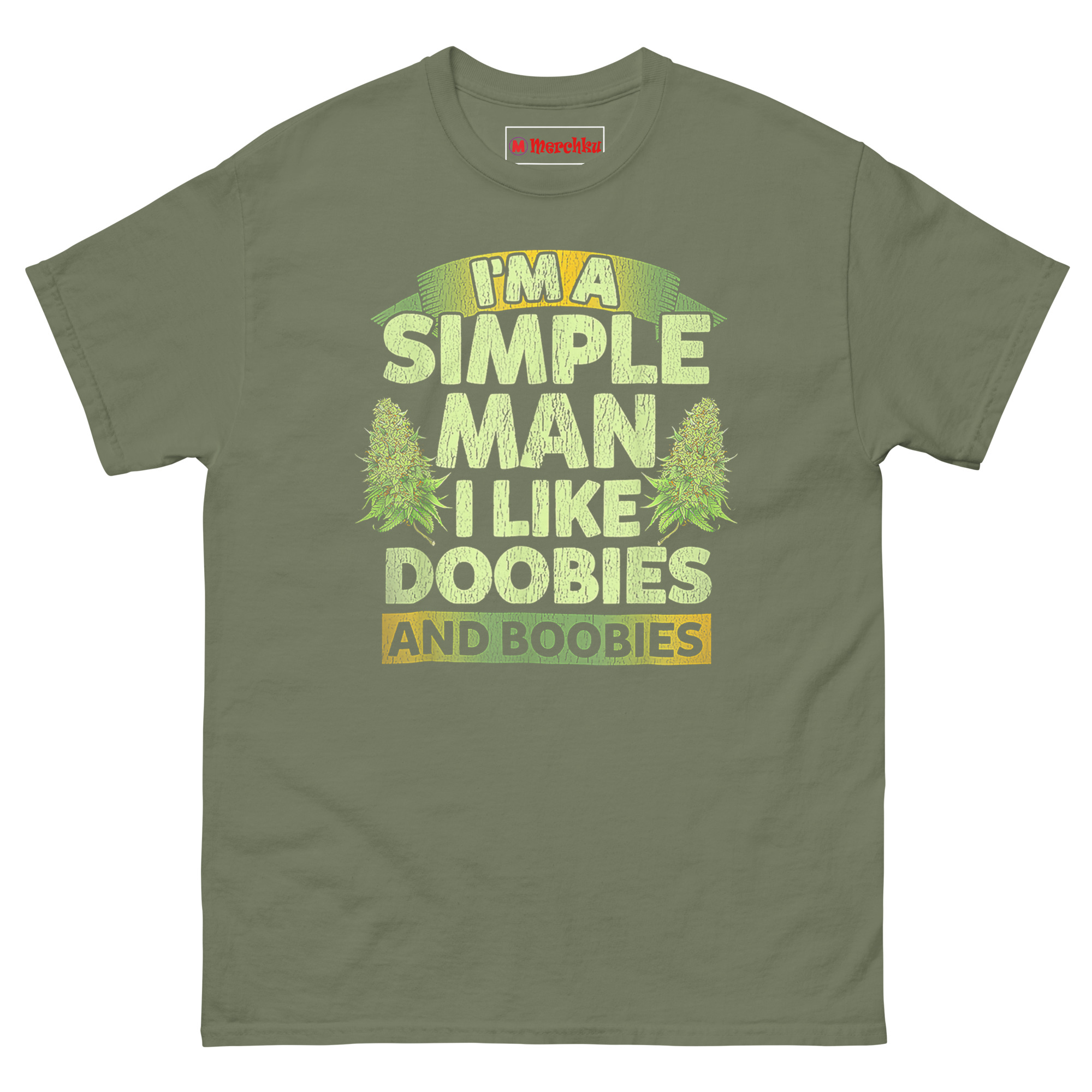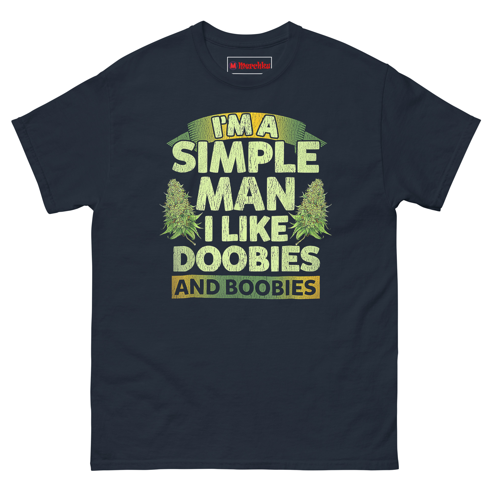 A buddy once said, “People overcomplicate everything. I know what I like.” That conversation stuck with me. Most “simple man” shirts talk about trucks, dirt roads, or cold beer. We wanted a different angle—one that’s brutally honest about what actually makes a relaxed guy smile. The distressed, cracked font gives it a vintage feel, like a shirt you’ve owned for a decade. Flanking the main text are two realistic cannabis sativa buds, not cartoon leaves. That detail matters because it shows respect for the plant itself, not just the joke. The earthy green-to-yellow gradient keeps things natural and grounded. Furthermore, the banner layout (I’M A at the top, AND BOOBIES at the bottom) frames the punchline perfectly. Wear this to a 420 gathering, a backyard barbecue, or just around the house. People will laugh, nod, or both.