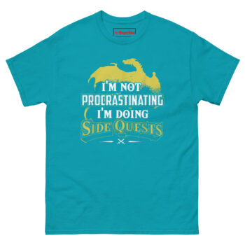 I’m Doing Side Quest T Shirt idea sparked during a conversation about why we avoid certain tasks. One of us admitted they hadn’t started their weekend chores because they were “completing faction missions” in an MMO. That excuse felt oddly noble. We realized gamers have a built-in reframing mechanism: side quests always come first. The main storyline can wait. Why should real life be any different? We wanted a design that captured that specific mindset without being lazy about it. The golden dragon represents the epic scale of these detours. Clean serif text contrasts with bold metallic block letters to emphasize the distinction between procrastination and purpose. Medieval fonts and crossed swords ground everything in classic fantasy aesthetics. It turns a simple excuse into a full-blown identity.