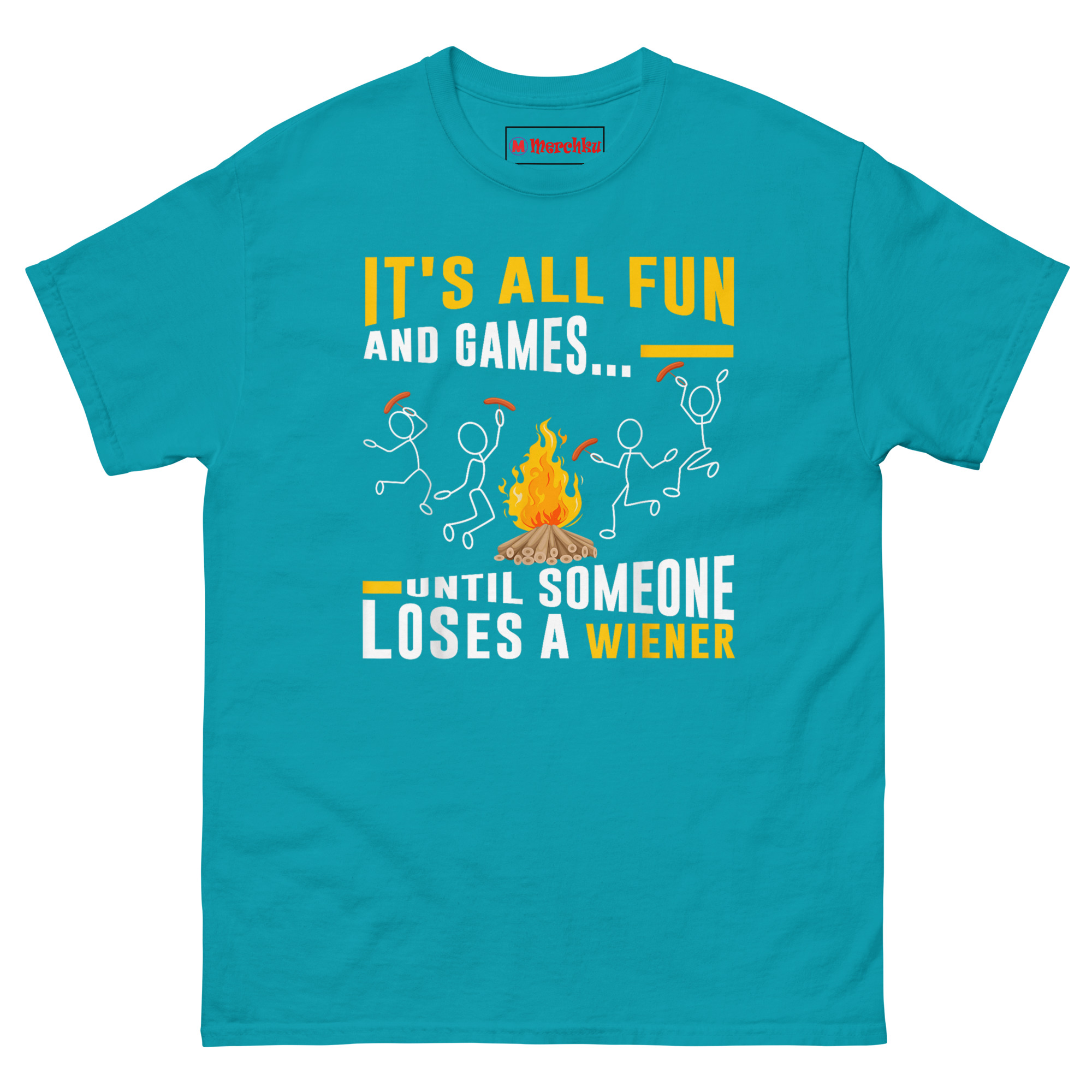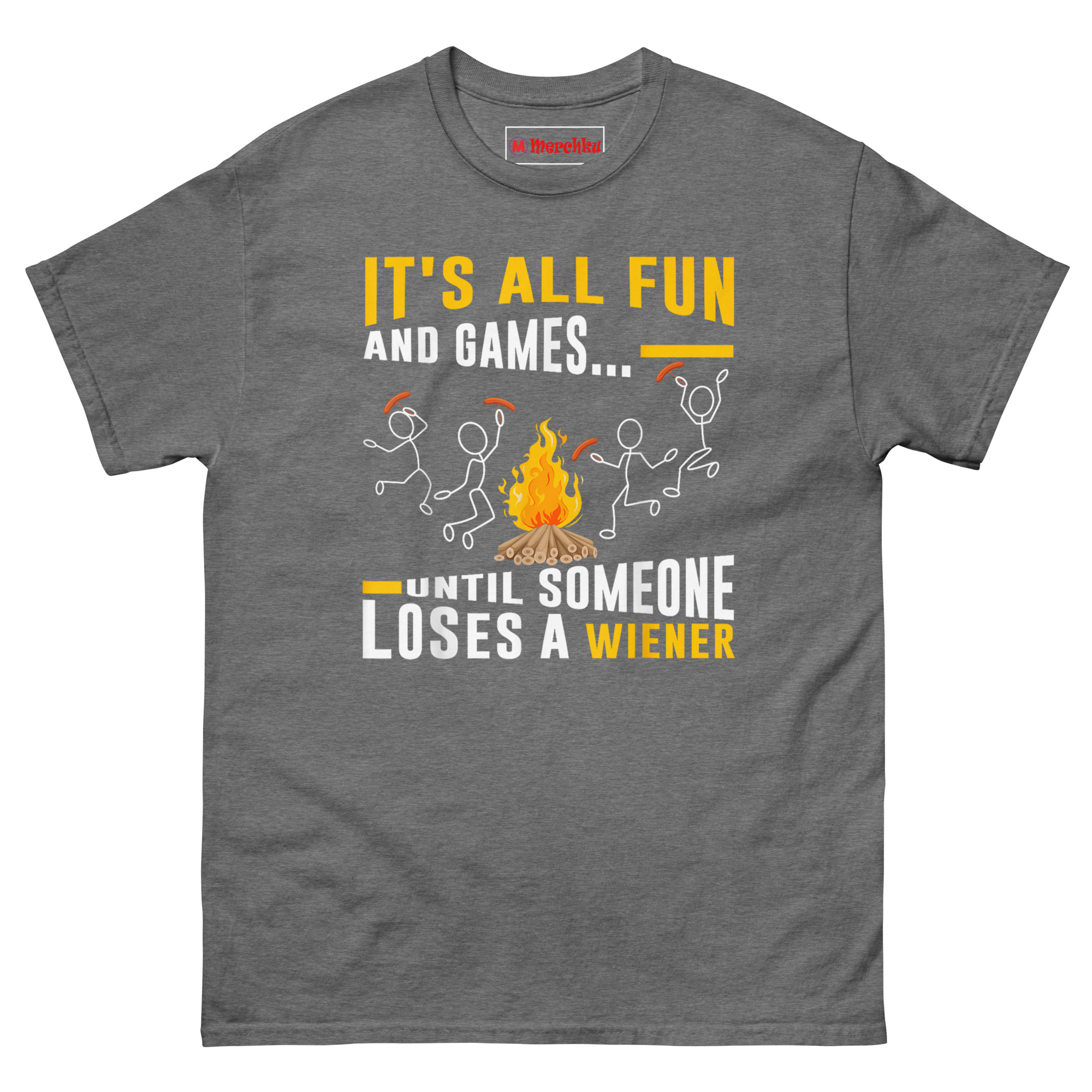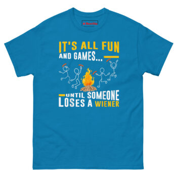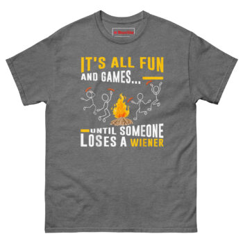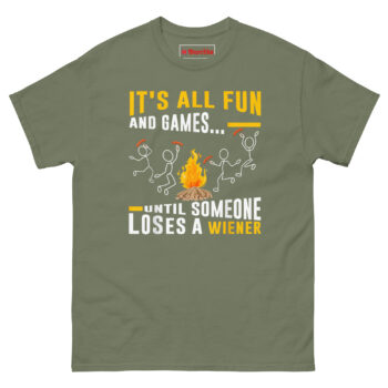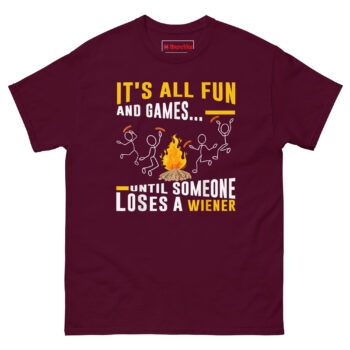 The It’s All Fun and Games Until Someone Loses Their Weiner T Shirt turns a classic camping mishap into wearable comedy. Made from 100% cotton with a comfortable classic fit, this shirt features a campfire scene where one unlucky stick figure drops their hot dog into the flames. It’s the perfect Campfire BBQ Graphic Tee and a Gift for Grill Masters Dads and Camping Lovers who don’t mind laughing at their own cooking disasters. Whether you’re flipping burgers or burning sausages, this tee keeps things lighthearted.