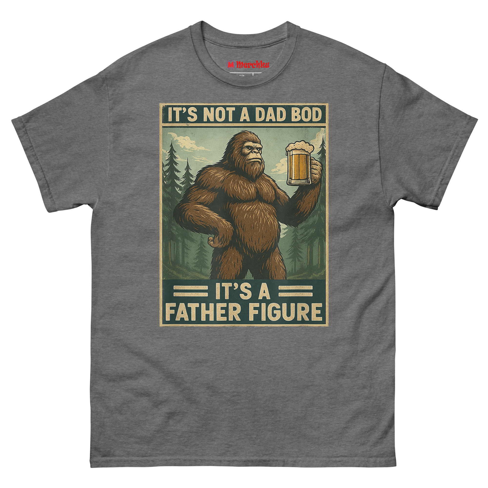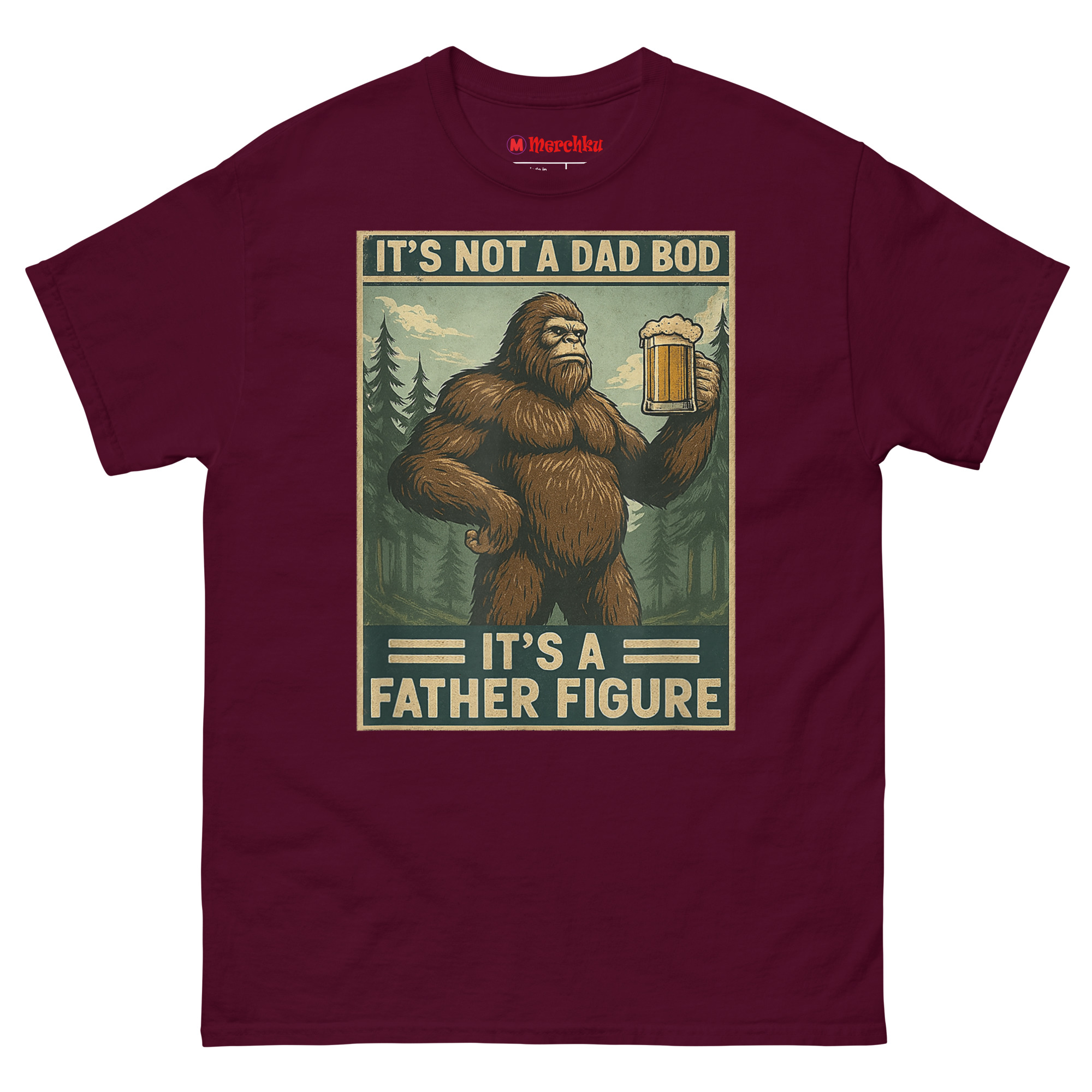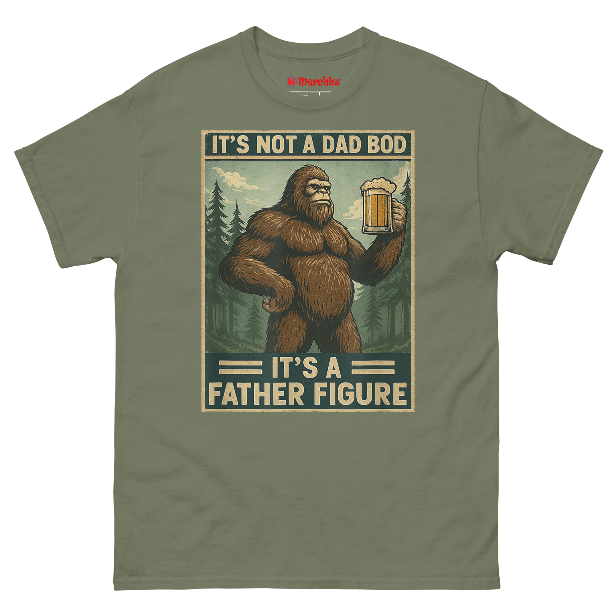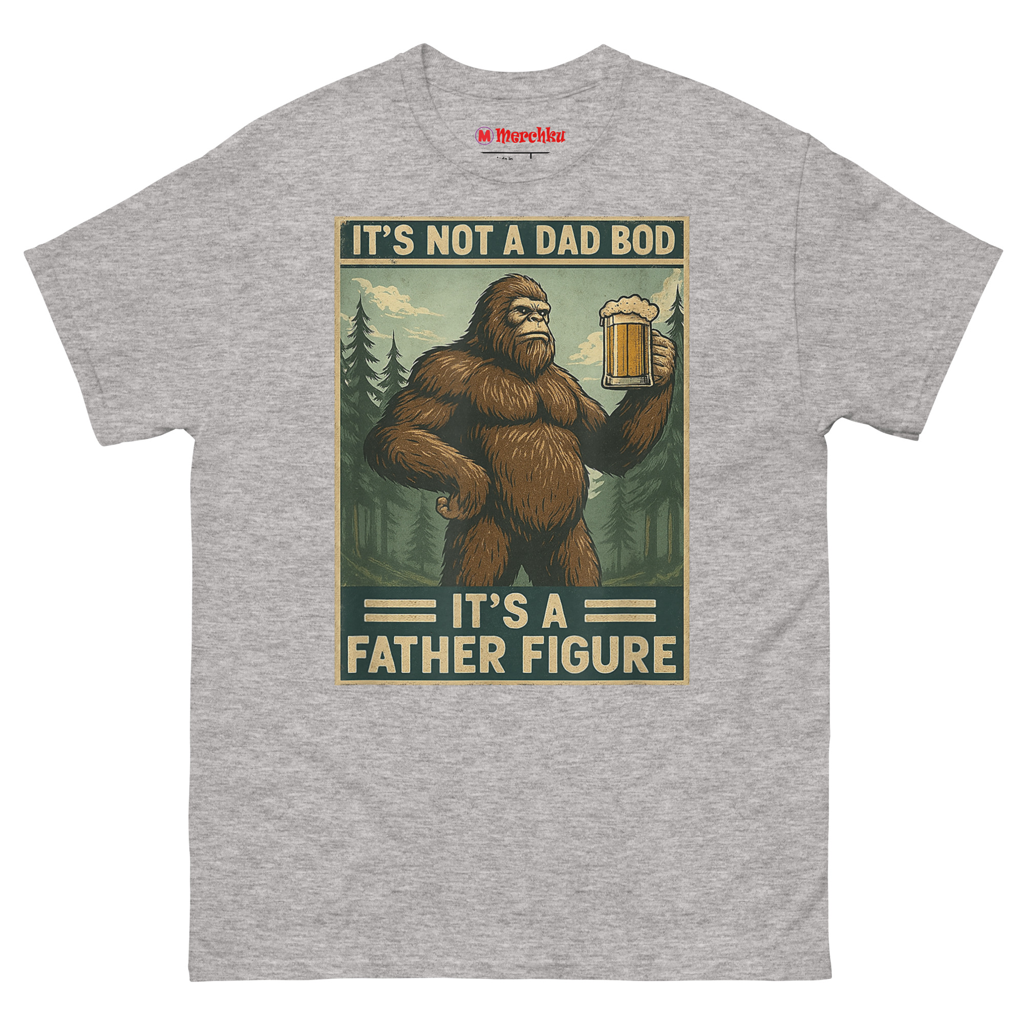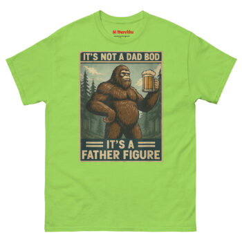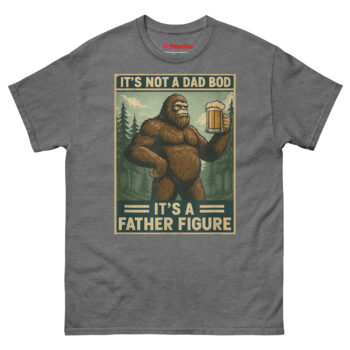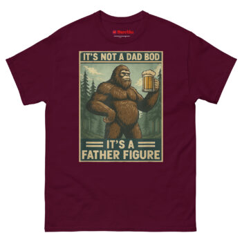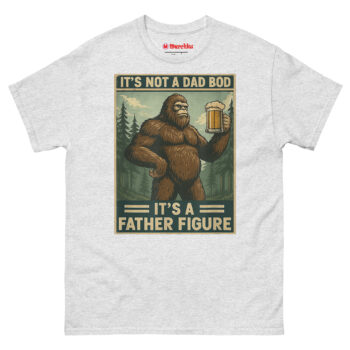 We started thinking about what represents something massive, wild, and completely comfortable in its own skin. The answer was obvious: Bigfoot. Sasquatch is a creature of legend big, hairy, and perfectly at home in the wilderness with a beer in his hand. By merging him with the “dad bod” conversation, we created a hilariously relatable avatar for the modern father. The distressed, muted color palette and retro poster border give it an authentic 1970s aesthetic. It’s body positivity masked in self-deprecating, hyper-masculine humor. This is the ultimate uniform for backyard BBQs, camping trips, and lazy Sundays. It’s one of the funniest novelty shirts for dads who know that being a father figure is about more than just appearance.