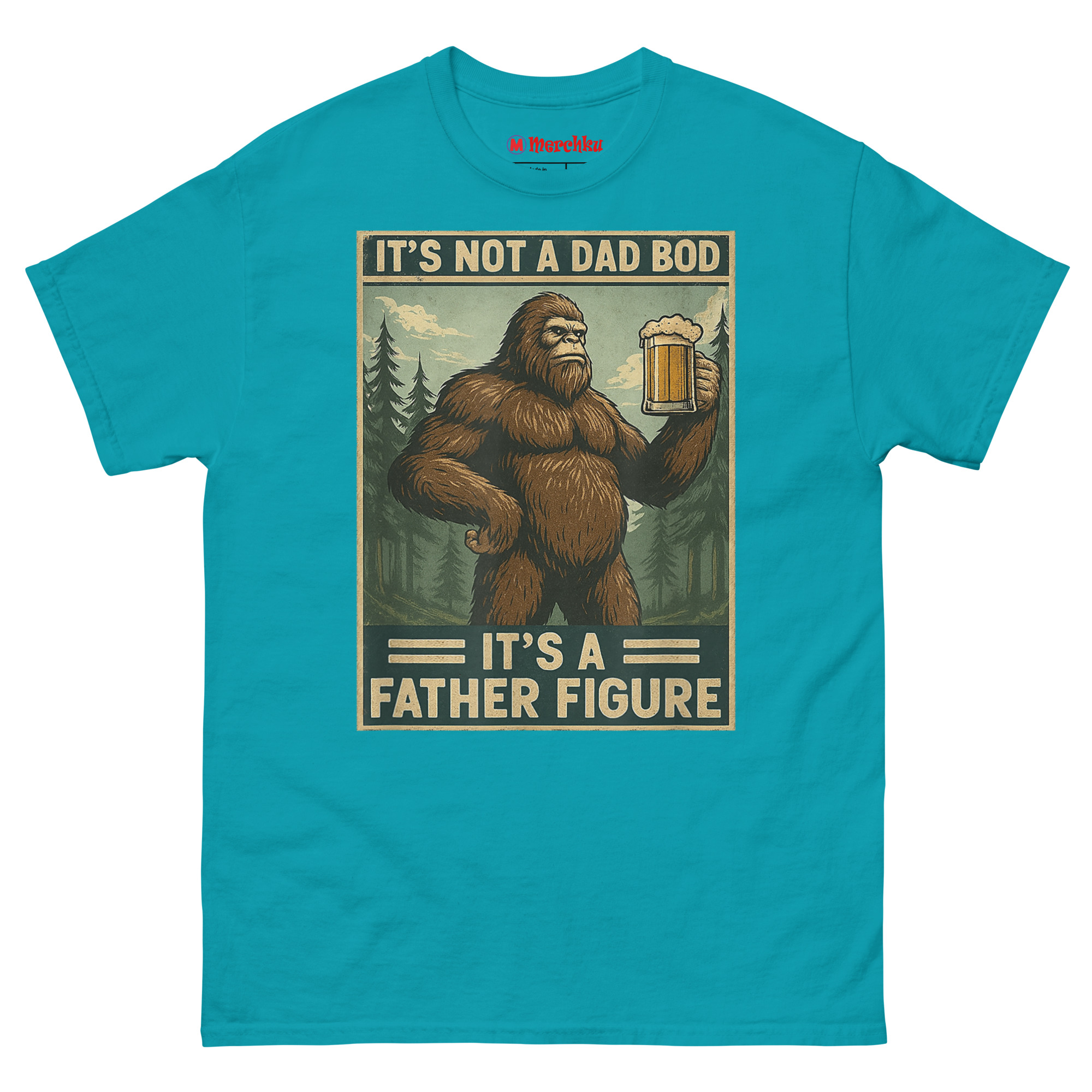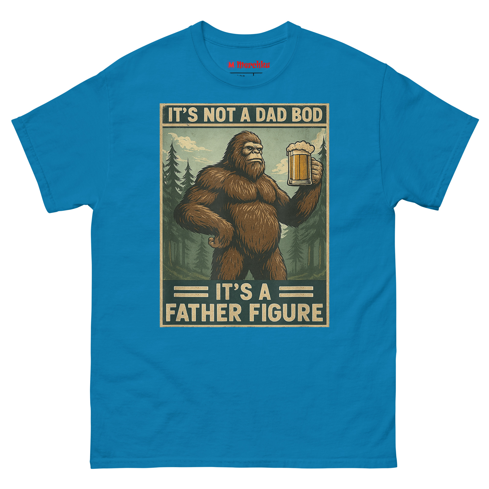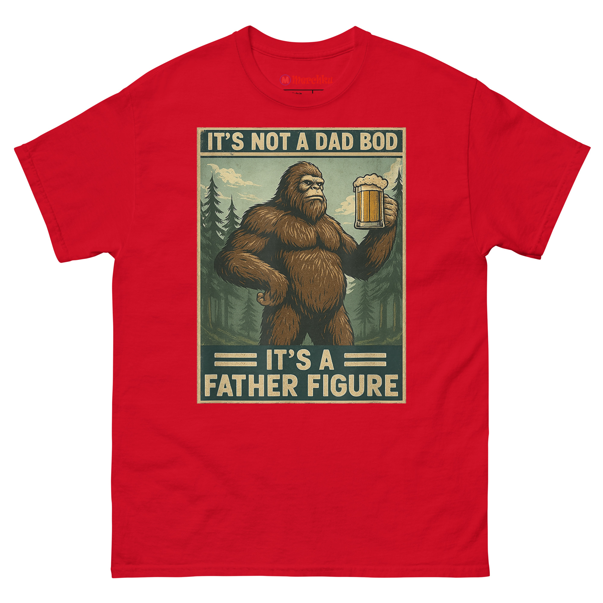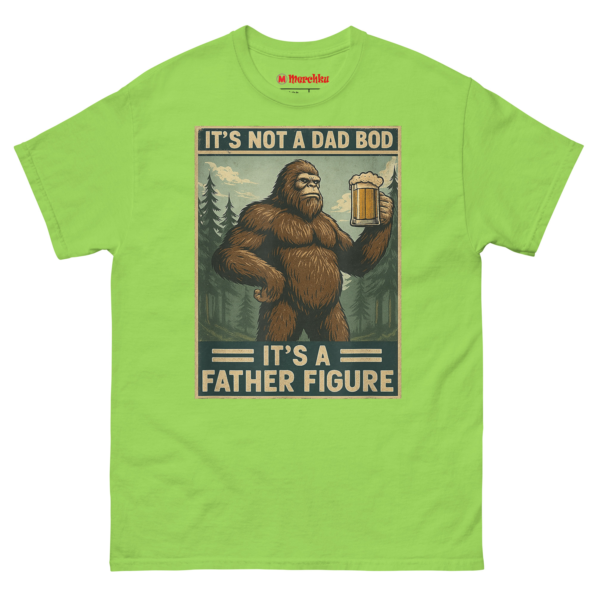 We started thinking about what represents something massive, wild, and completely comfortable in its own skin. The answer was obvious: Bigfoot. Sasquatch is a creature of legend big, hairy, and perfectly at home in the wilderness with a beer in his hand. By merging him with the “dad bod” conversation, we created a hilariously relatable avatar for the modern father. The distressed, muted color palette and retro poster border give it an authentic 1970s aesthetic. It’s body positivity masked in self-deprecating, hyper-masculine humor. This is the ultimate uniform for backyard BBQs, camping trips, and lazy Sundays. It’s one of the funniest novelty shirts for dads who know that being a father figure is about more than just appearance.