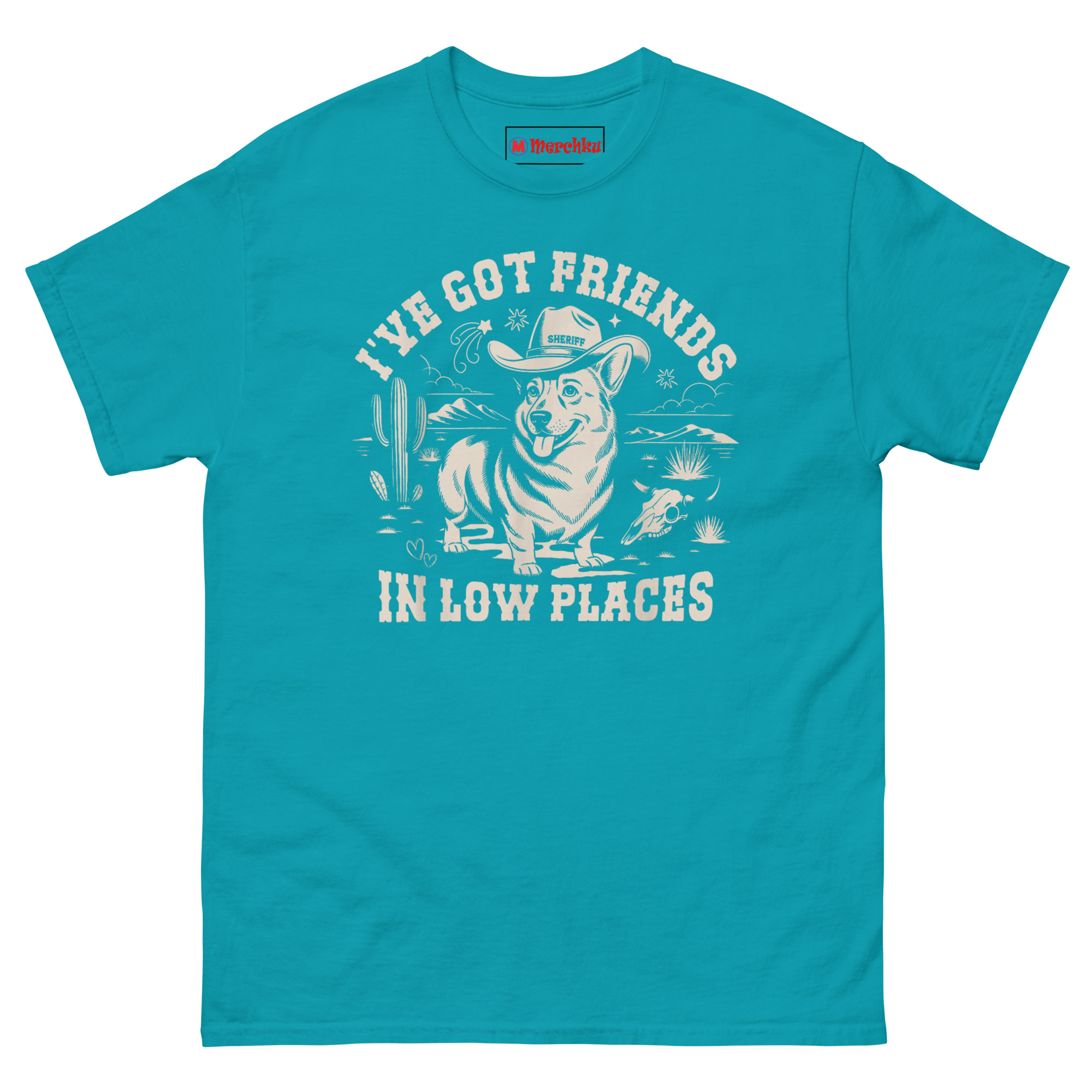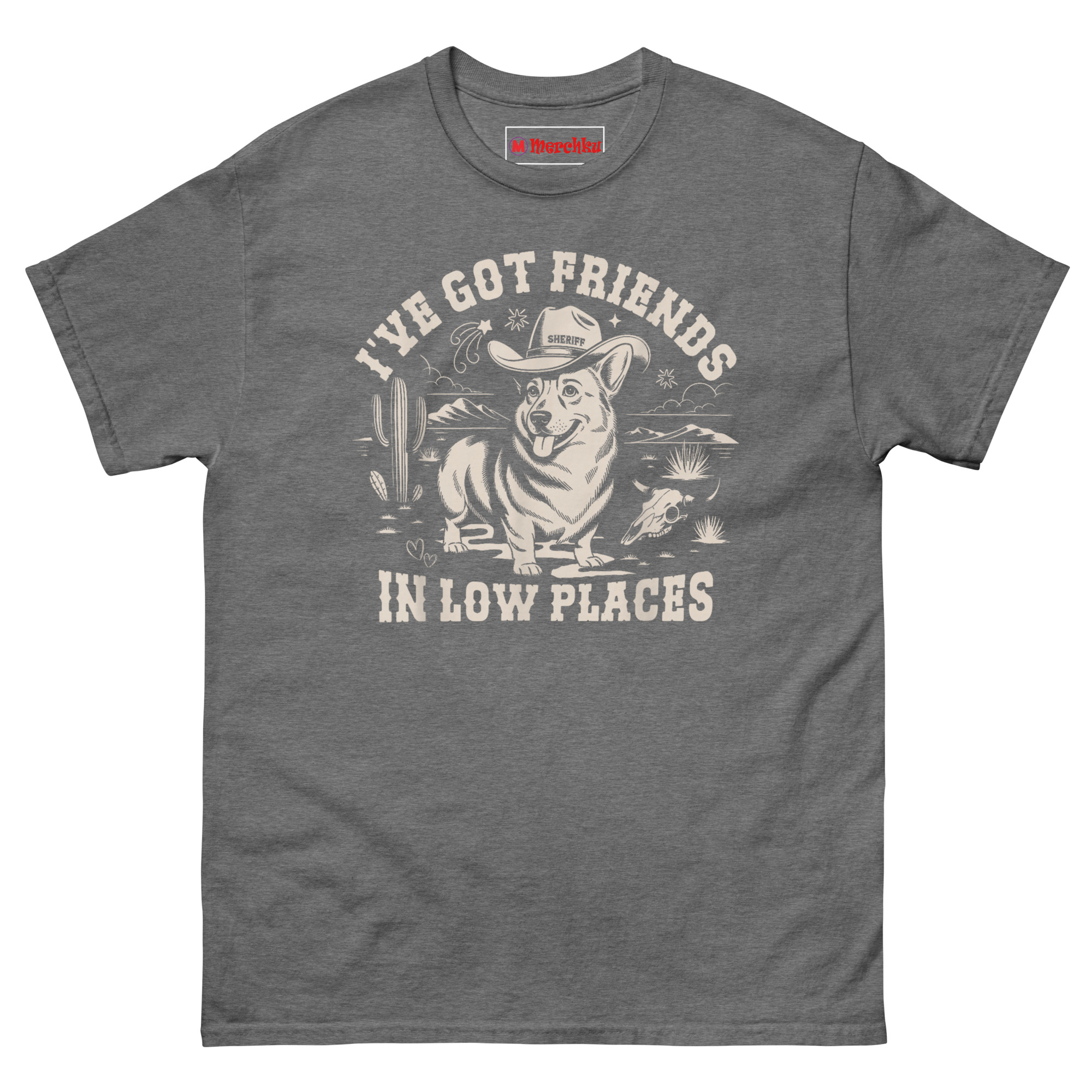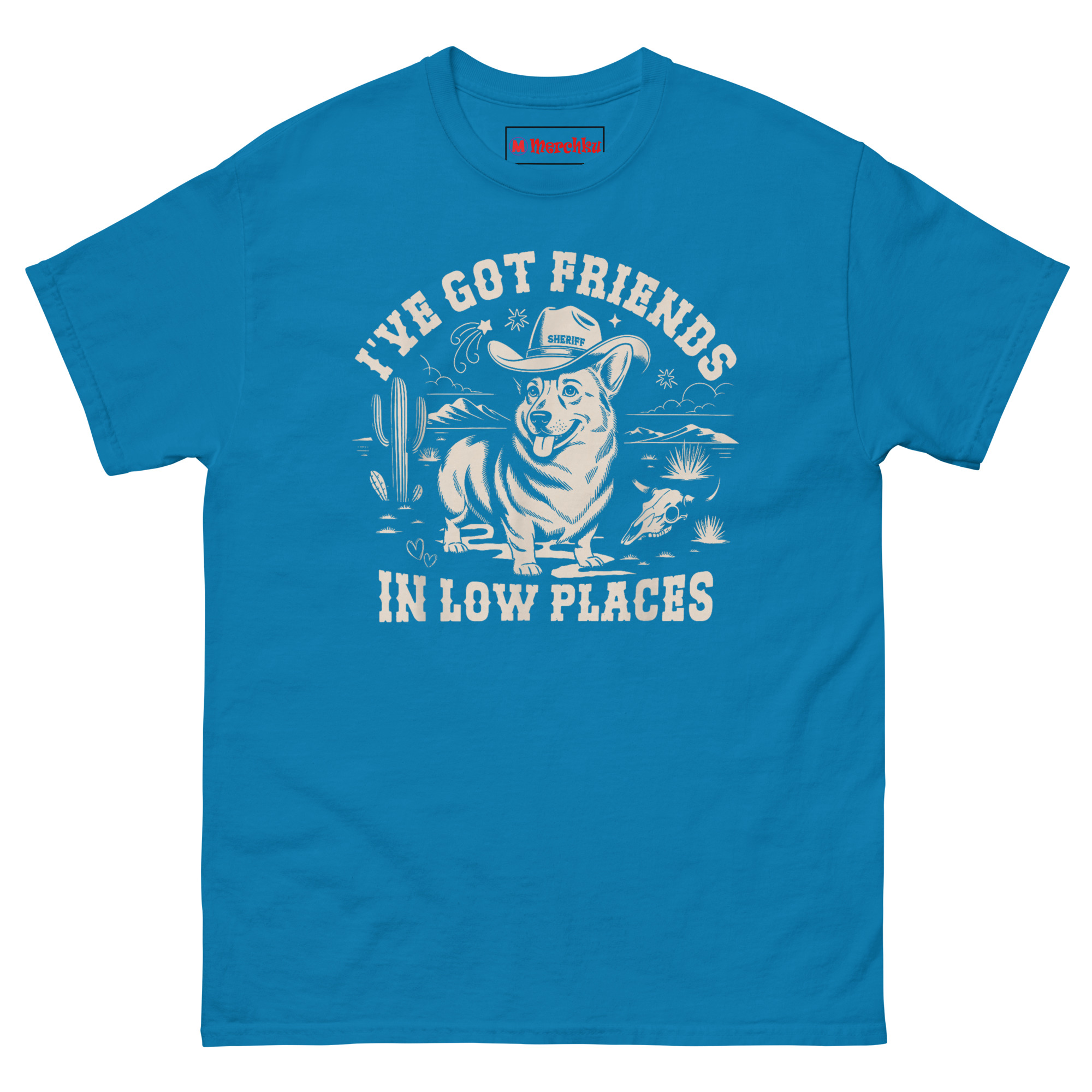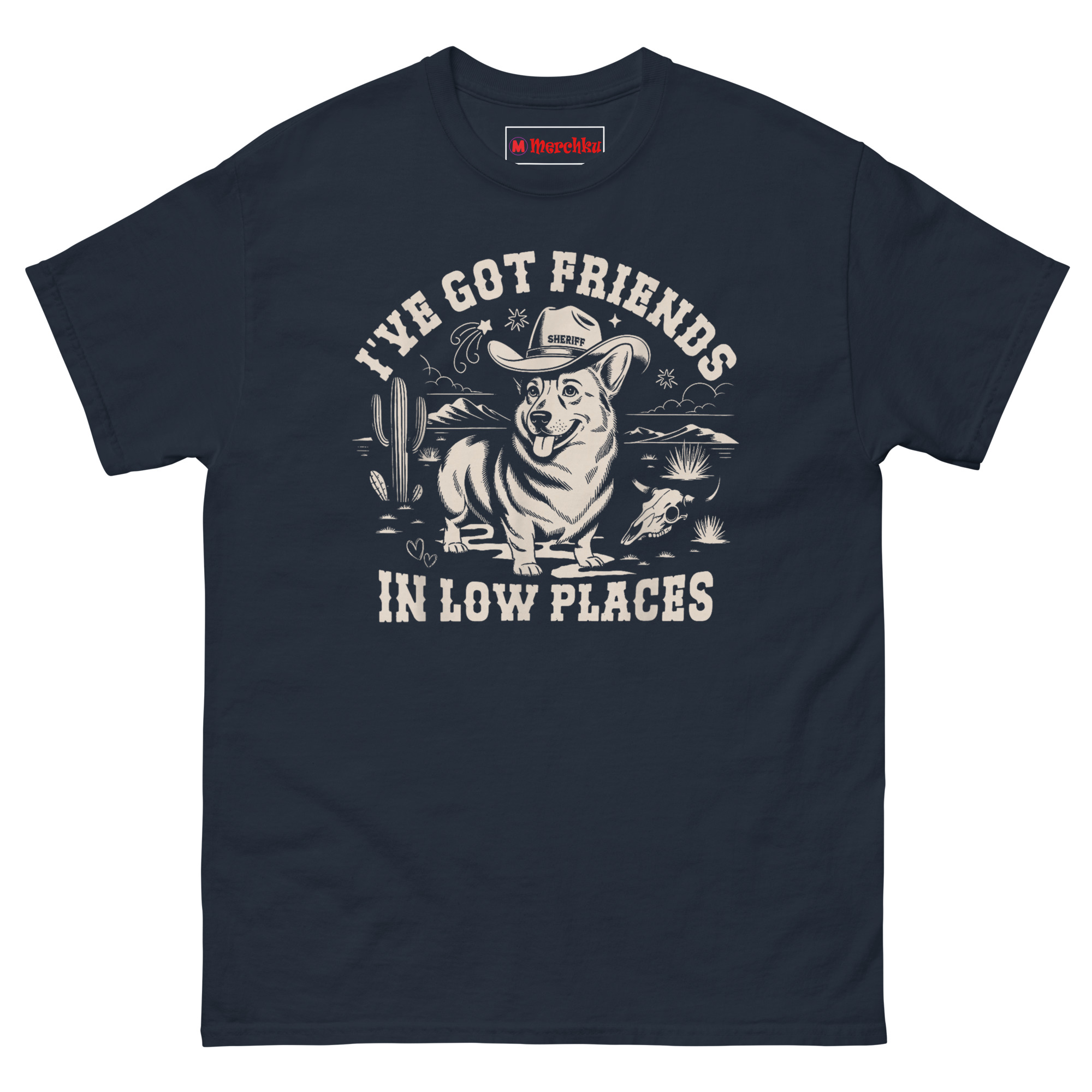 The I’ve Got Friends In Low Places T Shirt brings together country music nostalgia and Corgi humor in one unforgettable design. This tee features a cartoon Corgi wearing a sheriff’s cowboy hat, standing proudly in a desert landscape with cacti and a cow skull. Designed for country music fans, dog lovers, and anyone who appreciates a clever visual punchline.