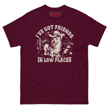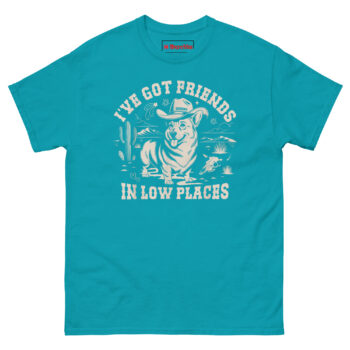 Long concert nights demand comfortable clothing. That is why we built I’ve Got Friends In Low Places T Shirt from 100% cotton that softens with every wash. The fabric breathes easily during two-stepping, tailgating, and sing-alongs. Double stitching at sleeves and bottom hem adds longevity for repeated wear. The classic cut allows freedom of movement without looking sloppy.
