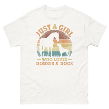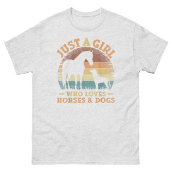 We designed Just A Girl Who Loves Horses and Dogs T Shirt for the girl who understands that the best company doesn’t always walk on two legs. The horse represents freedom, the miles of trail, the wind in her hair, the trust of a thousand-pound partner. The dog represents home, the warm greeting, the unwavering loyalty, the creature who’s simply glad you exist.