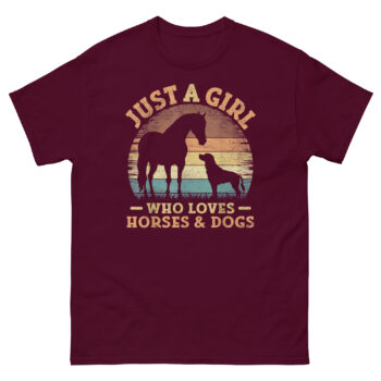 This is a warm, vintage-style graphic tee for the girl whose heart belongs to two kinds of loyal companions. The Just A Girl Who Loves Horses and Dogs T Shirt features a retro sunset with silhouettes of a horse and dog standing together. It’s the ultimate animal lover gift for anyone who finds peace in the barn and joy at her feet.