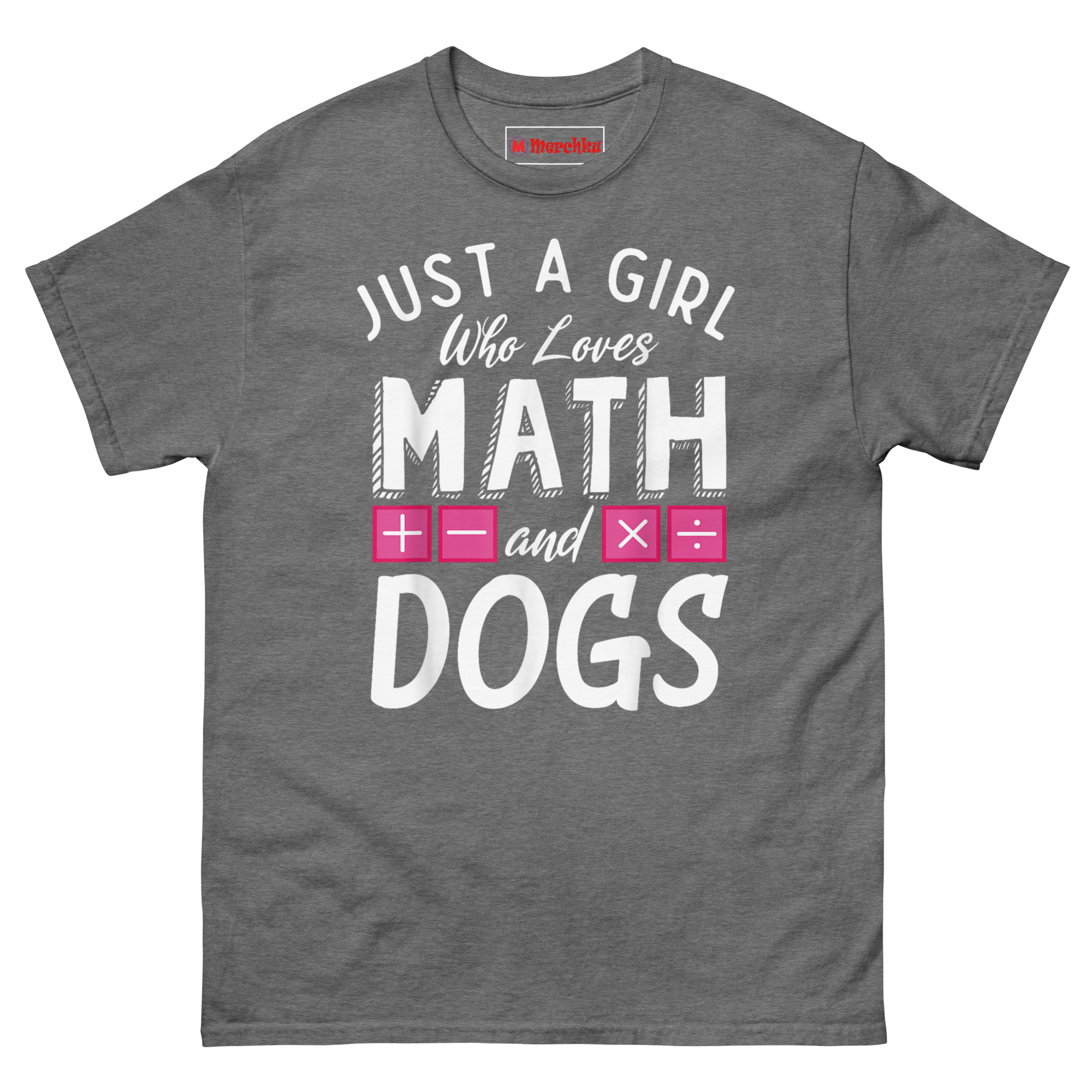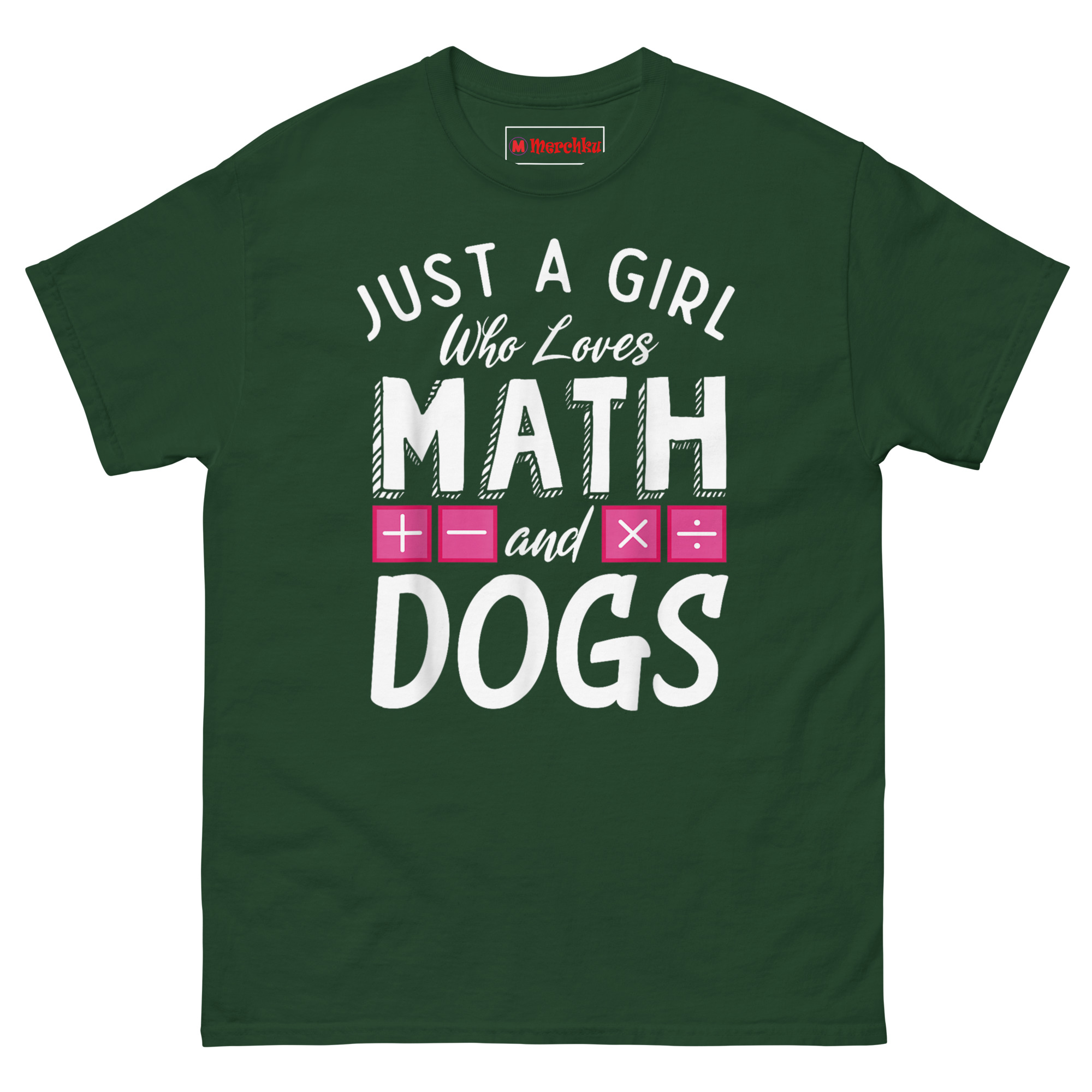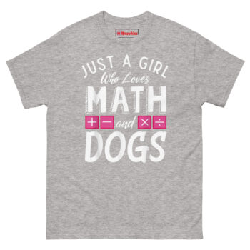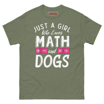 Just a Girl who loves Math and Dogs T Shirt design came from watching a friend juggle her graduate-level calculus homework with a Golden Retriever puppy constantly nudging her elbow for attention. She laughed and said, “I guess I am just a girl who loves math and dogs, no shame in either.” That moment stuck with us.