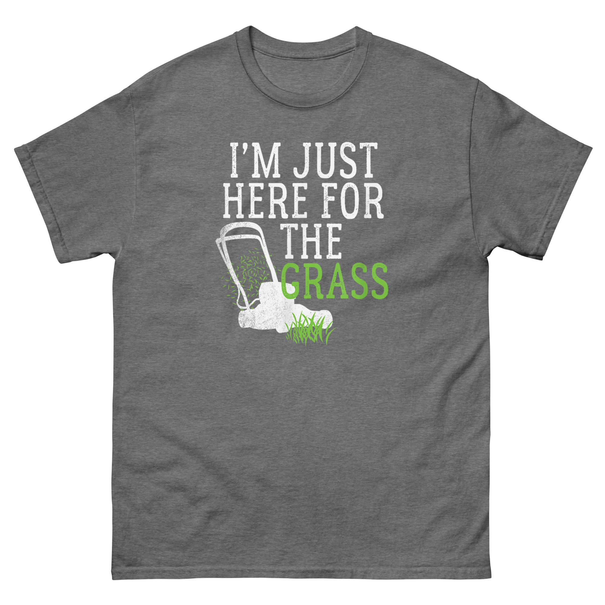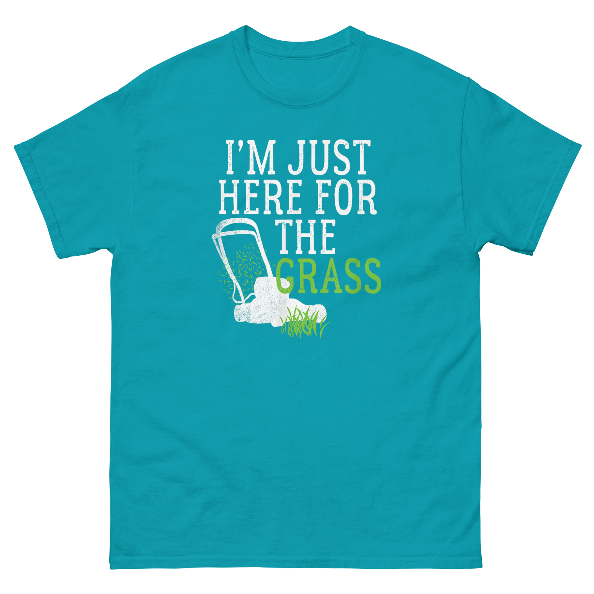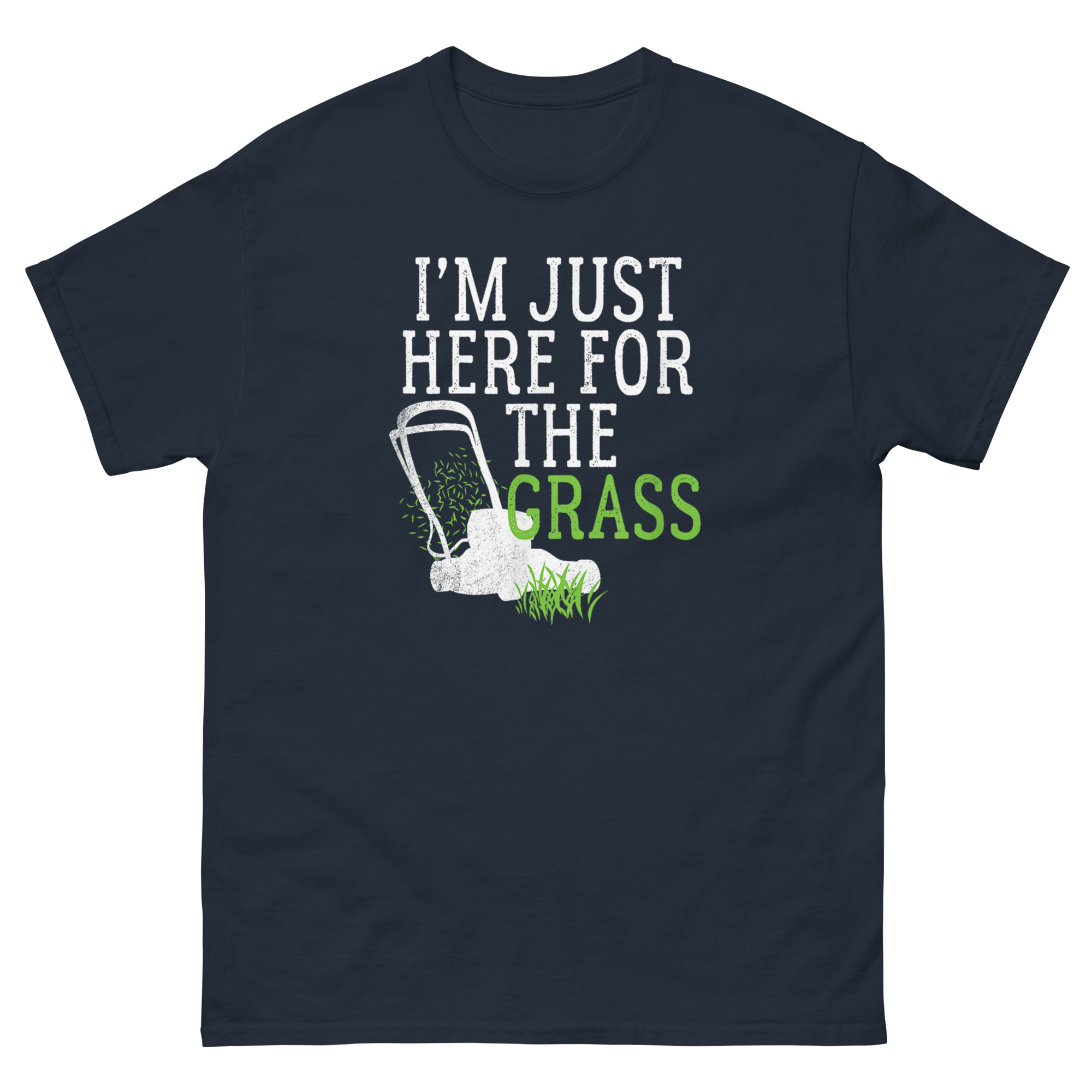 I'm Just Here For The Grass funny lawn mowers t-shirt with push mower graphic and green lettering.