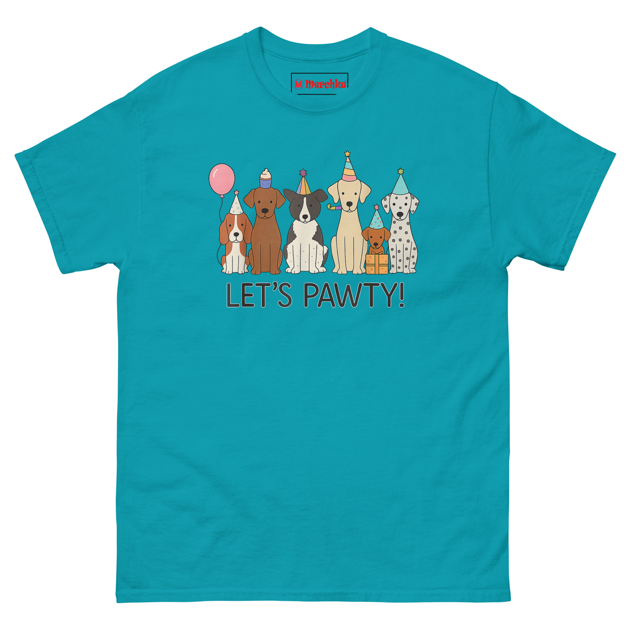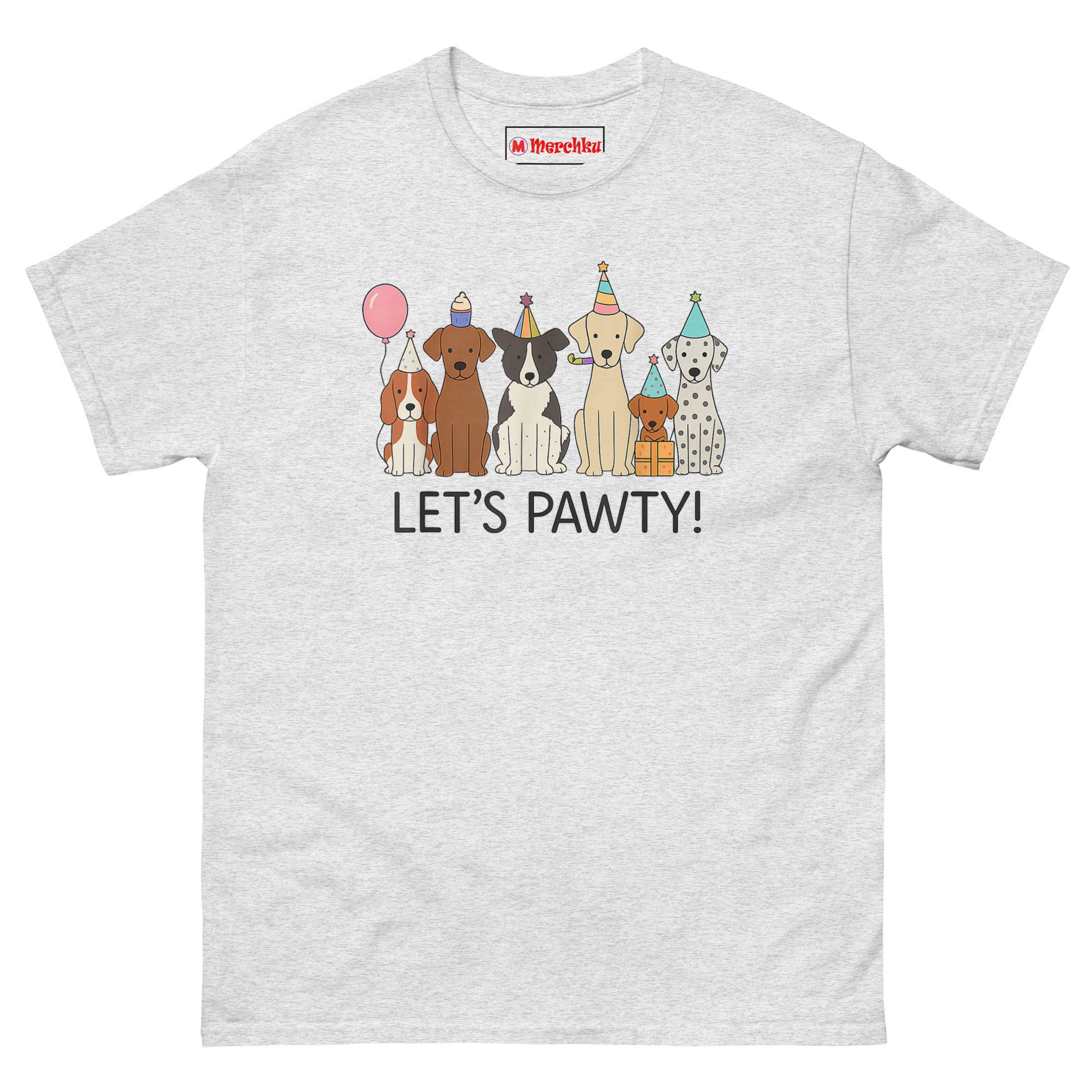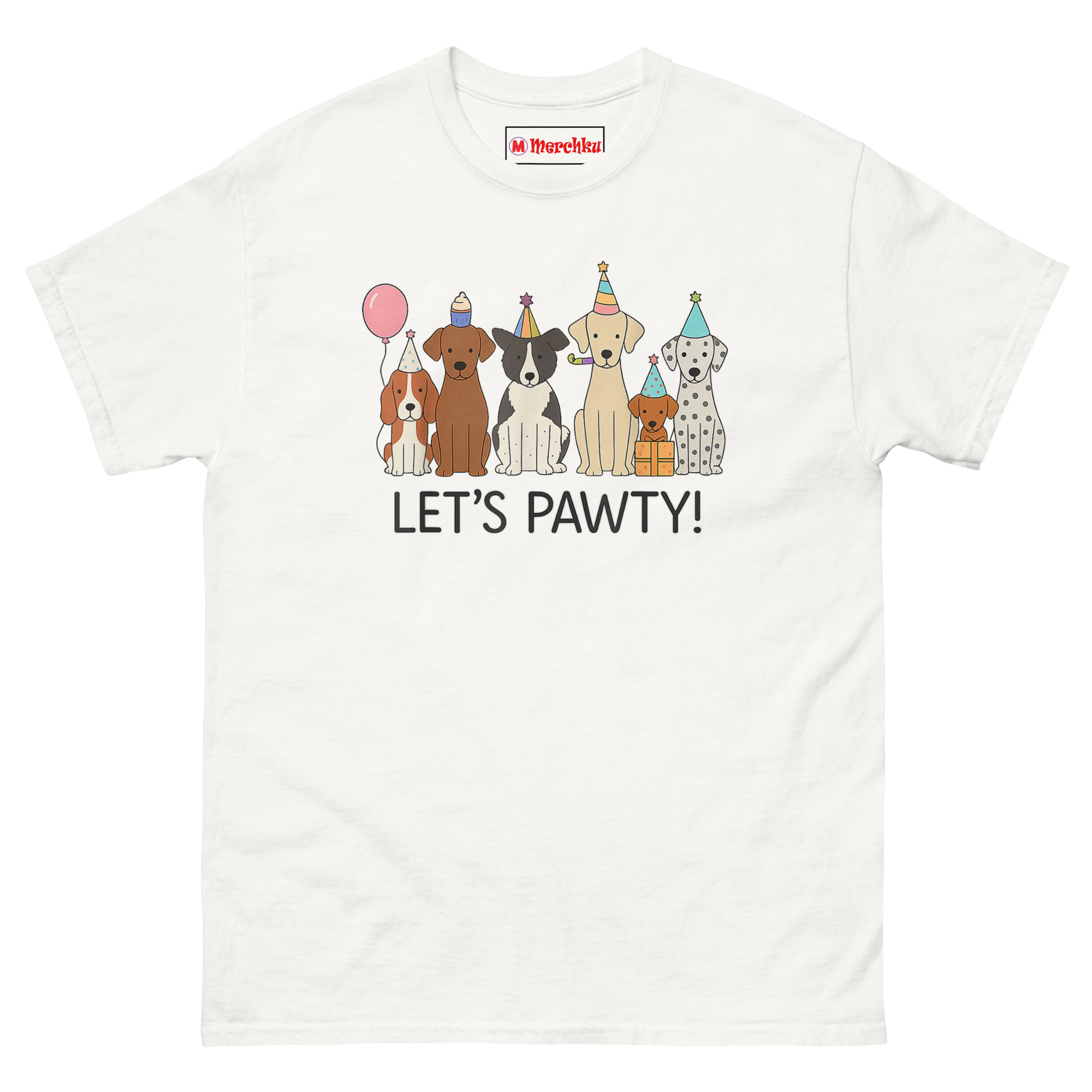 The artist wanted to capture that universal appreciation. From left to right, you’ll spot a Beagle, a Chocolate Lab, a Border Collie, a Golden Retriever holding a party blower, a Dachshund perched happily on a gift box, and a spotted Dalmatian. Each one wears a unique striped party hat with a star on top. A pink balloon floats near the Beagle, adding to the festive mood. Below the whole crew, the words “LET’S PAWTY!” sit in a clean, modern font that ties the scene together. It’s a celebration where every dog is invited.
