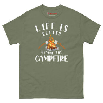 Life Is Better Around The Campfire Shirt it’s 100% cotton, the fabric breathes easily on warm hiking afternoons but still holds enough weight to feel substantial. The classic cut leaves room through the chest and shoulders without looking baggy. Tubular construction means no itchy side seam rubbing against your skin. For a Cozy campfire gathering shirt for wilderness lovers, this one handles the shift from sunny trail to chilly evening fire without feeling stiff or papery.