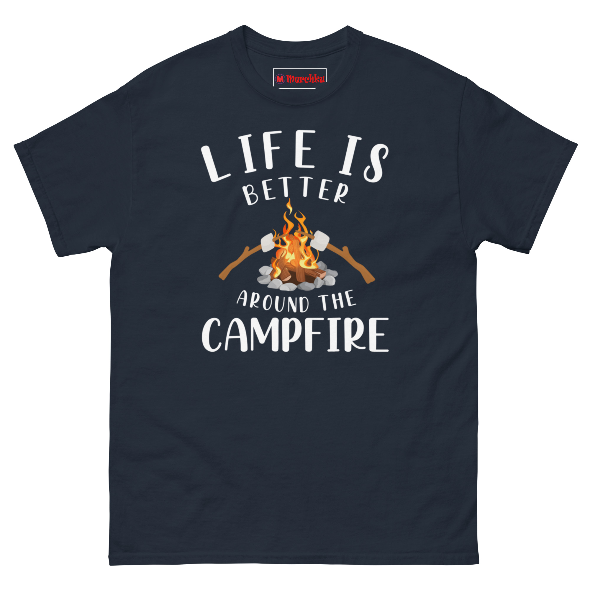 So the Funny camping quote apparel for outdoor trips became this: “Life Is Better Around The Campfire” arched like smoke lifting. The grey river stones and logs underneath feel solid, while the orange flames stay bright. Two marshmallows meet in the heat, not burning, not raw. That’s the sweet spot we all wait for. Life Is Better Around The Campfire Shirt it’s nostalgia for summer camp, but also a nod to the Friday night fire you build in your own ring. No filters. No rush.