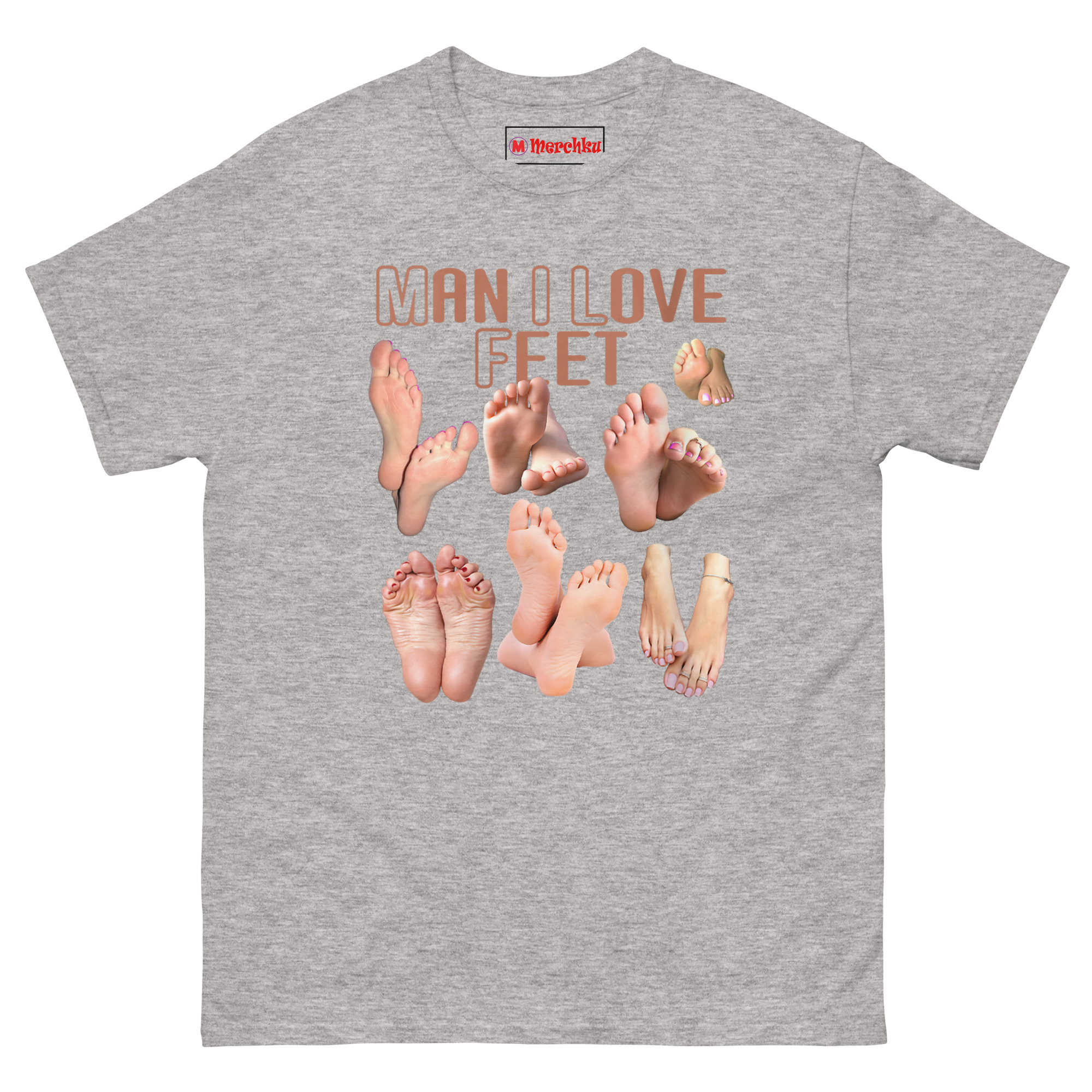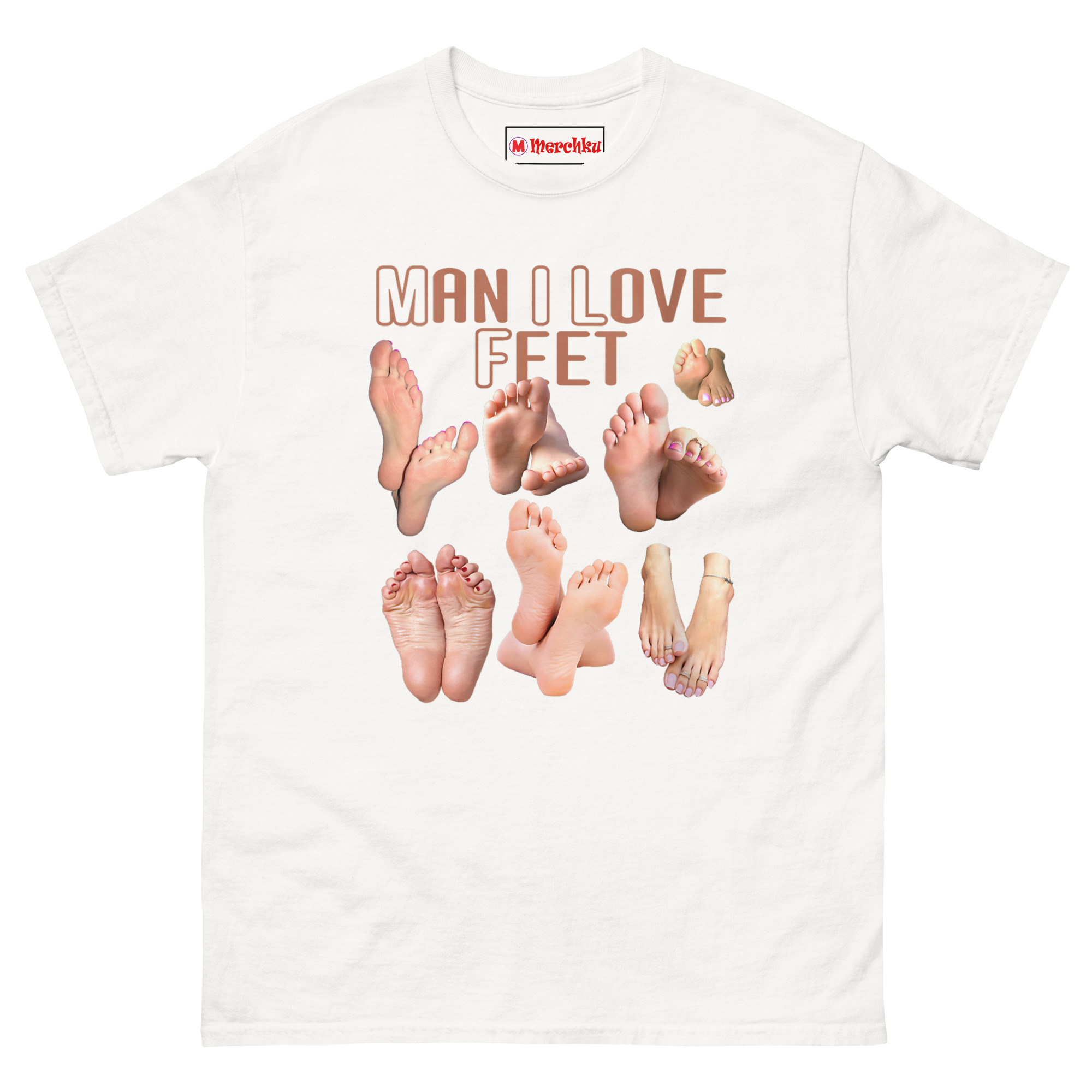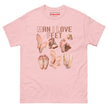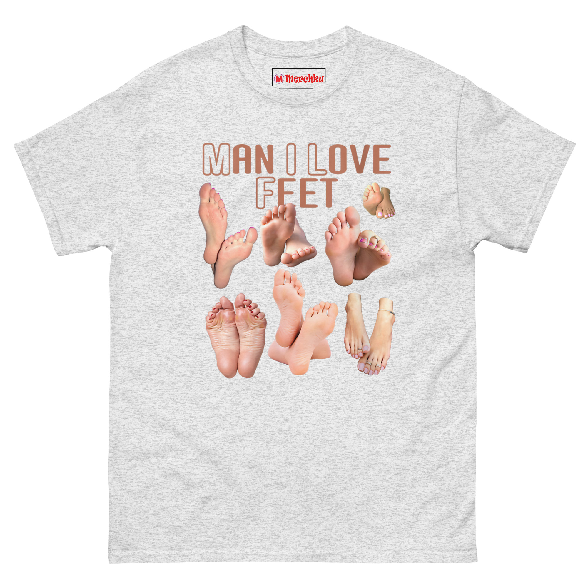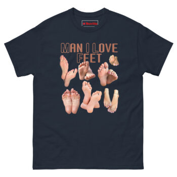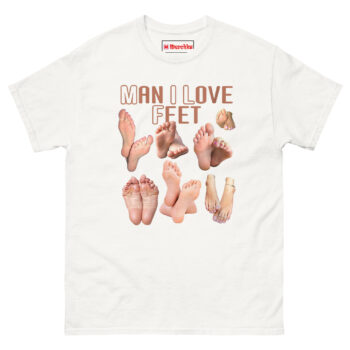 This idea started during a late-night internet rabbit hole where someone shared the classic acronym setup. We realized the potential for maximum discomfort and laughter by taking it in the most unexpected direction possible. The text at the top announces “MAN I LOVE FEET” in bold capitalized letters with skin-toned outline, leaving no doubt about the declaration. Below it, six high-resolution photographs show feet from every angle, soles, toes, arches, painted nails. The clinical presentation makes it funnier. It looks almost scientific, like a podiatry textbook gone wrong. What seemed like one thing becomes an unapologetic celebration of something people usually avoid discussing. This is edgy meme apparel for the person who lives for awkward silences followed by uncontrollable laughter.