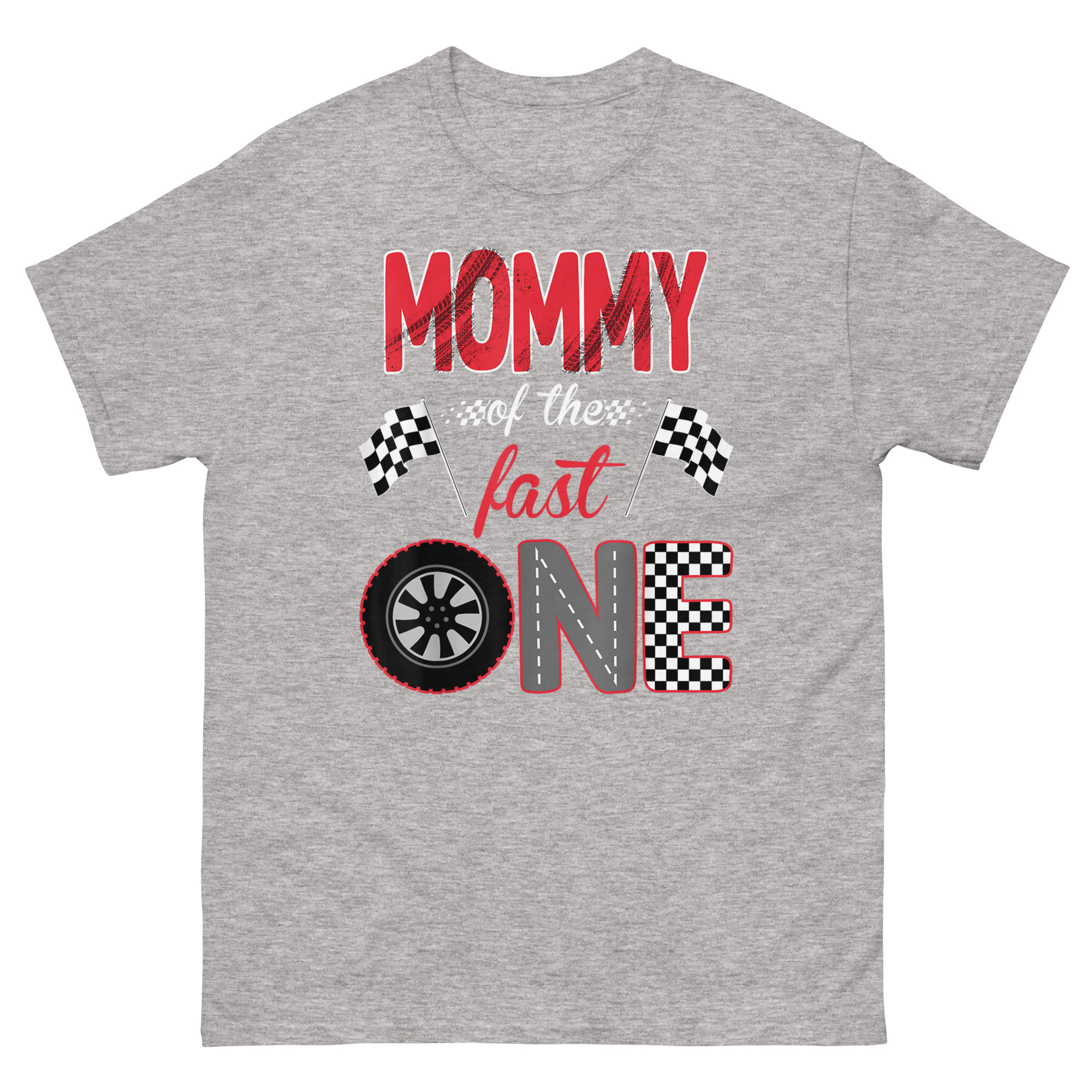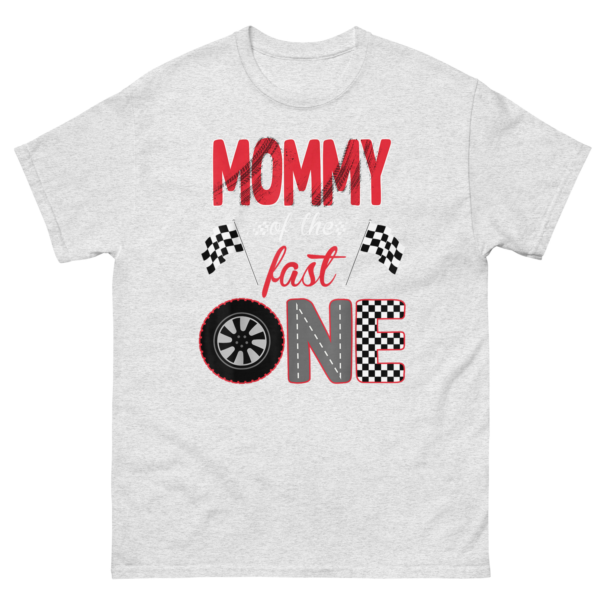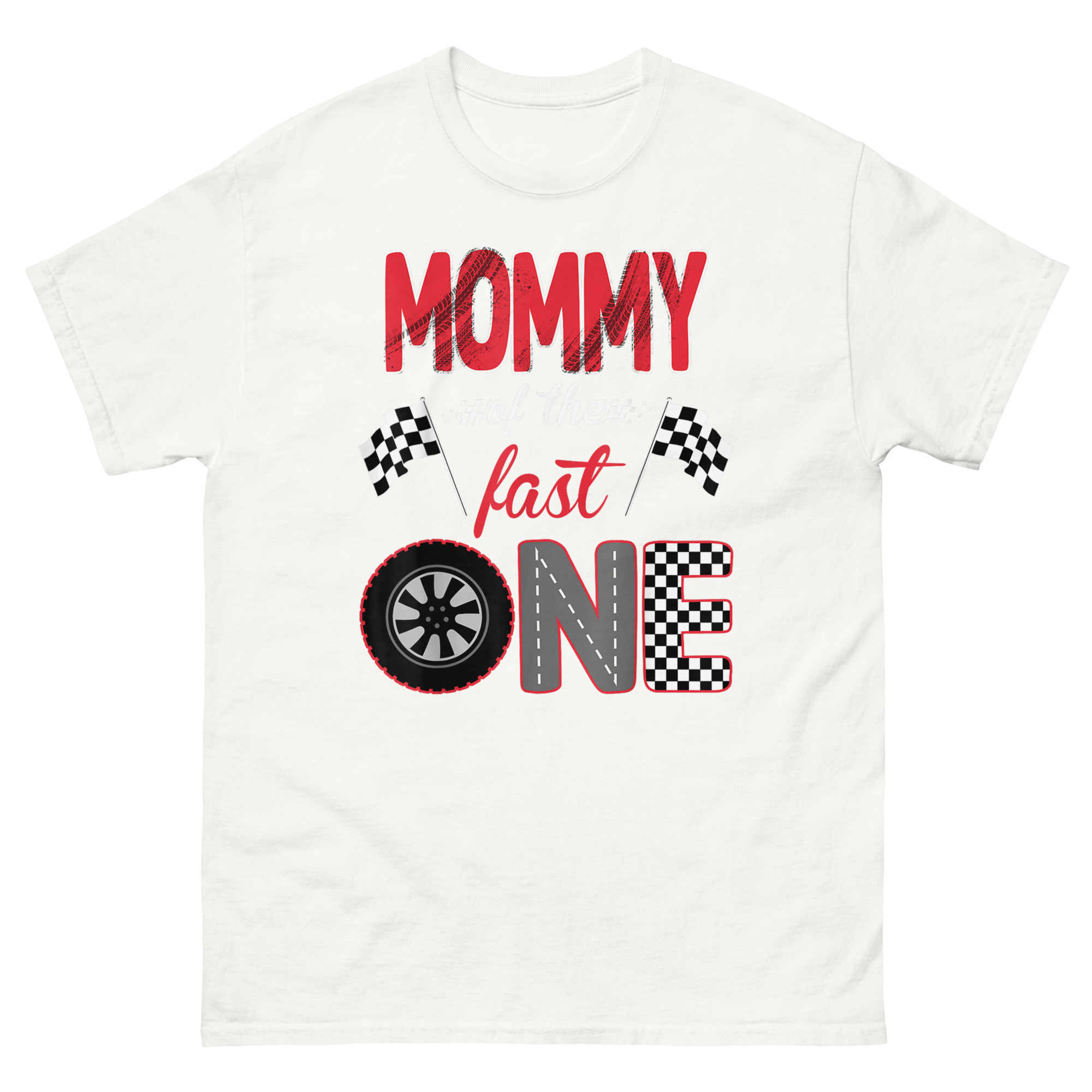 - Creative Details: Mommy Of The Fast One T Shirt It goes beyond basic text with tire treads, asphalt roads, and checkered patterns woven right into the letters.
