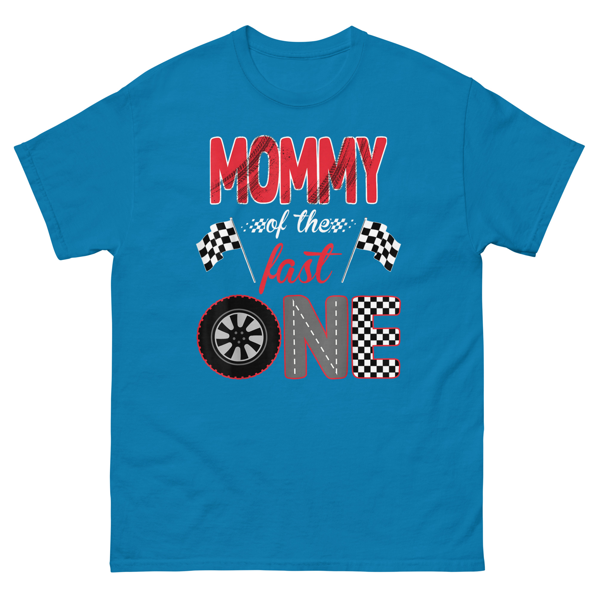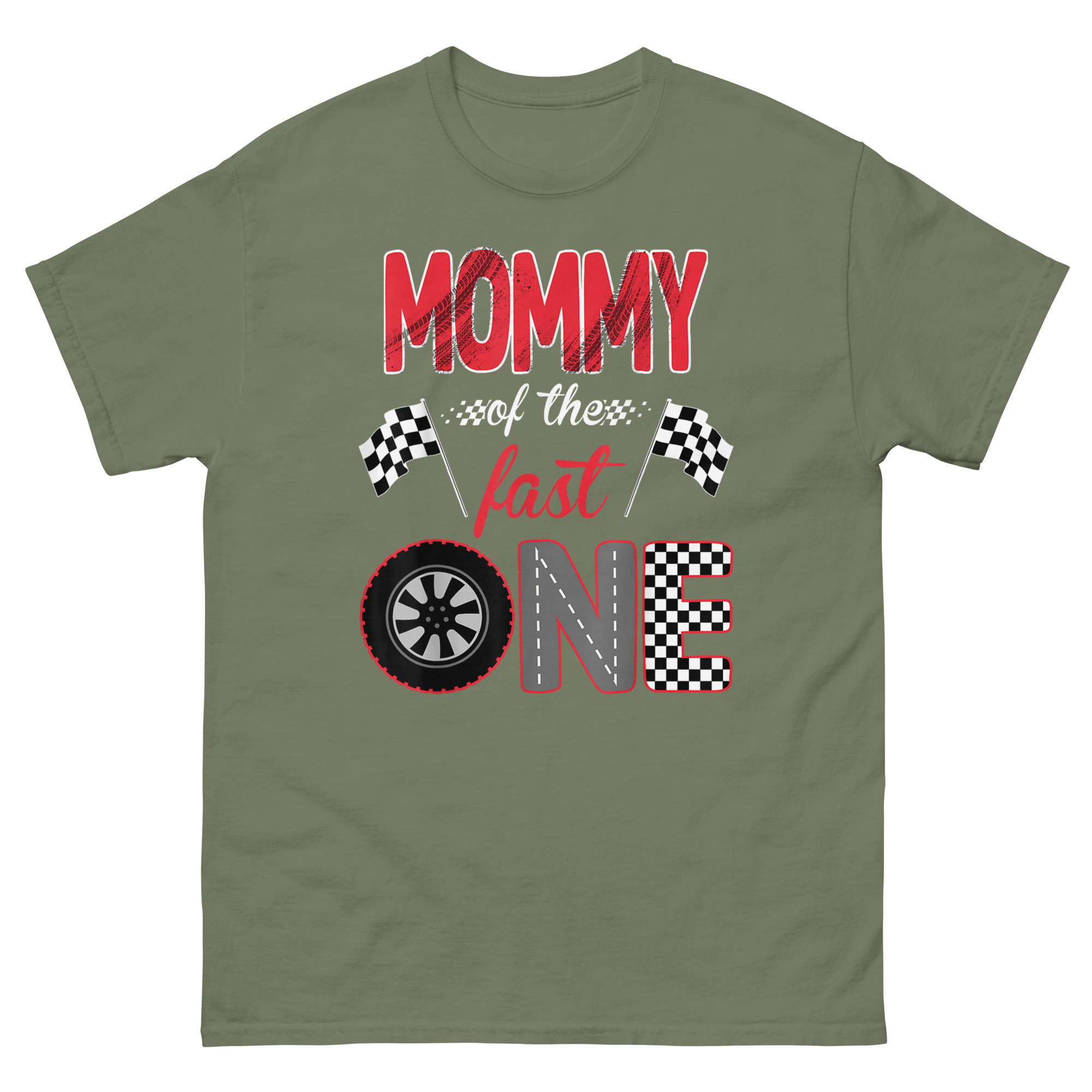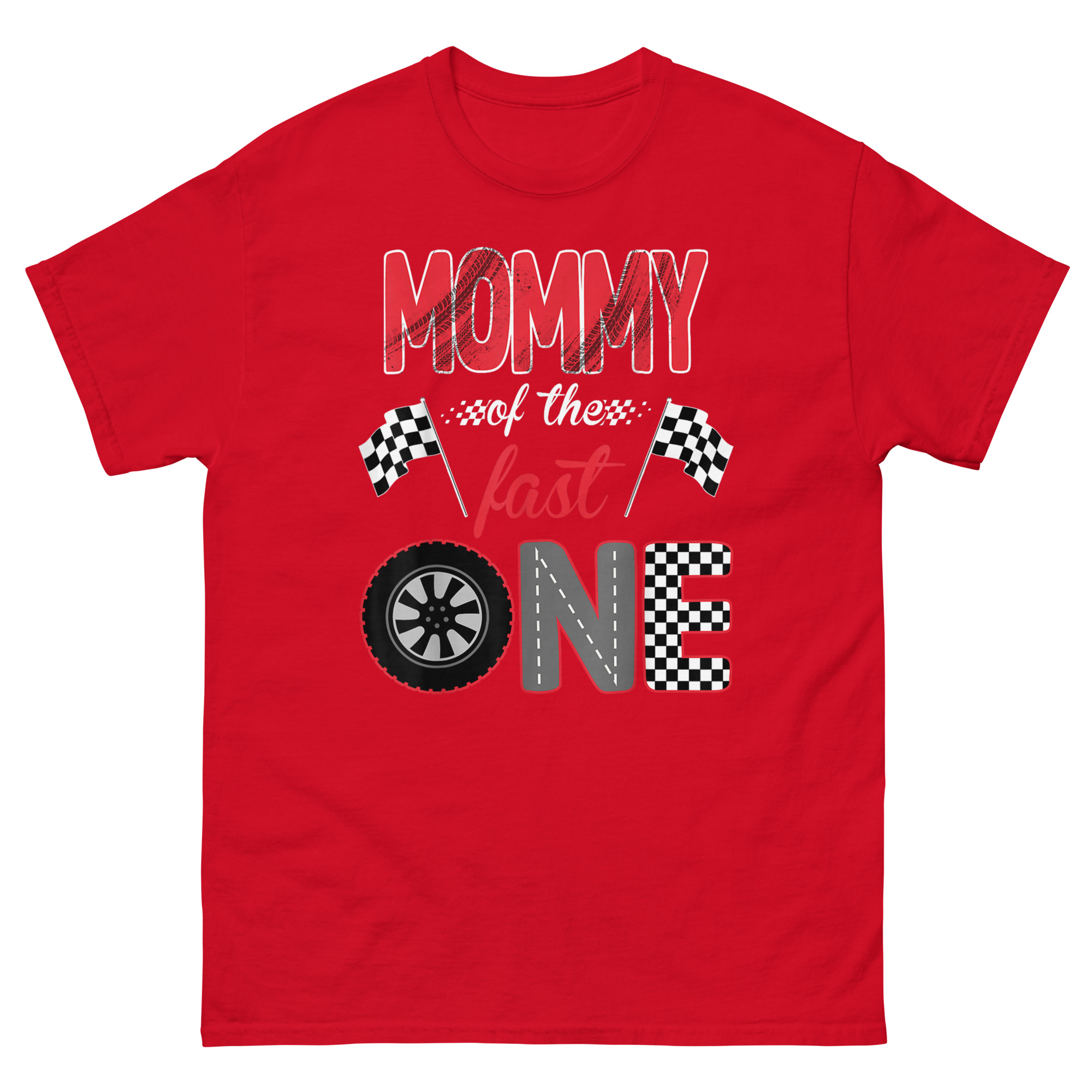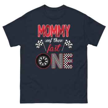 - Creative Details: Mommy Of The Fast One T Shirt It goes beyond basic text with tire treads, asphalt roads, and checkered patterns woven right into the letters.