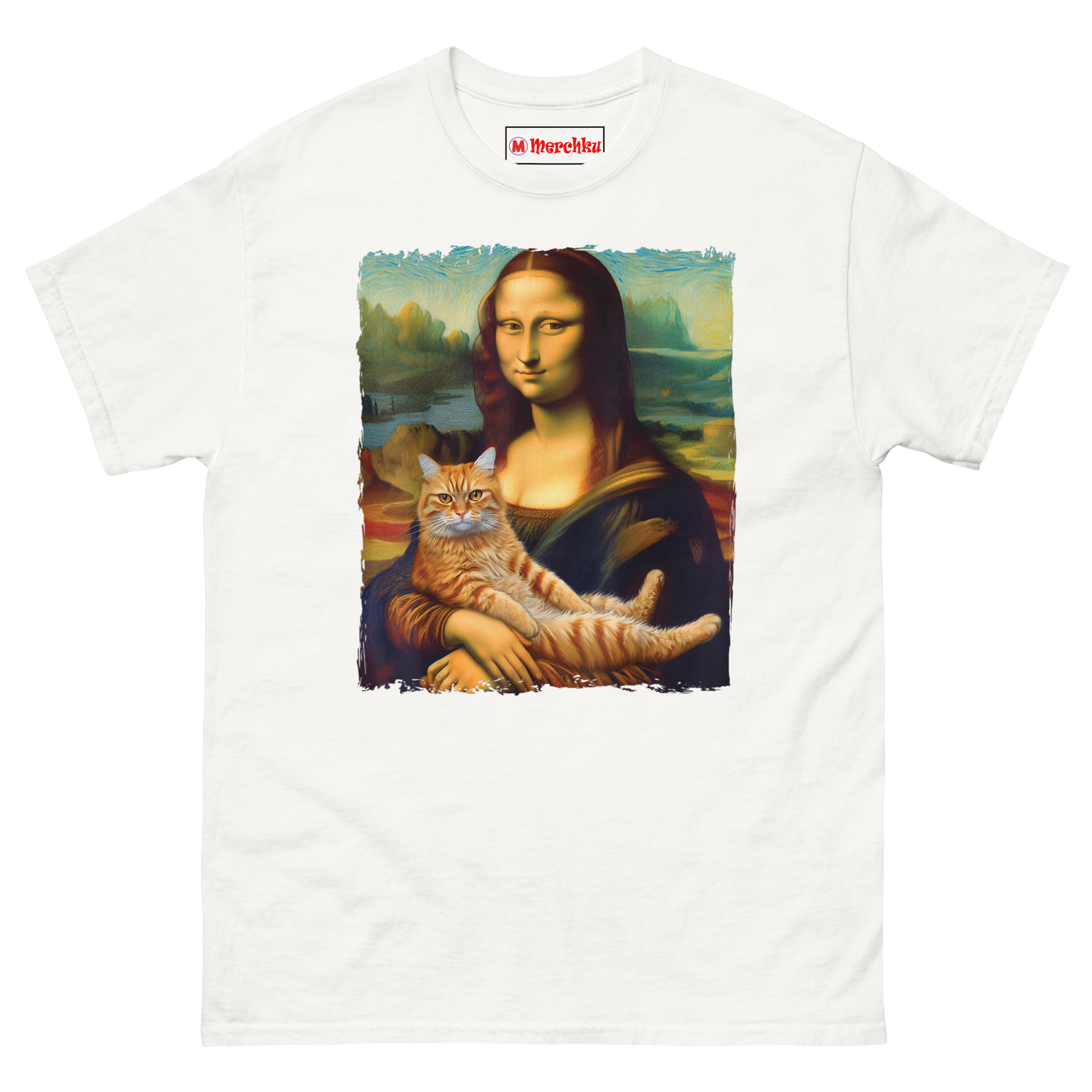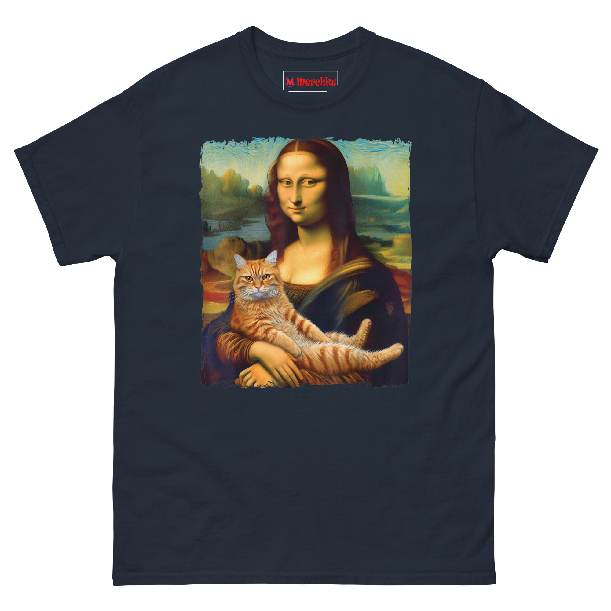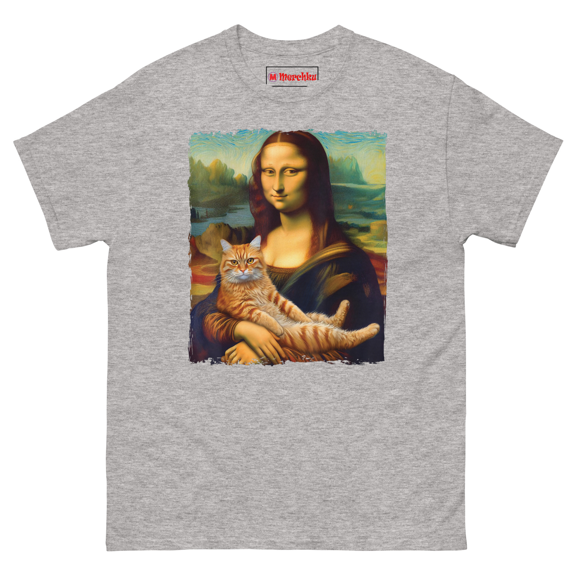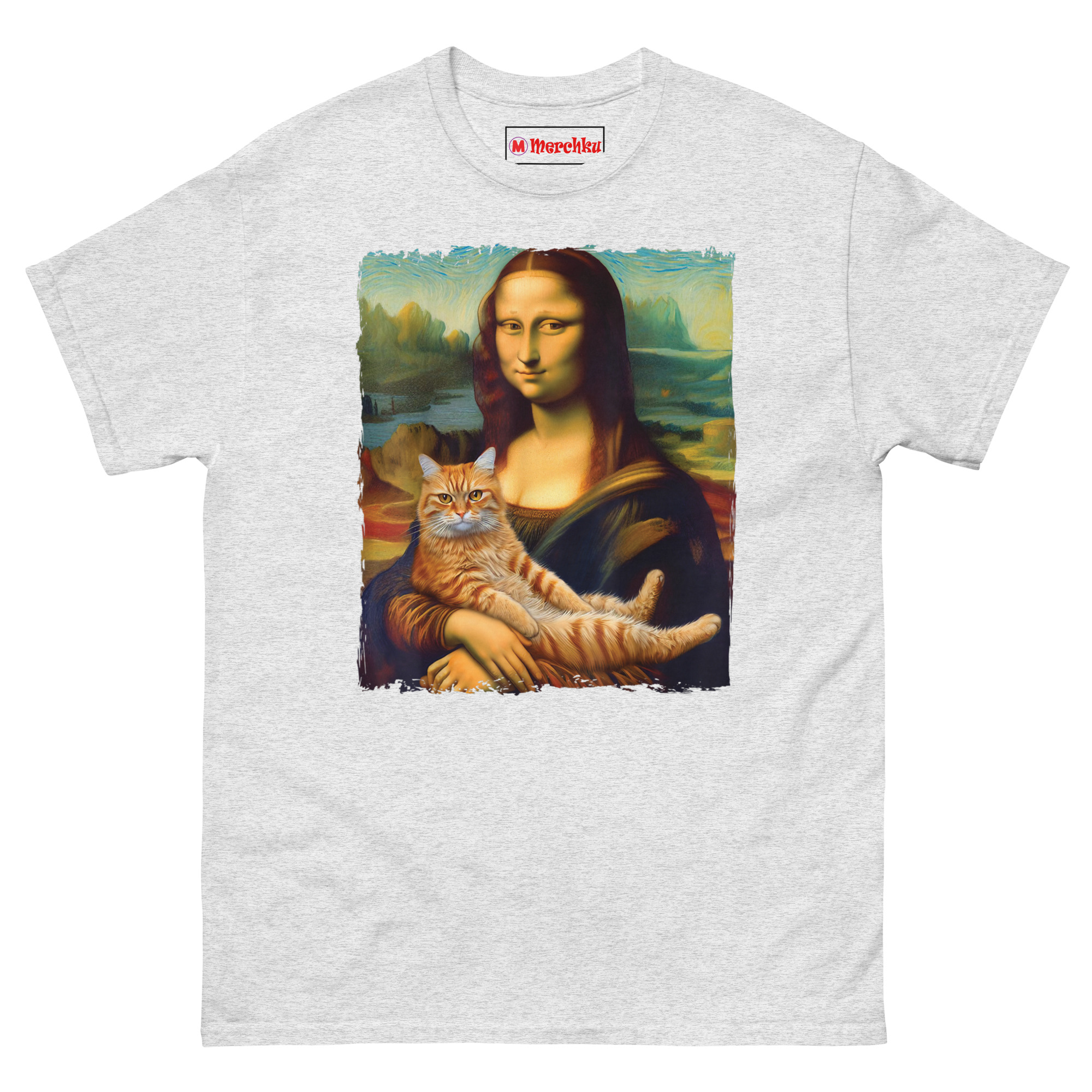 The idea for Mona Lisa Holding Cat T Shirt came from a visit to the Louvre. Standing in front of the actual Mona Lisa, surrounded by hundreds of tourists holding up phones, I started thinking about what would actually make her smile that way. The painting is famous for her enigmatic expression, half serene, half mysterious. Art historians have debated it for centuries. But the answer, I realized, is much simpler. She is smiling because she is a cat person. That thought stuck with me. We took the original painting, with its soft sfumato blending and atmospheric mountain background, and added the one thing that makes any painting better: a cat. The ginger tabby sits in her arms, relaxed and a little smug, mirroring her expression perfectly. The idea is that even a 16th-century noblewoman would have found joy in a purring lap cat. This shirt is for anyone who believes that art history and cat culture belong together.