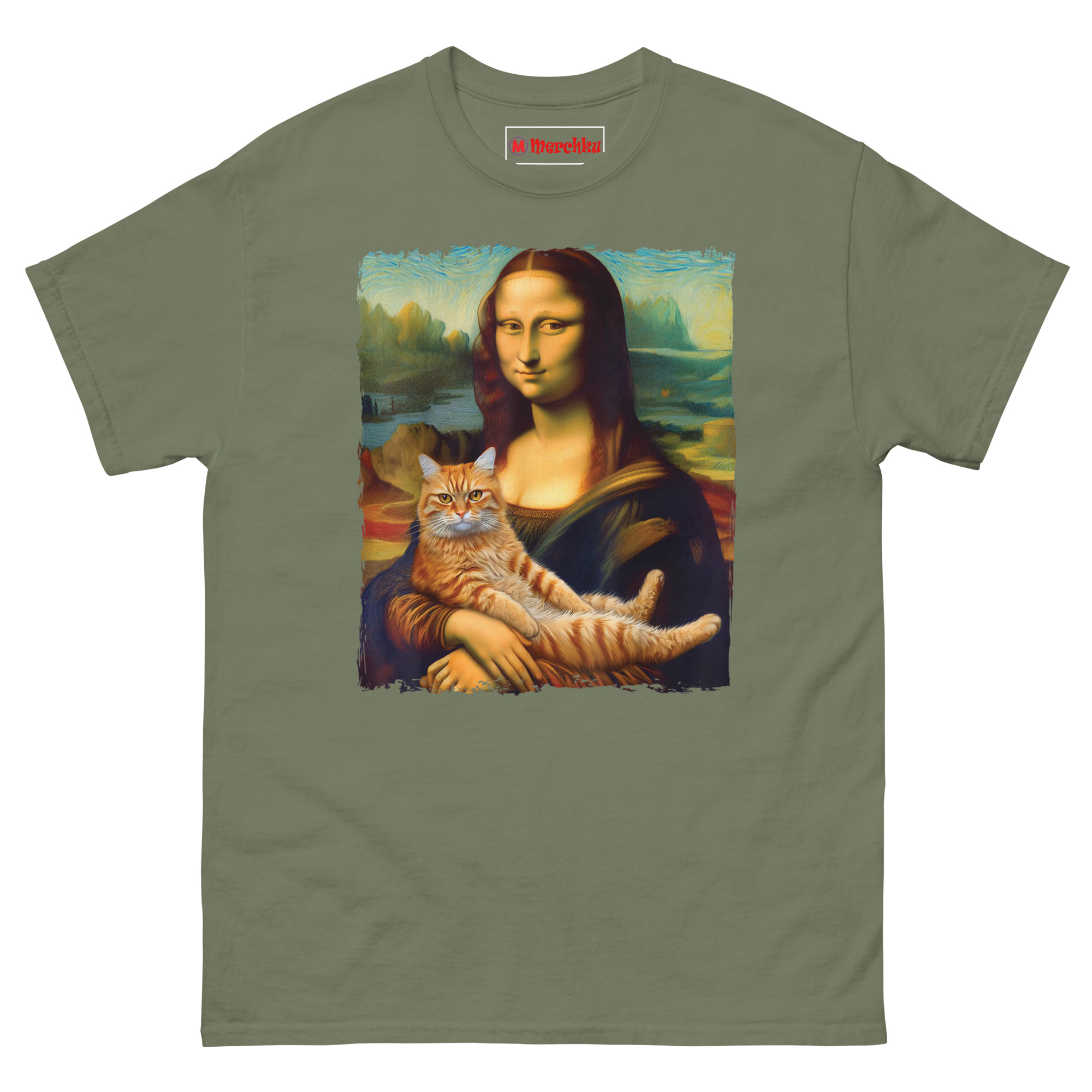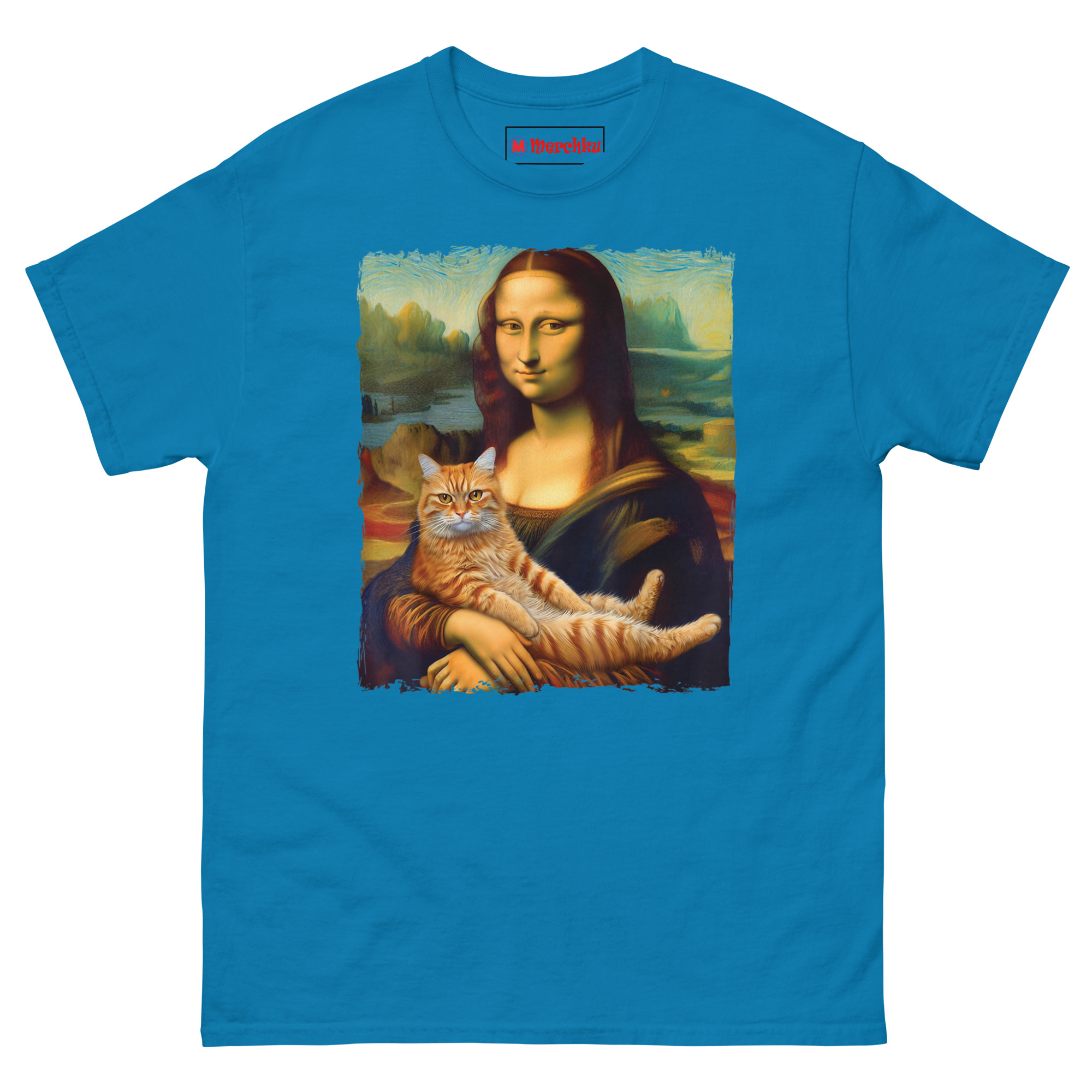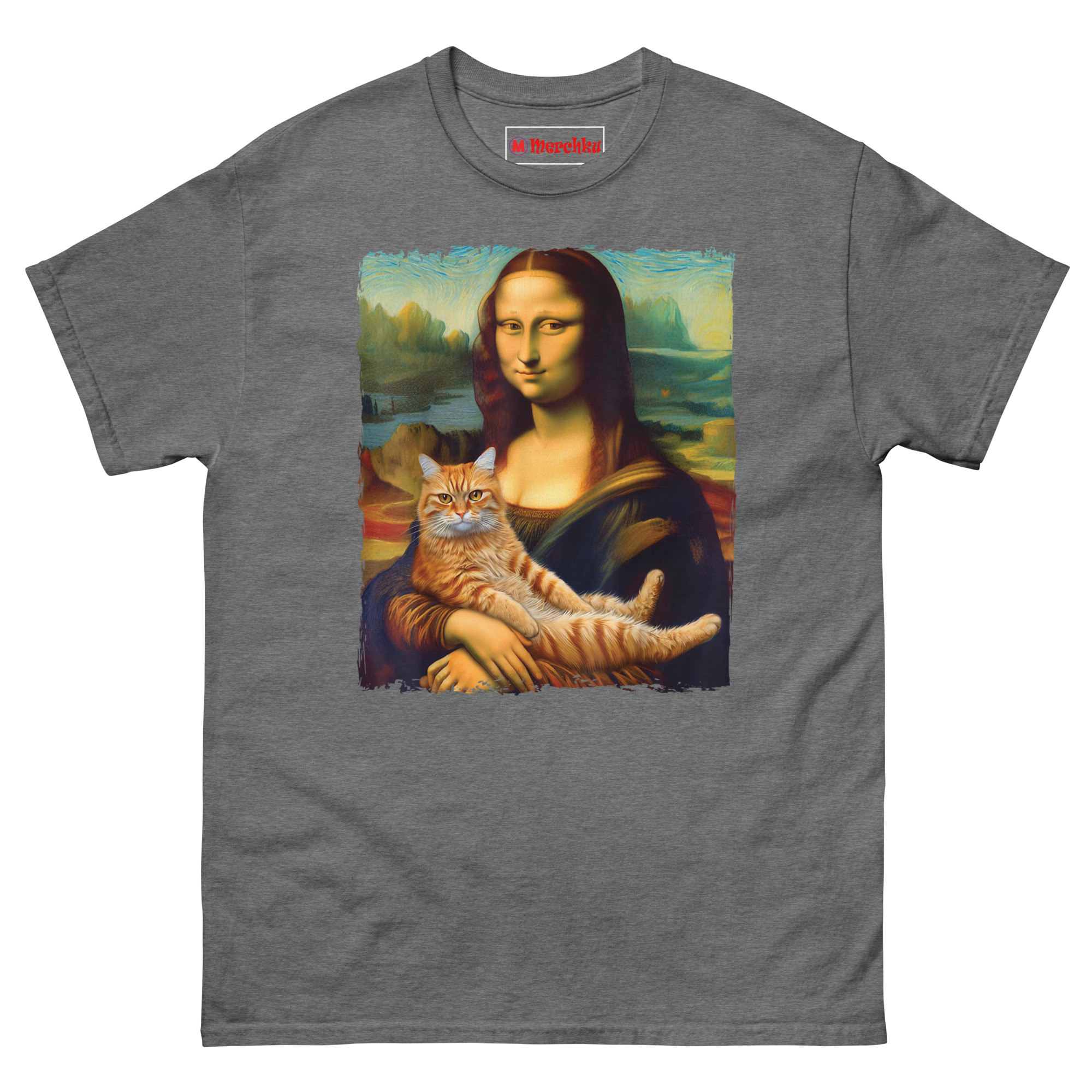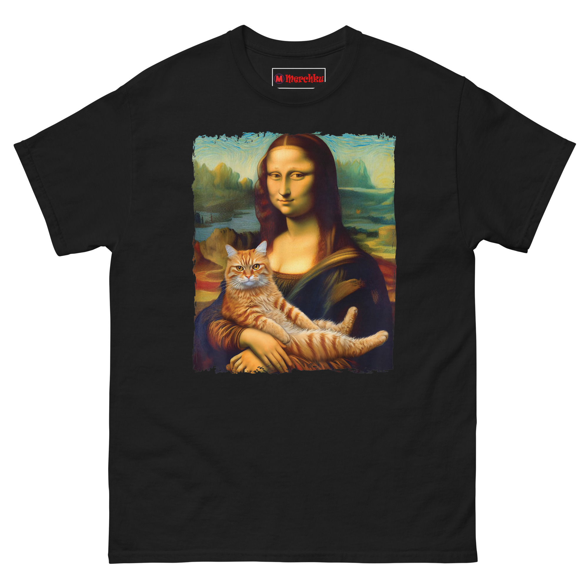 The idea for Mona Lisa Holding Cat T Shirt came from a visit to the Louvre. Standing in front of the actual Mona Lisa, surrounded by hundreds of tourists holding up phones, I started thinking about what would actually make her smile that way. The painting is famous for her enigmatic expression, half serene, half mysterious. Art historians have debated it for centuries. But the answer, I realized, is much simpler. She is smiling because she is a cat person. That thought stuck with me. We took the original painting, with its soft sfumato blending and atmospheric mountain background, and added the one thing that makes any painting better: a cat. The ginger tabby sits in her arms, relaxed and a little smug, mirroring her expression perfectly. The idea is that even a 16th-century noblewoman would have found joy in a purring lap cat. This shirt is for anyone who believes that art history and cat culture belong together.