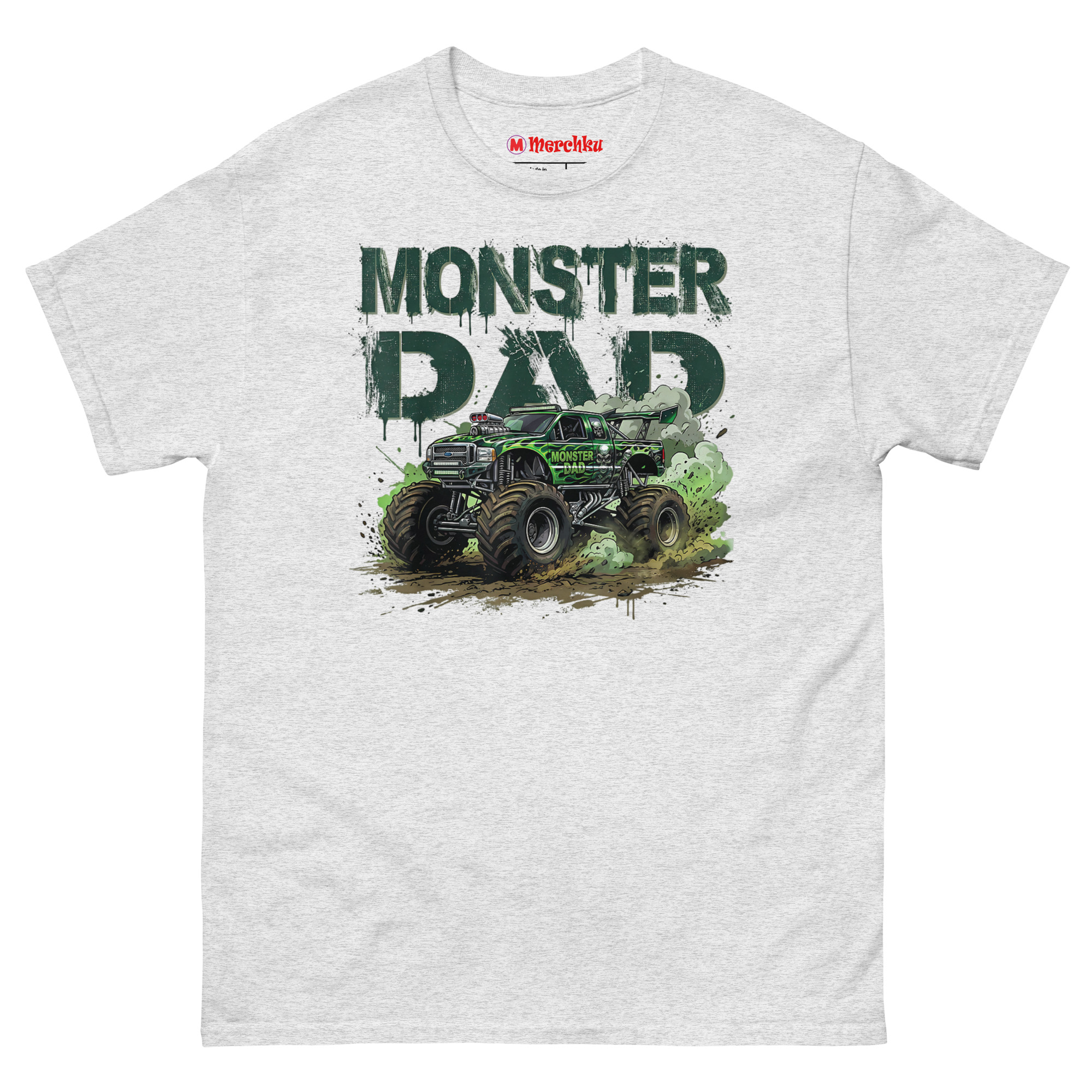 Detailed graphic of a green monster truck with large tires splattering mud under the bold green distressed text Monster Dad.