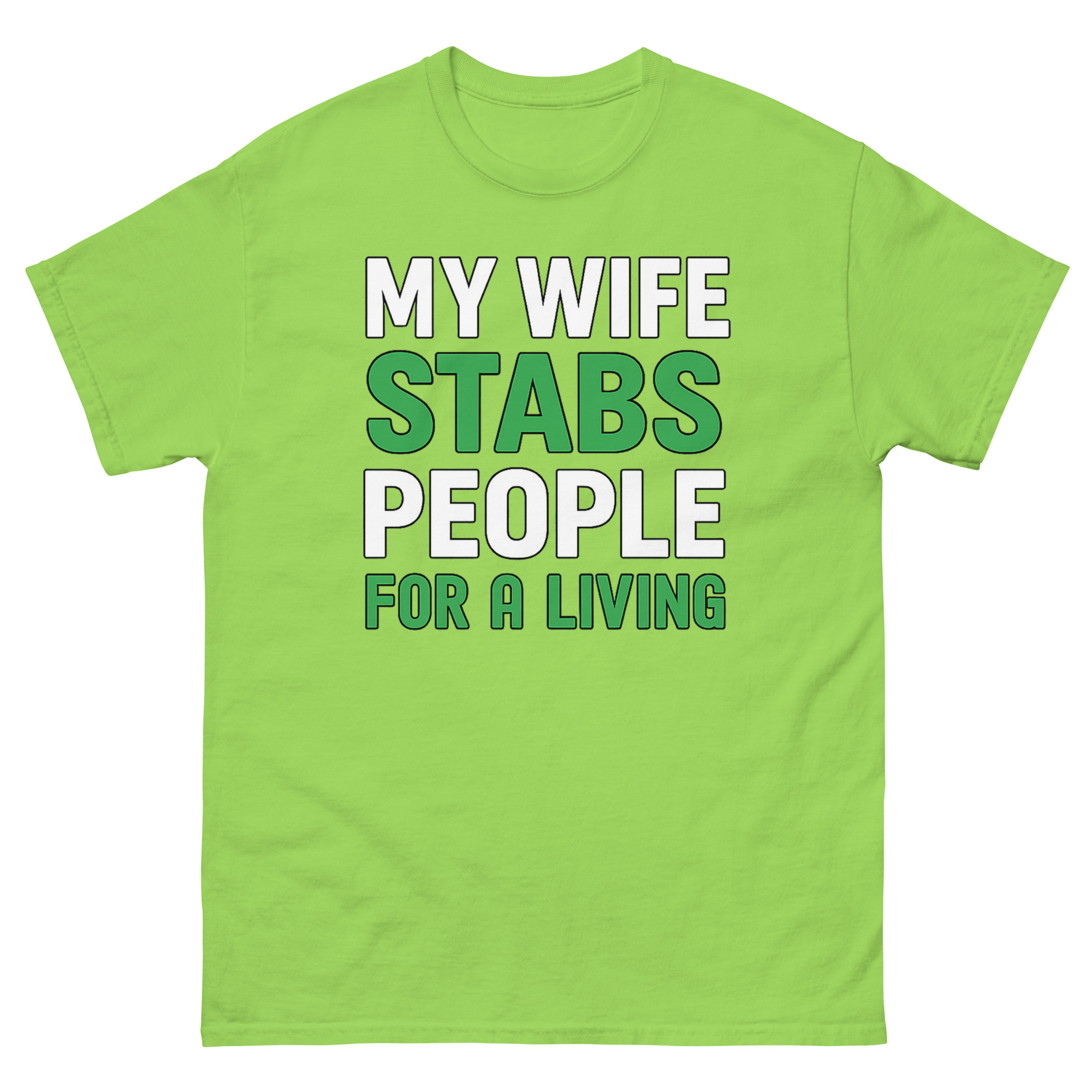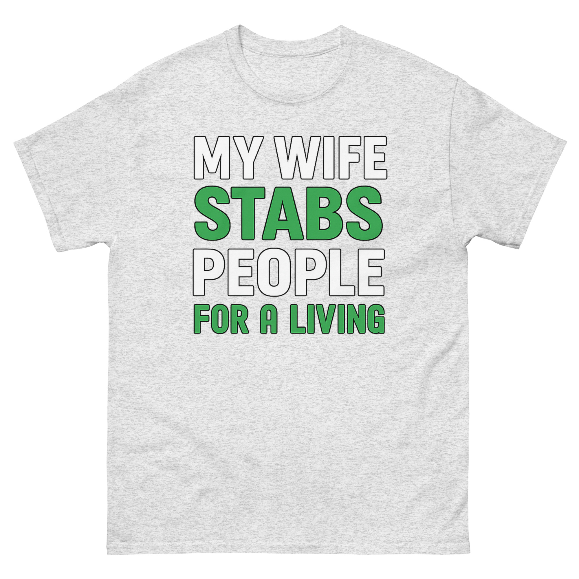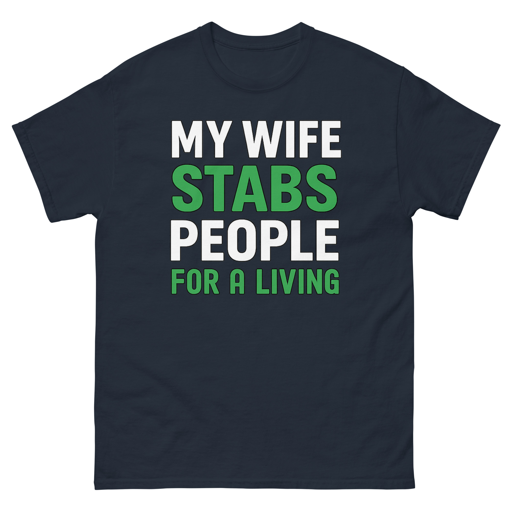 The design is clean, confident, and built for impact. Bold white text states the setup, but the key words “STABS” and “FOR A LIVING”, jump out in a crisp, grass-green. That green isn’t random; it’s a subtle nod to scrubs, healing, and the medical field. This sarcastic occupation apparel doesn’t need illustrations or gimmicks. The typography does all the work. It’s medical humor clothing for the partner who knows that “stabbing” people, in this context, means drawing blood, placing IVs, creating art, or relieving pain.