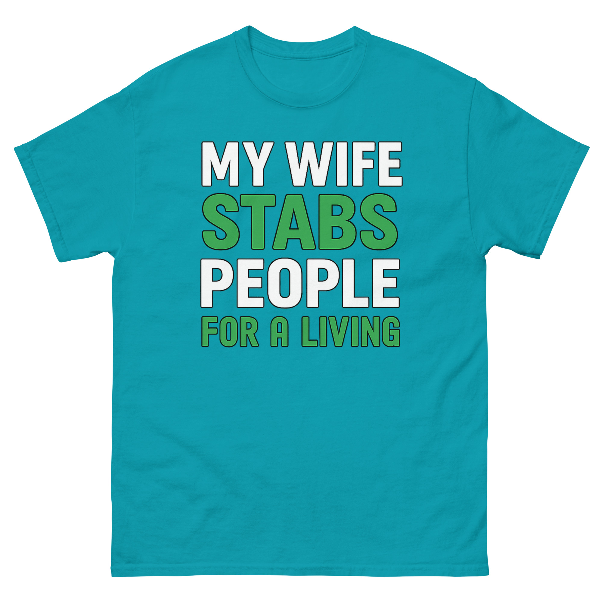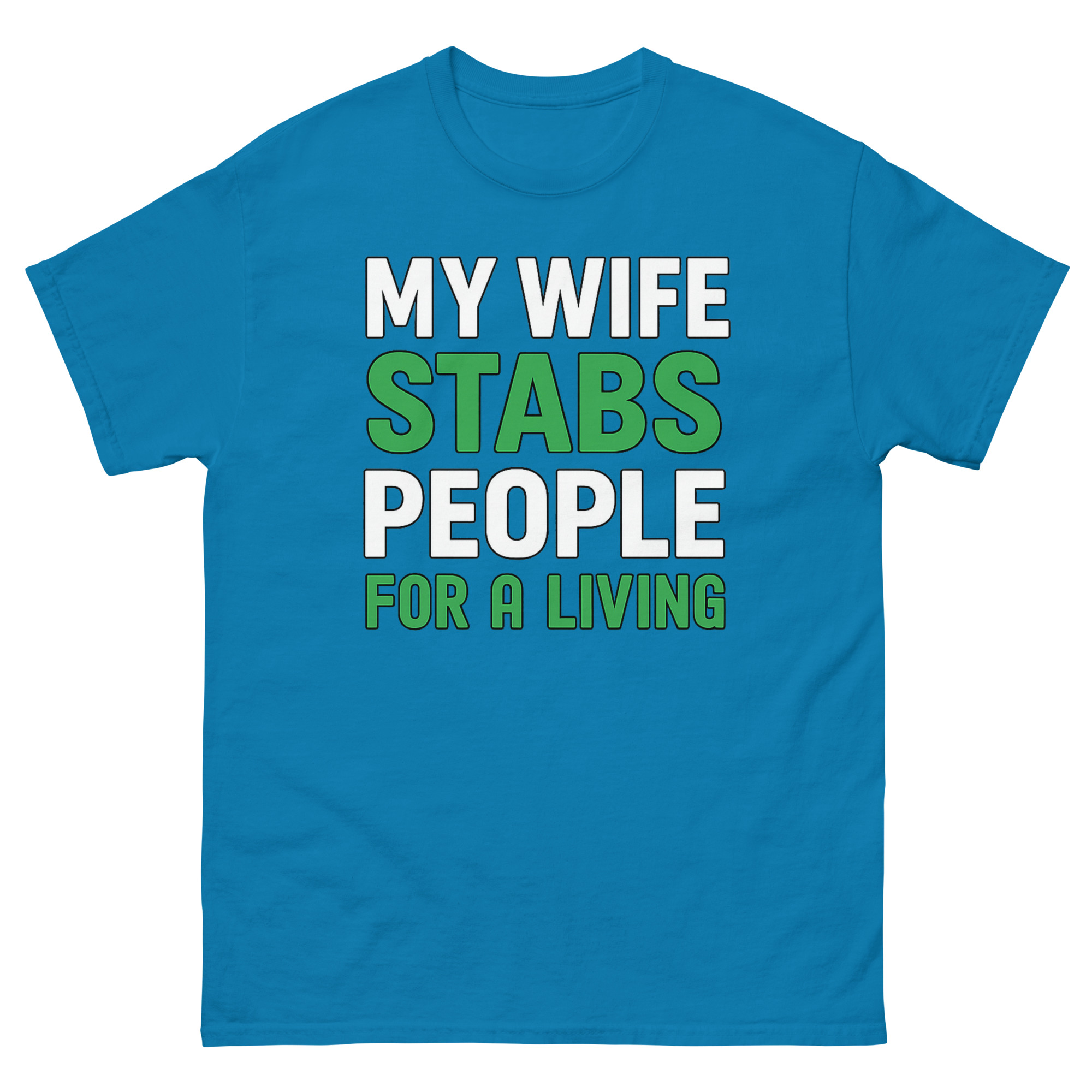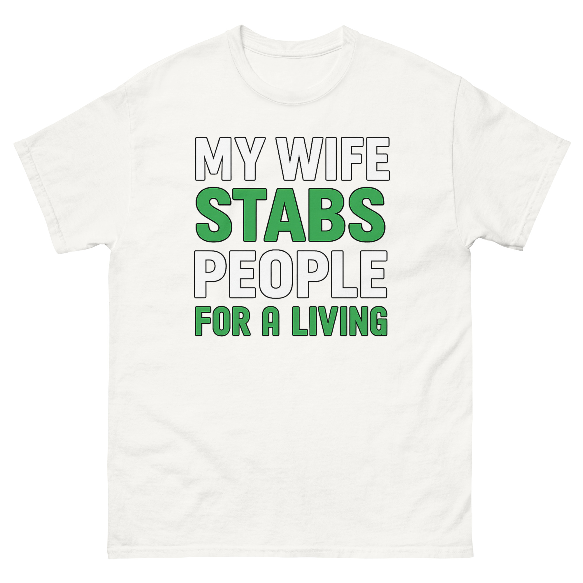 The design is clean, confident, and built for impact. Bold white text states the setup, but the key words “STABS” and “FOR A LIVING”, jump out in a crisp, grass-green. That green isn’t random; it’s a subtle nod to scrubs, healing, and the medical field. This sarcastic occupation apparel doesn’t need illustrations or gimmicks. The typography does all the work. It’s medical humor clothing for the partner who knows that “stabbing” people, in this context, means drawing blood, placing IVs, creating art, or relieving pain.
