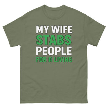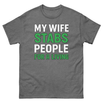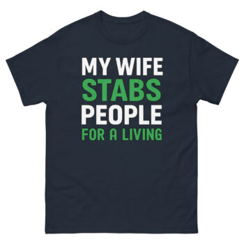 This is a bold, graphic tee that turns a partner’s specialized medical skill into an ironic badge of honor. The My Wife Stabs People For a Living T Shirt uses clean typography with green-accented punchlines. It’s the cool healthcare professional spouse gift for husbands of phlebotomists, nurses, tattoo artists, and acupuncturists.