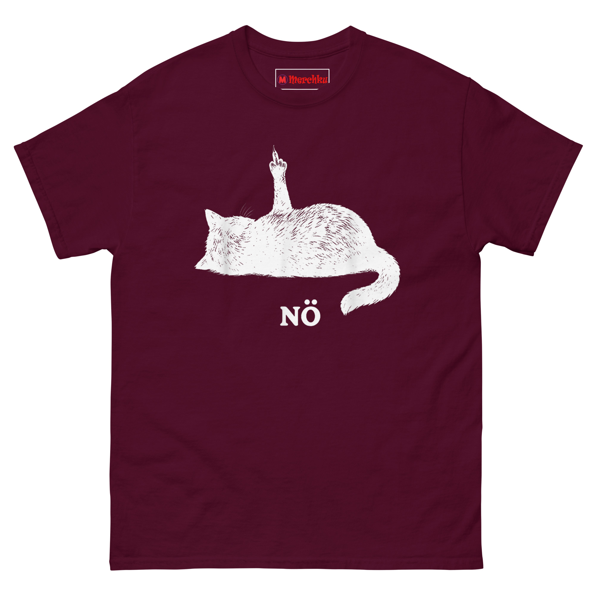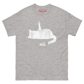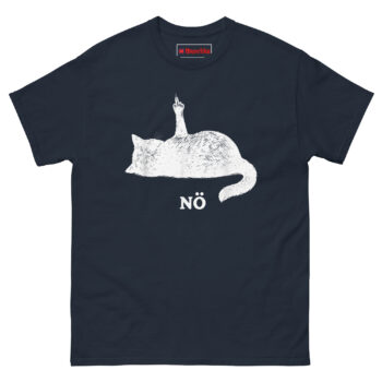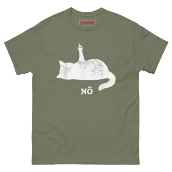 That image stuck with us. We thought about how cats are the ultimate introverts. They don’t care about your plans, your deadlines, or your social obligations. They just exist, completely unbothered. So we created a visual representation of that energy. The cat lies flat, face hidden, completely committed to doing nothing. But from its hindquarters, a human hand extends, flipping the bird to anyone who dares make a request. Below it, the word “NÖ” sits in bold serif font, the German slang for “no,” made extra firm with that umlaut. It’s the perfect sarcastic grumpy cat graphic tee for days when you just can’t.