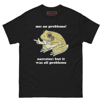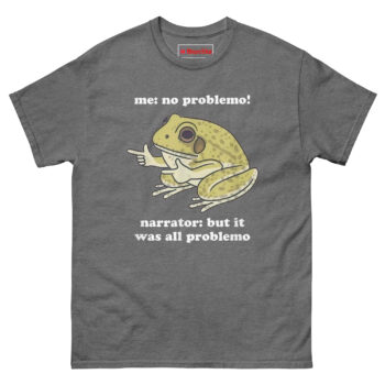 The No Problemo Frog Shirt captures that moment when nothing is fine but you say it is anyway. Made from 100% cotton, this Funny Meme Finger Guns Graphic Tee features a hand-drawn frog doing finger guns with the text “me: no problemo!” above and “narrator: but it was all problemo” below. It’s a Humor Birthday Gift for Stressed Best Friend and Frog Lovers who appreciate ironic humor more than toxic positivity. No fake calm here. Just a soft shirt that gets the joke.